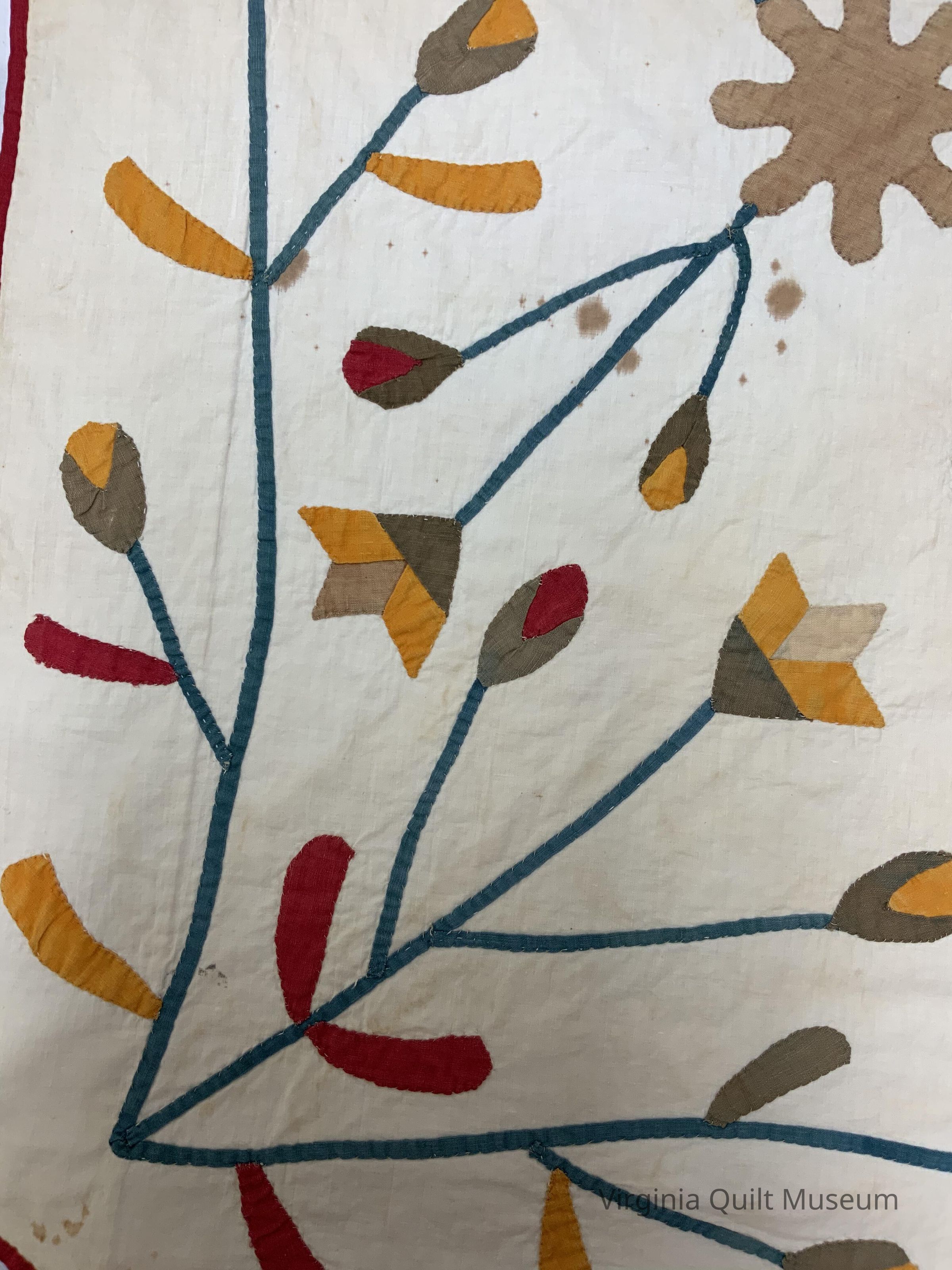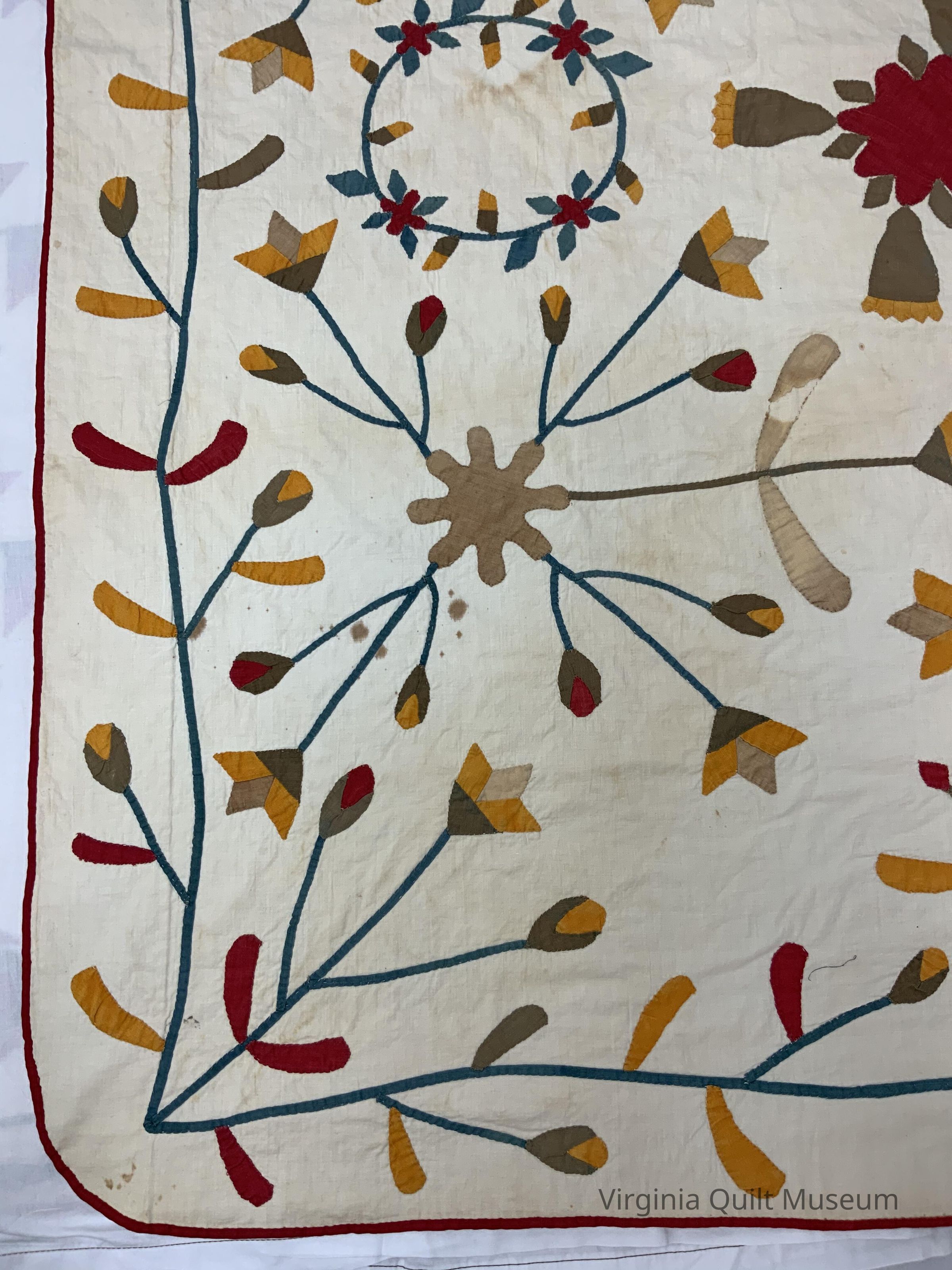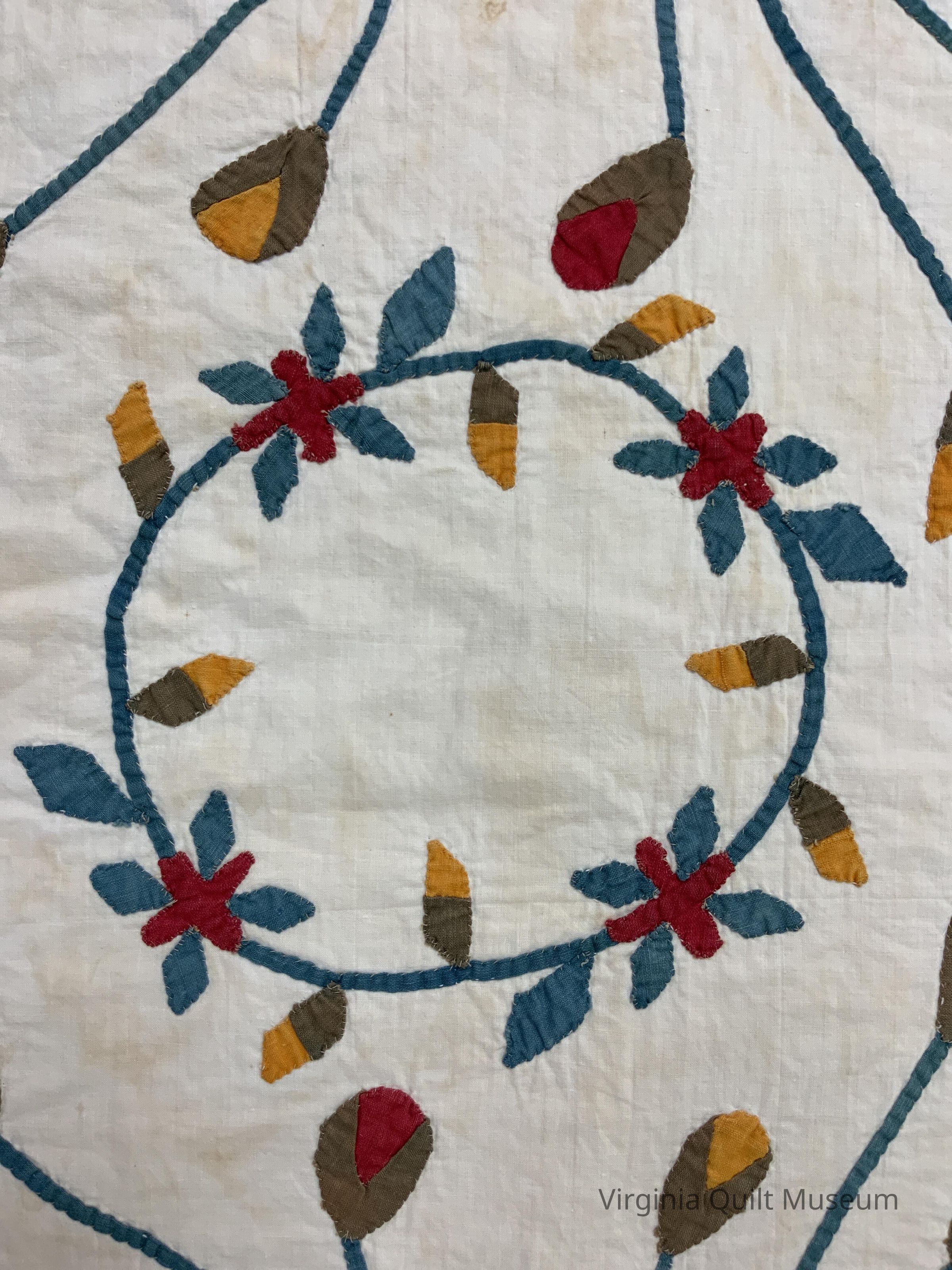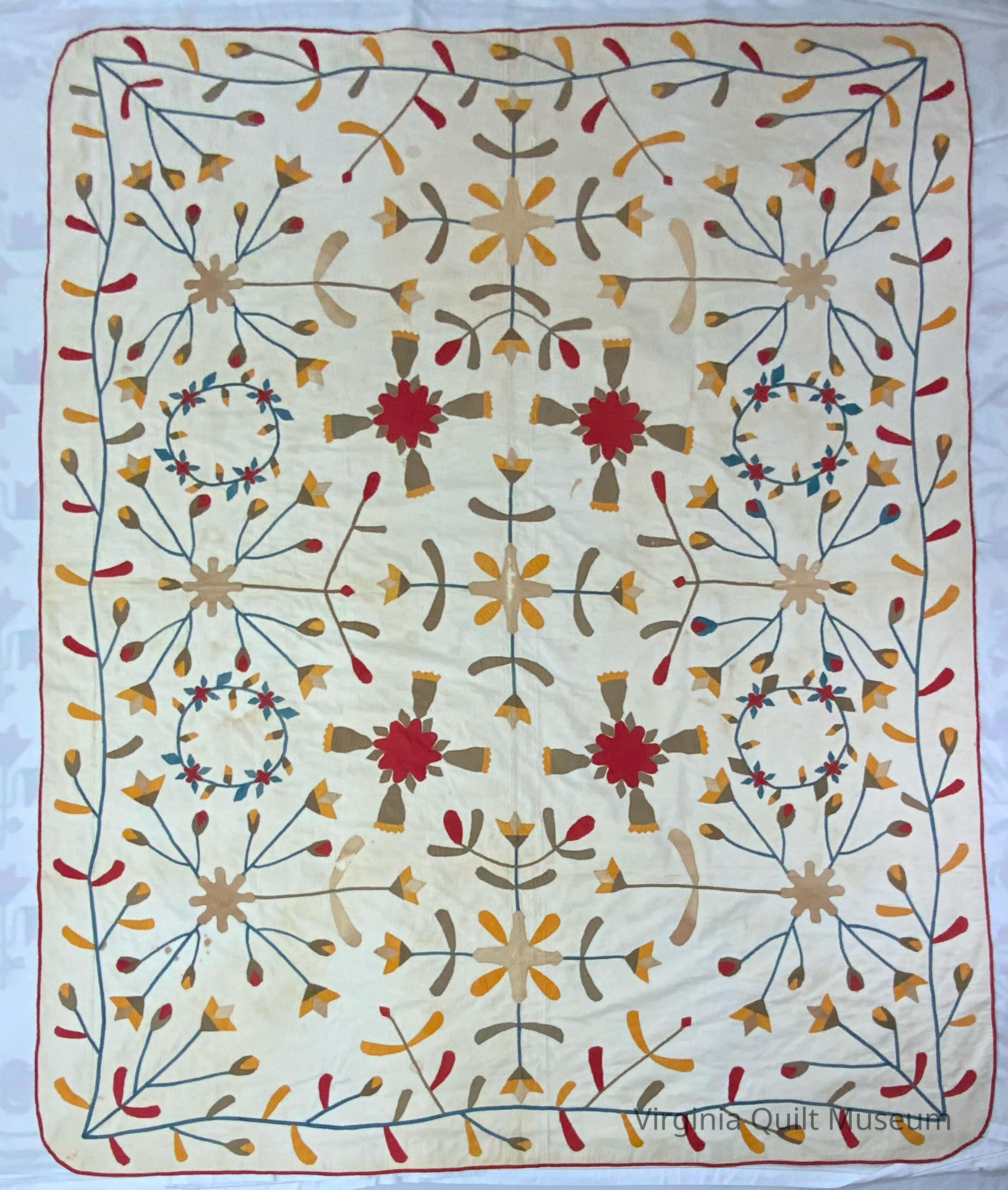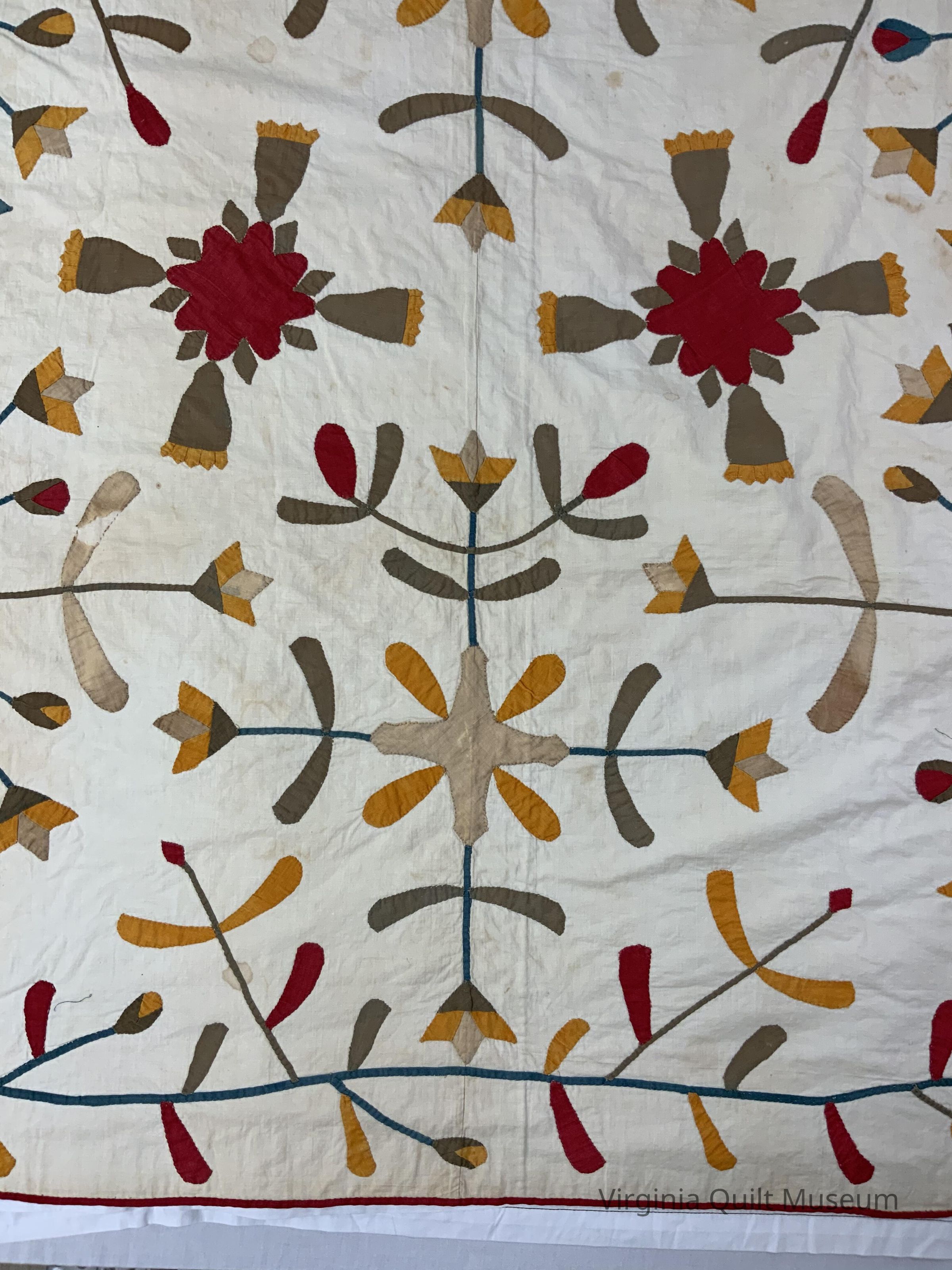 This quilt was made circa 1865 by an unknown creator. The location is unknown, but the style is very much in the vein of the Mid-Atlantic region - this was possibly made in North Carolina. This quilt is an example of folk art which is art produced by artisans in cultural isolation; folk artists usually are self-taught or untrained and use simple forms with bold colors.Collection