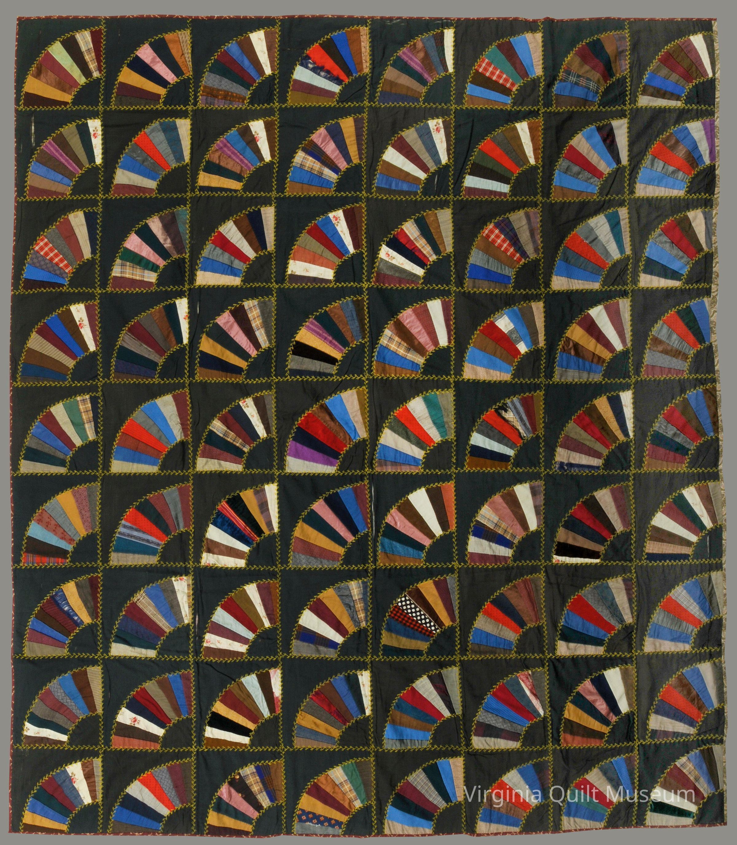 9 by 8 blocks with 9 inch square blocks of multiple colors. Pieced fans are all facing the same direction with a black background. There is no quilting, yet the embroidery is a briar stitch. It is hand pieced and hand embroidered.Context