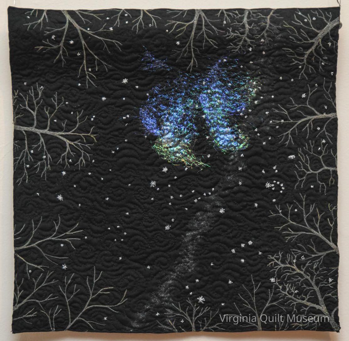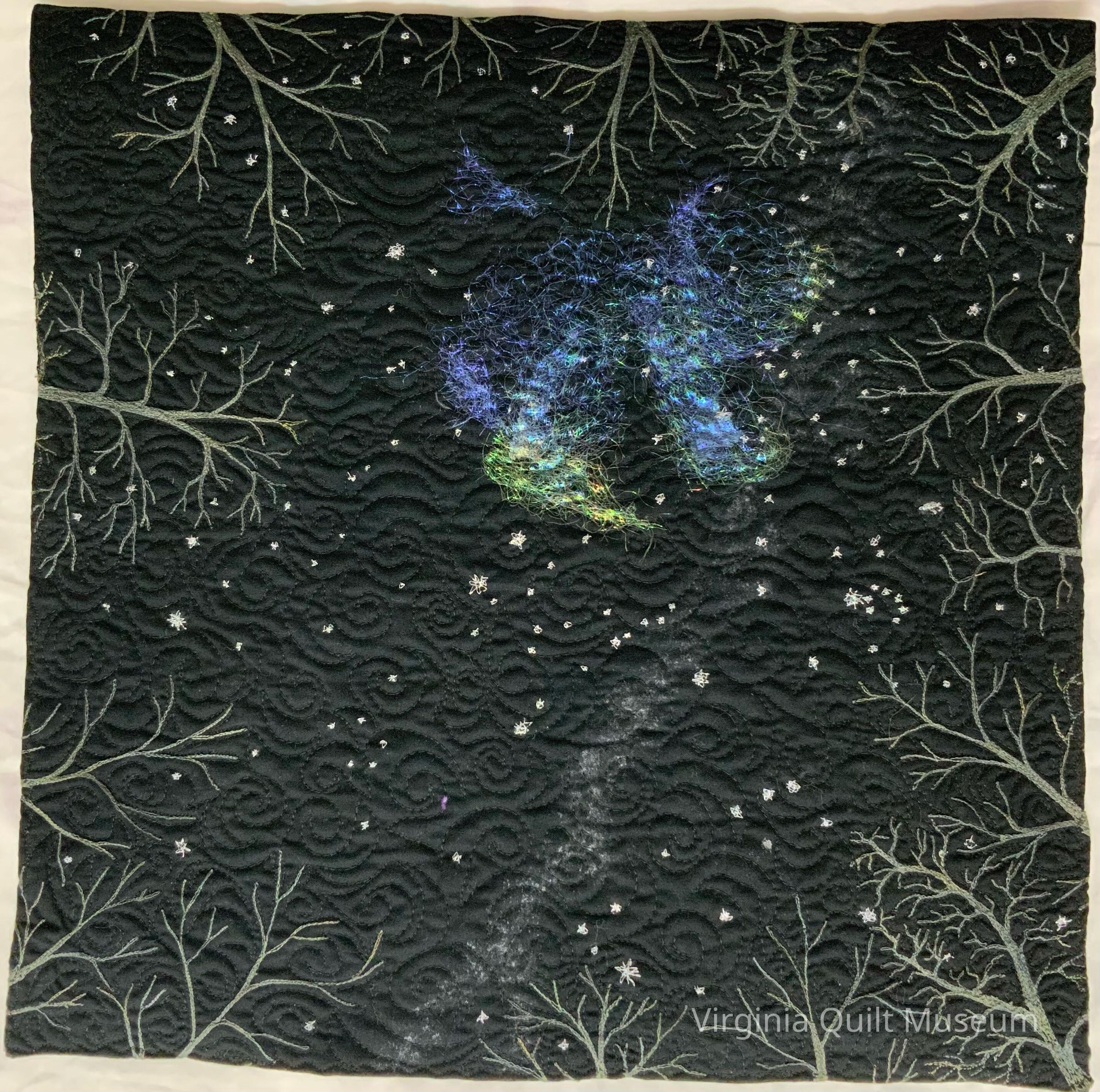 Quilted depiction of the winter night sky with constellations. This is 18" square quilt made using cottons, Angelina fiber, and metallic acrylic paint. It uses blacks, silver and purple for the colors.Context