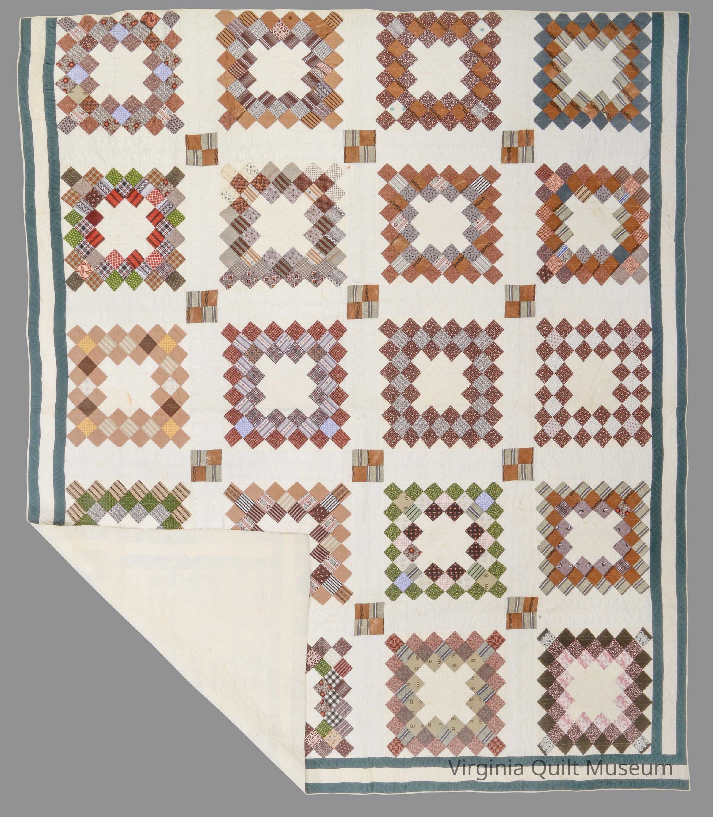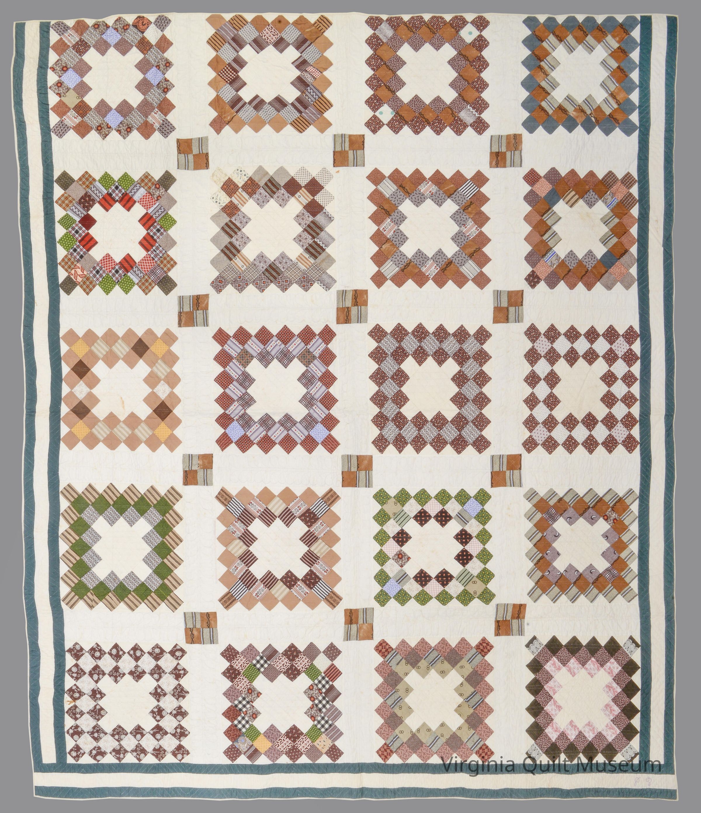 This 20 block quilt uses multi-colored scraps to create the blocks. Each block is set with cream colored sashing with 4 patch posts. There is a triple border added to three sides. It measures about 4.5'' wide and uses a green, white, green color choice.