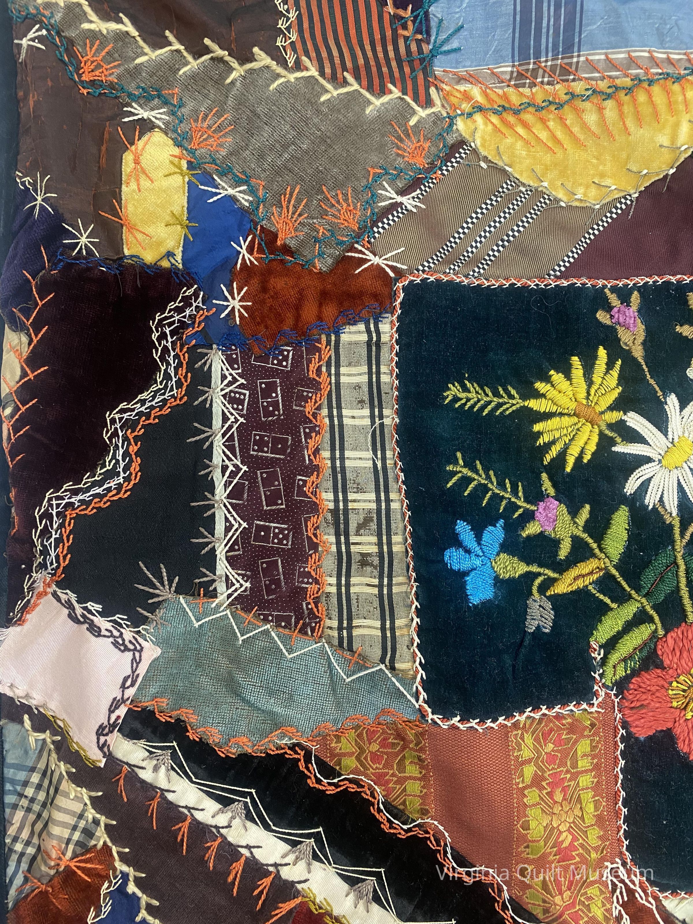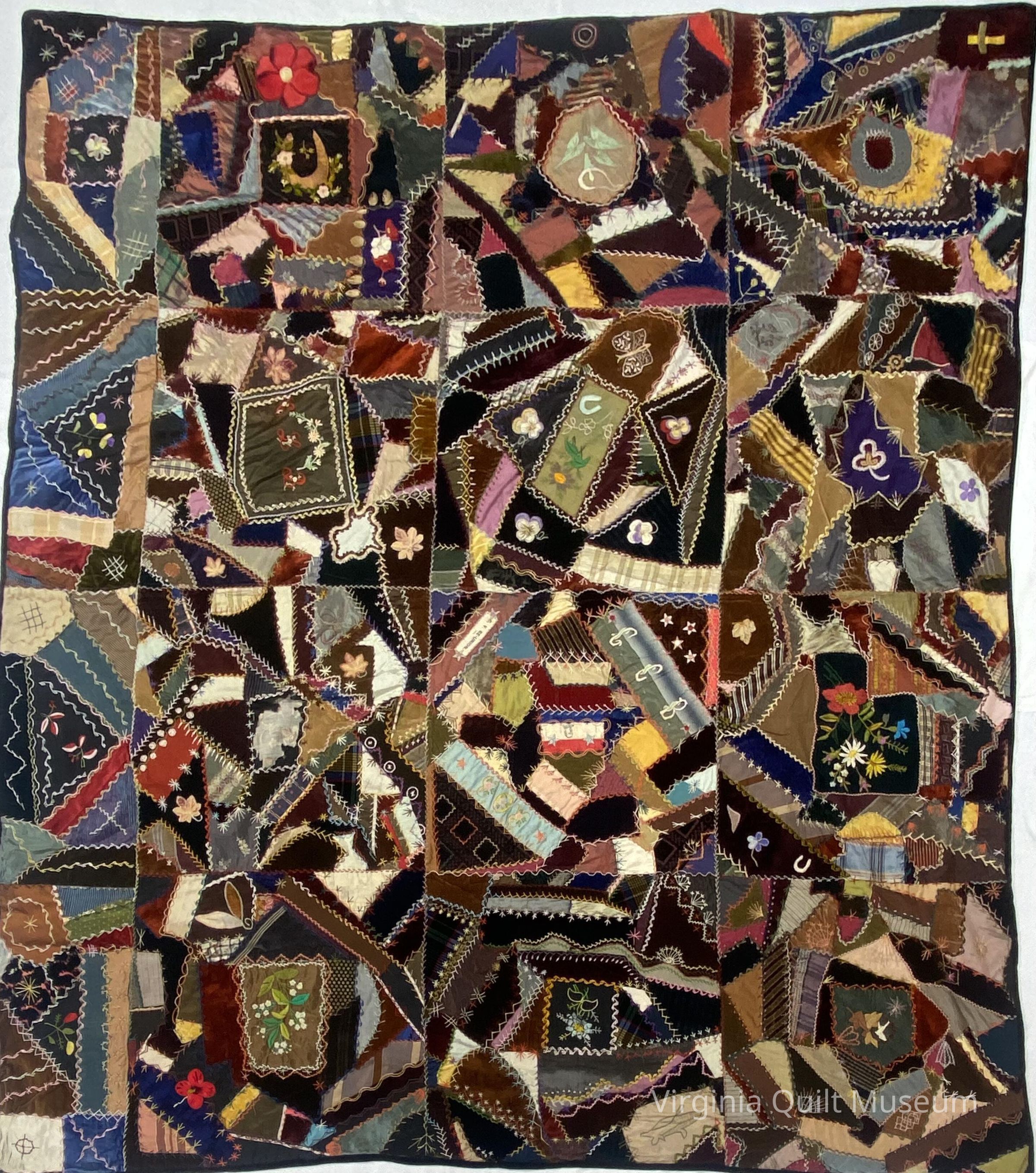 19th century crazy quilt with Confederate Veteran Reunion ribbon and campaign item of Grover Cleveland.Context