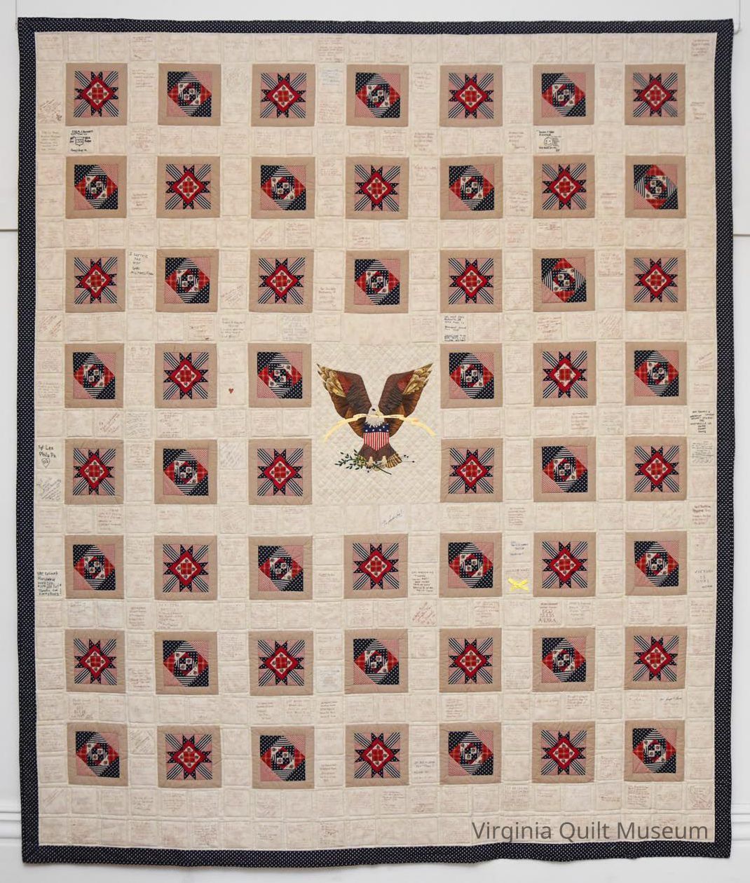 Between pieced blocks are signature blocks of plain-dyed tan fabric approximately 4 1/8" square, which is satin stitched by machine in like color onto a larger block.  Under the eagle block are the signatures of Dick Cheney, Secretary of Defense; Chairman of Joint Chief of staff Colin L. Powell; Gen. H. Norman Schwarzkopf and U.S. Senator John Warner. The remainder of the blocks are messages written by men and women based in Virginia who served during the Desert Storm conflict. The quilting in these blocks is an outline near satin stitch. Above the eagle is a blank block awaiting the signature of George Bush, President of the United States.