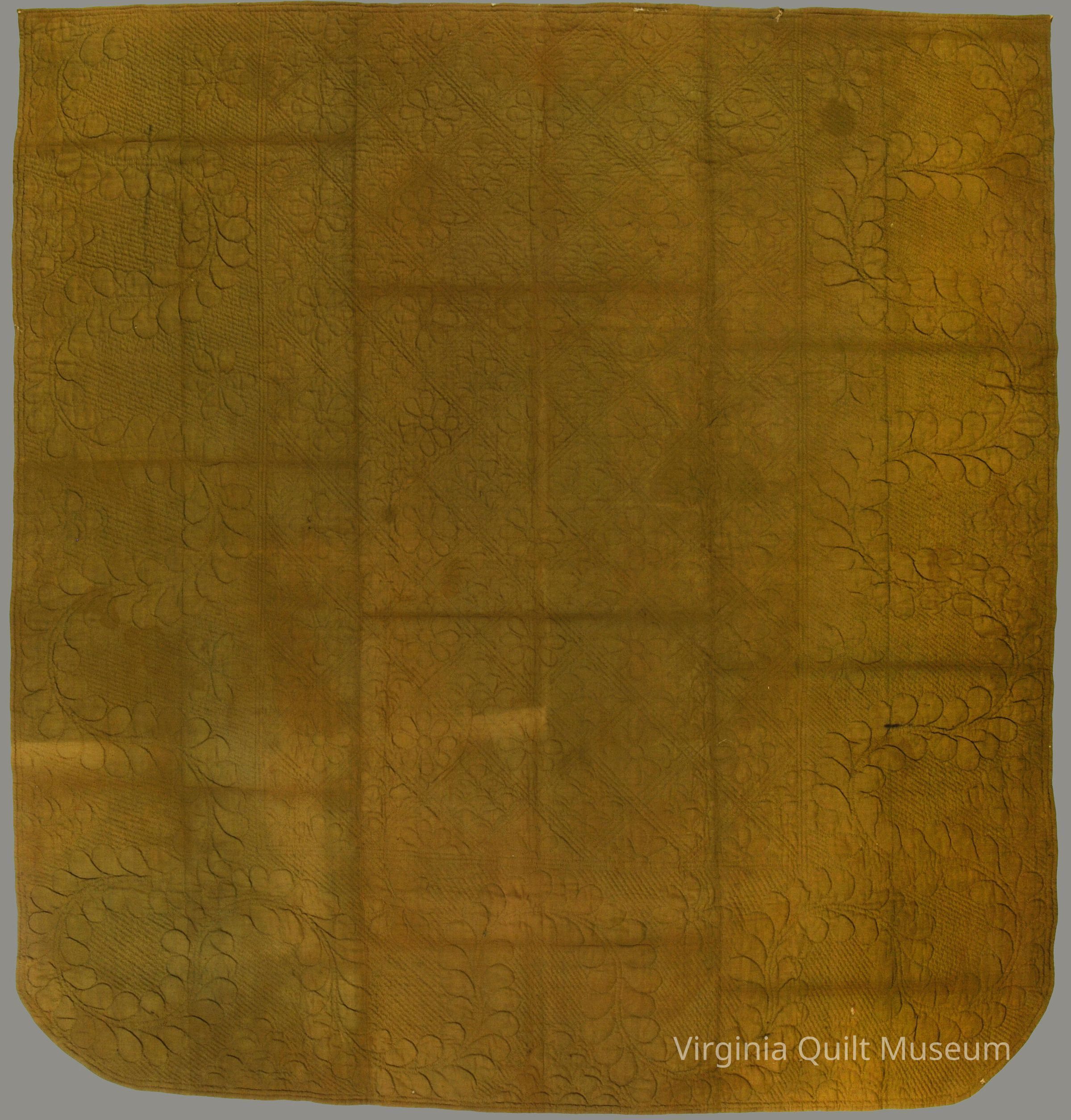 Homespun wool whole cloth quilt. The center is quilted with a diamond trellis and floral designs, feathers, and clam shell. It has a quilted border on three sides and rounded bottom corner. It is very heavily quilted. It is hand finished.Context