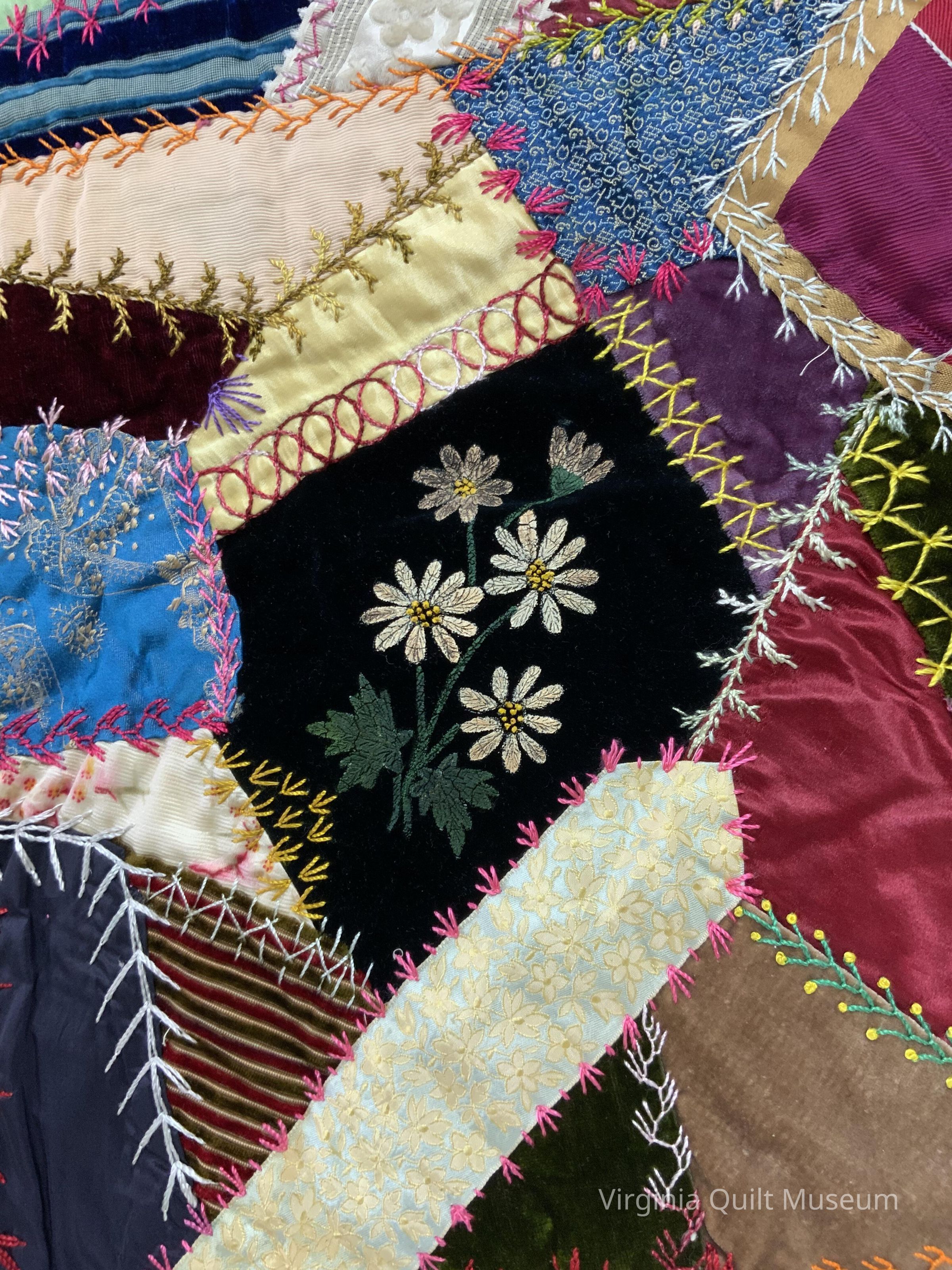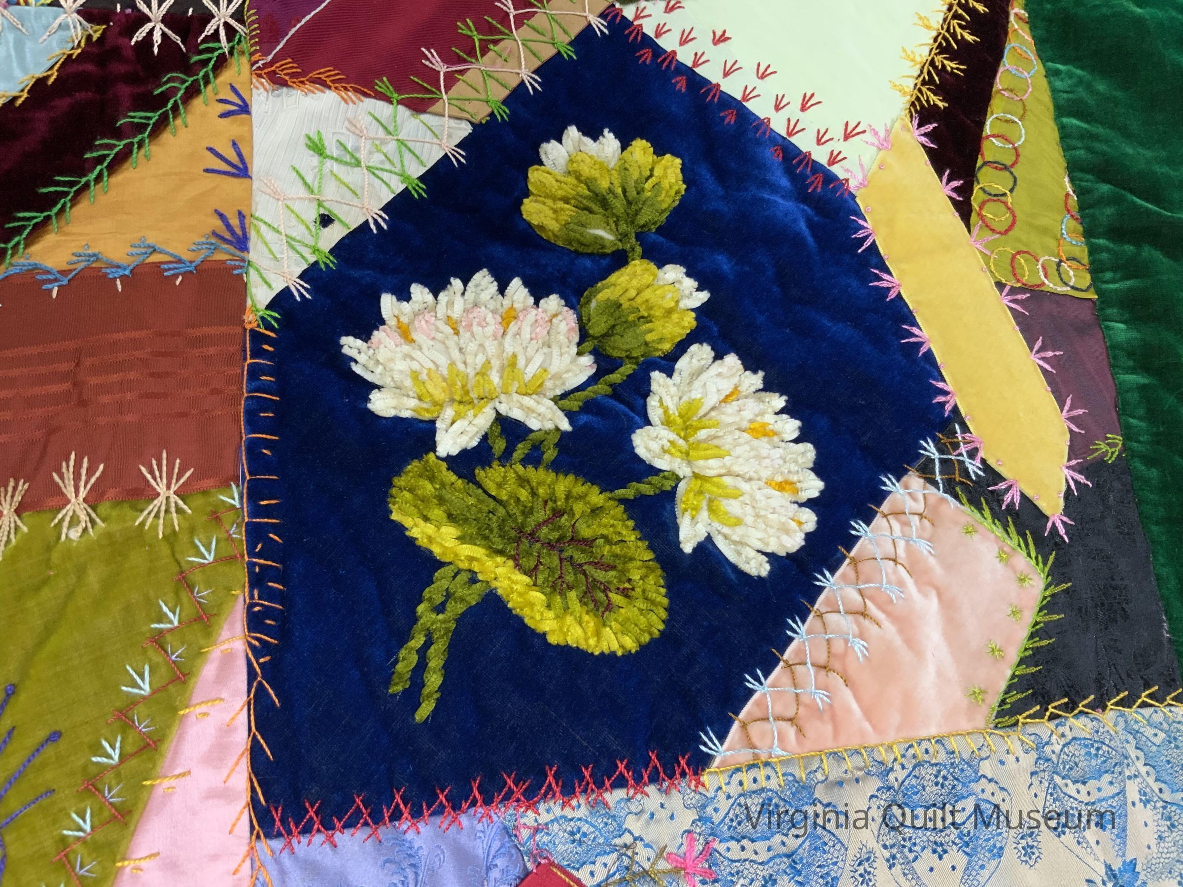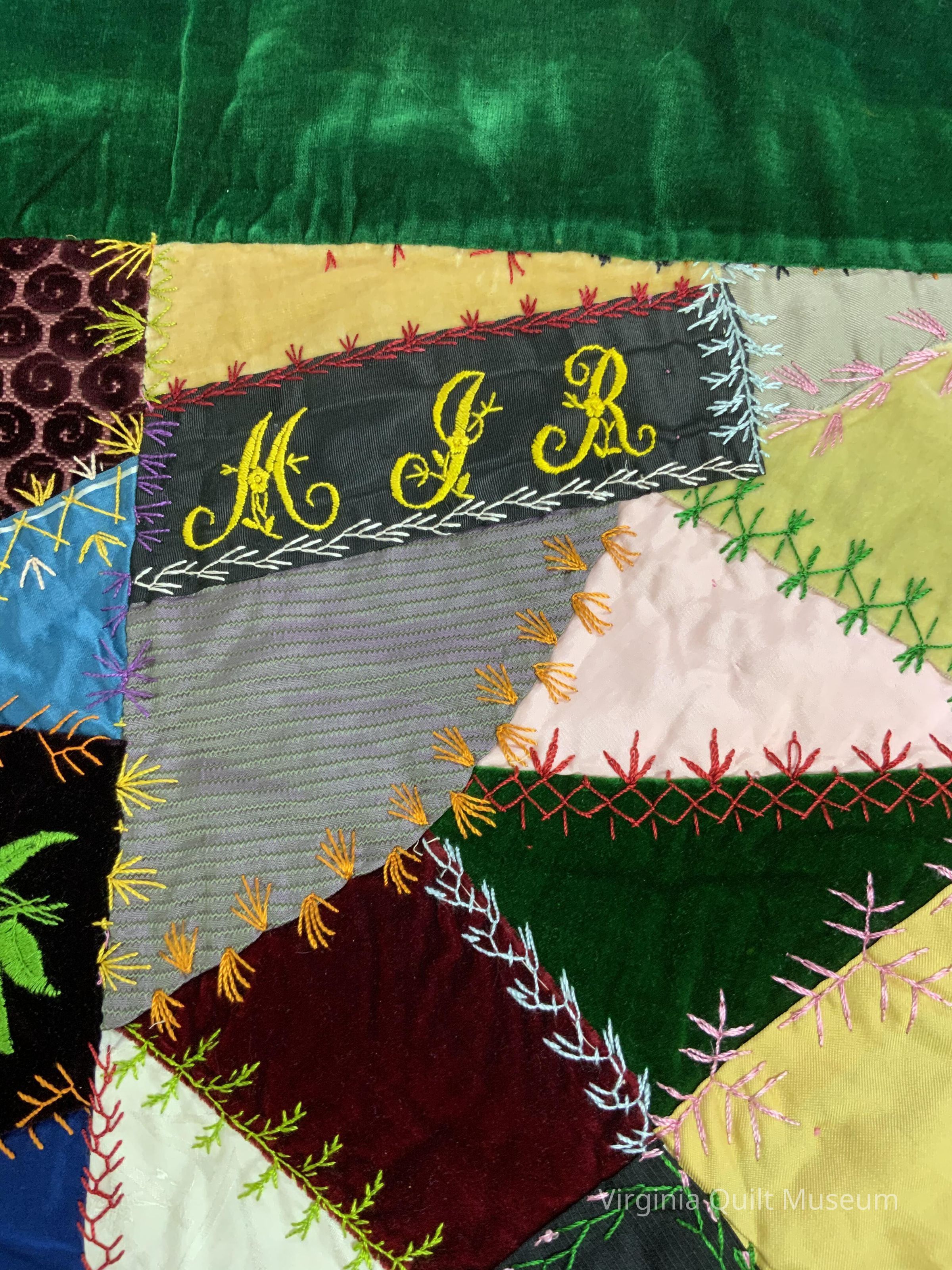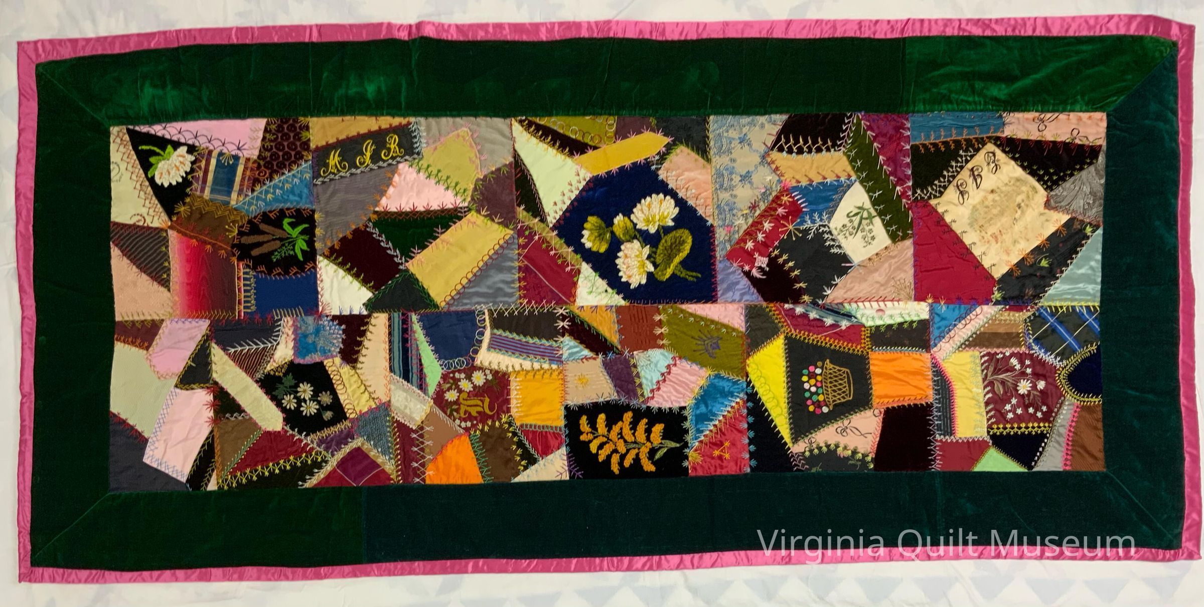 Crazy Quilt with green velvet border and pink satin backing.Context