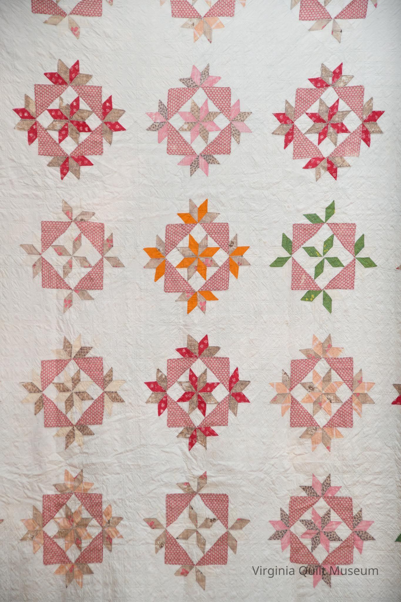 Hand pieced and hand quilted quilt with a block pattern the features various colored 8-pointed stars.Context