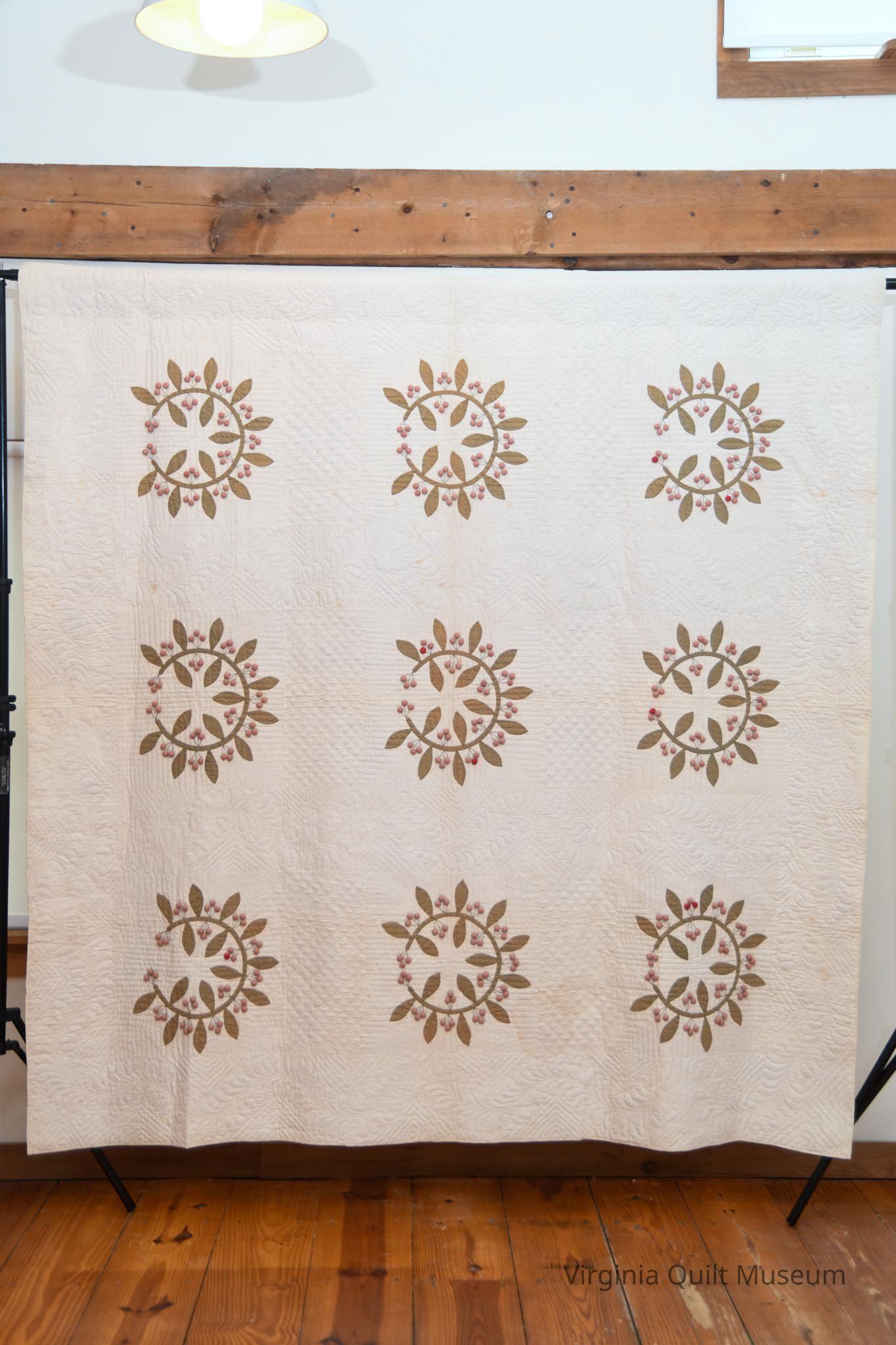 White wholecloth design, 9 wreaths, 1 per block (3 blocks by 3 blocks). 16'' squares with 8'' border. Each wreath has 10 leaves outside, 5 inside, and 15 clumps of cherries. Chain stitch embroidery connects the cherries to the wreath.