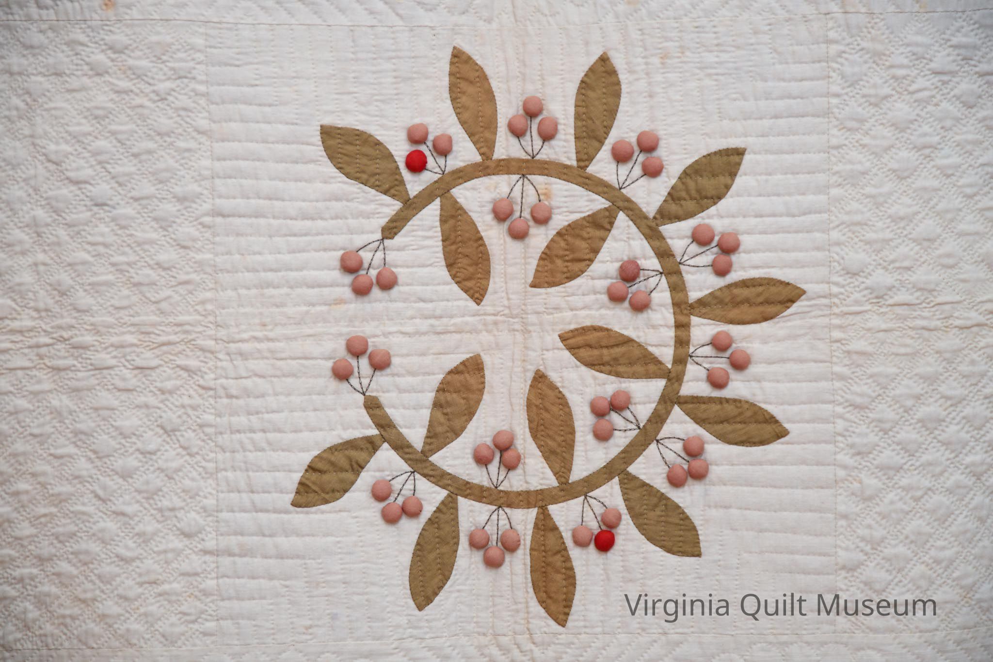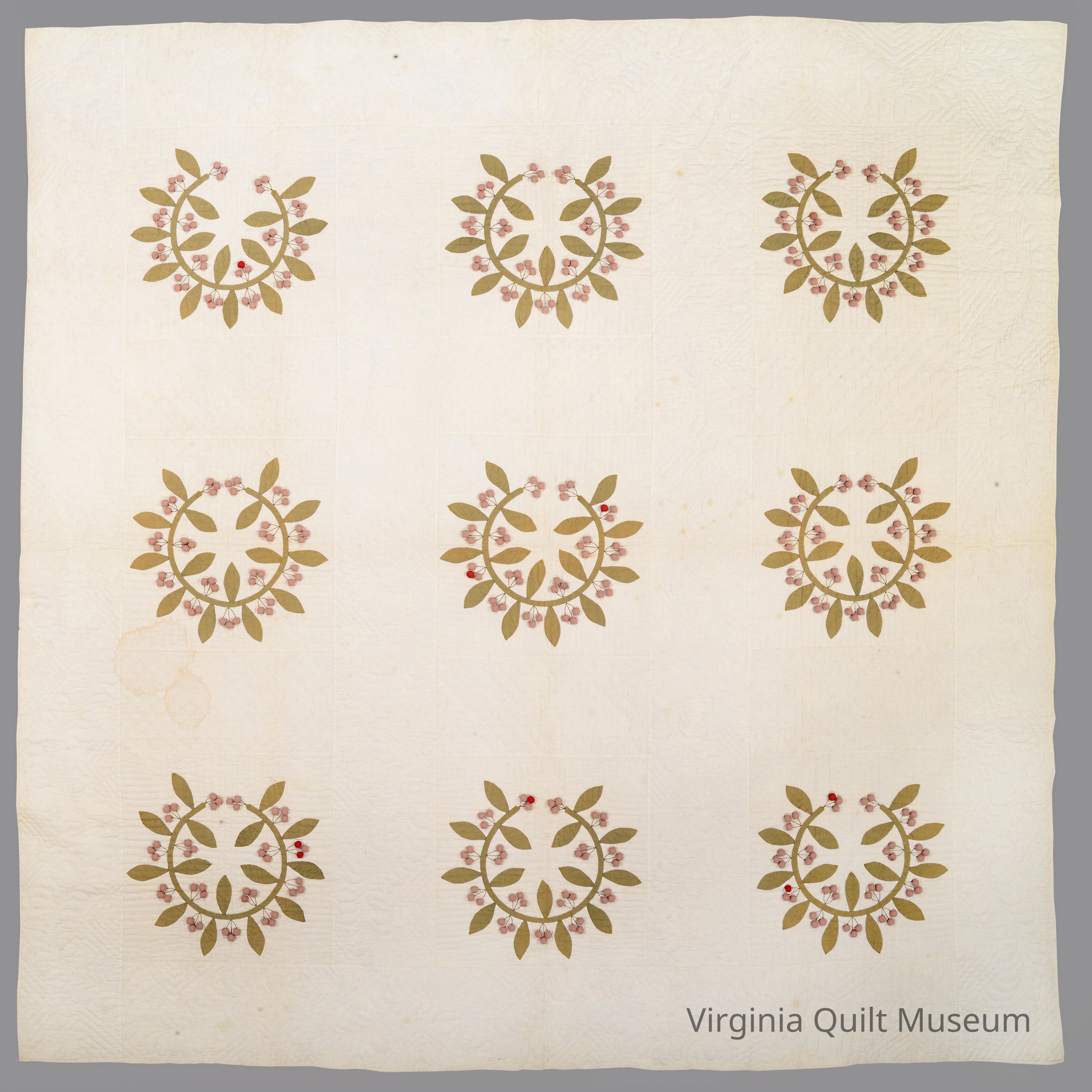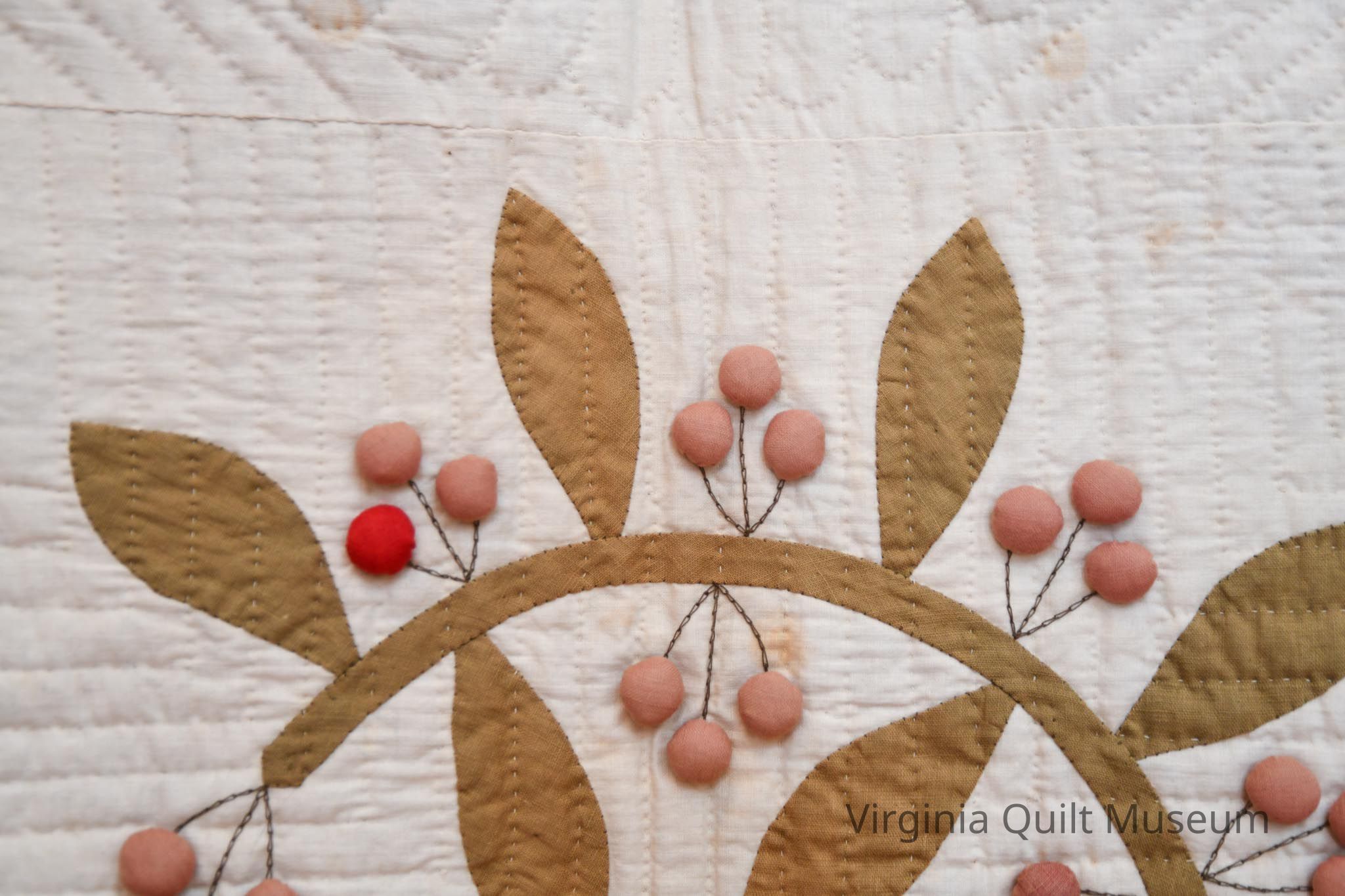 This is what we believe to be an original open-ended wreath design, possibly an original whole cloth design. The green wreaths are in the shape of a horse shoe with leaves attached and pink stuffed cherries.