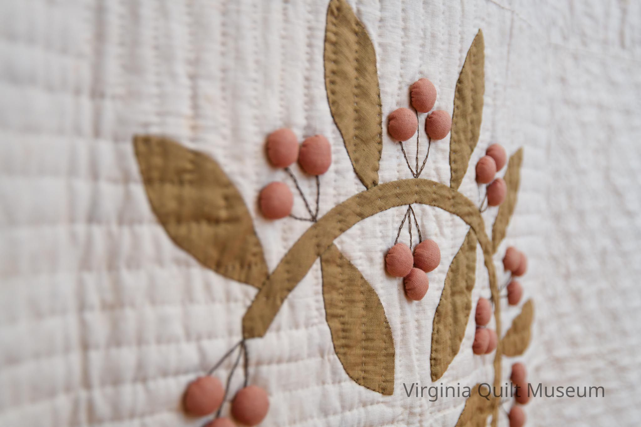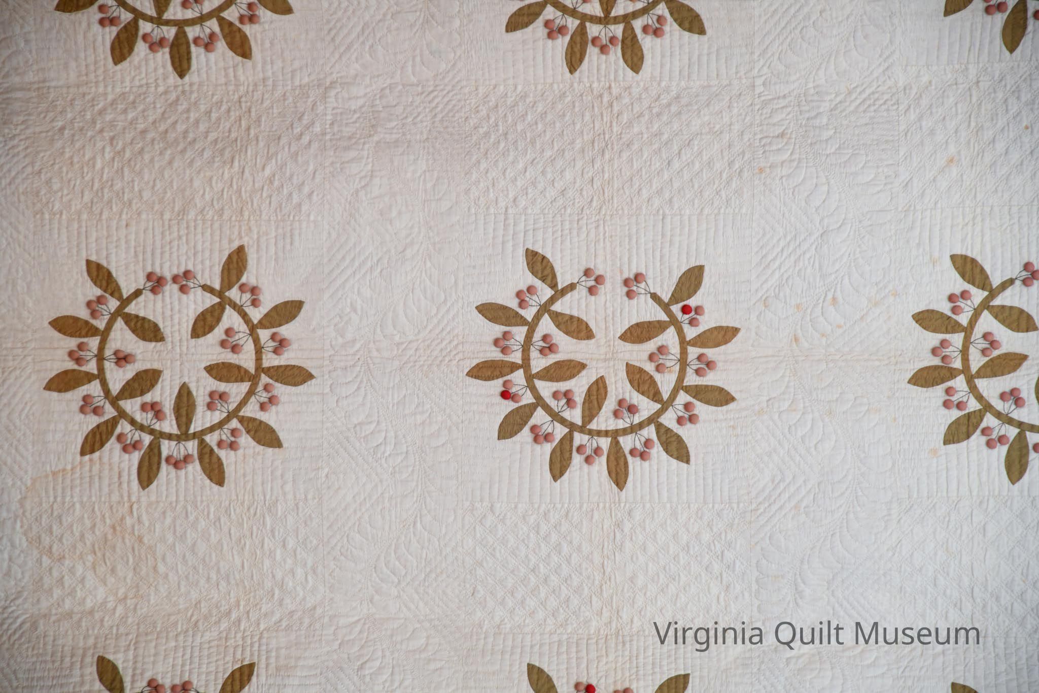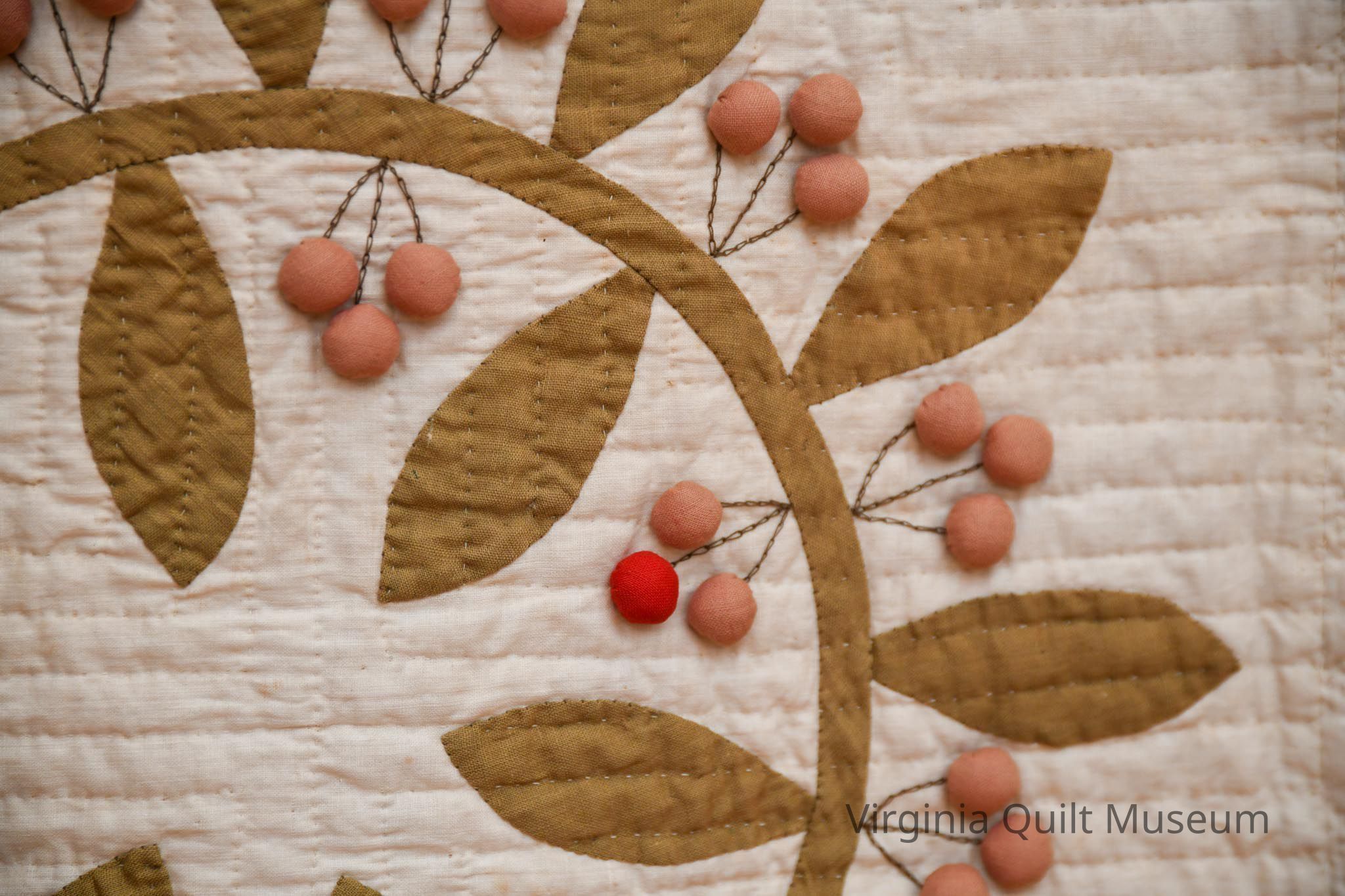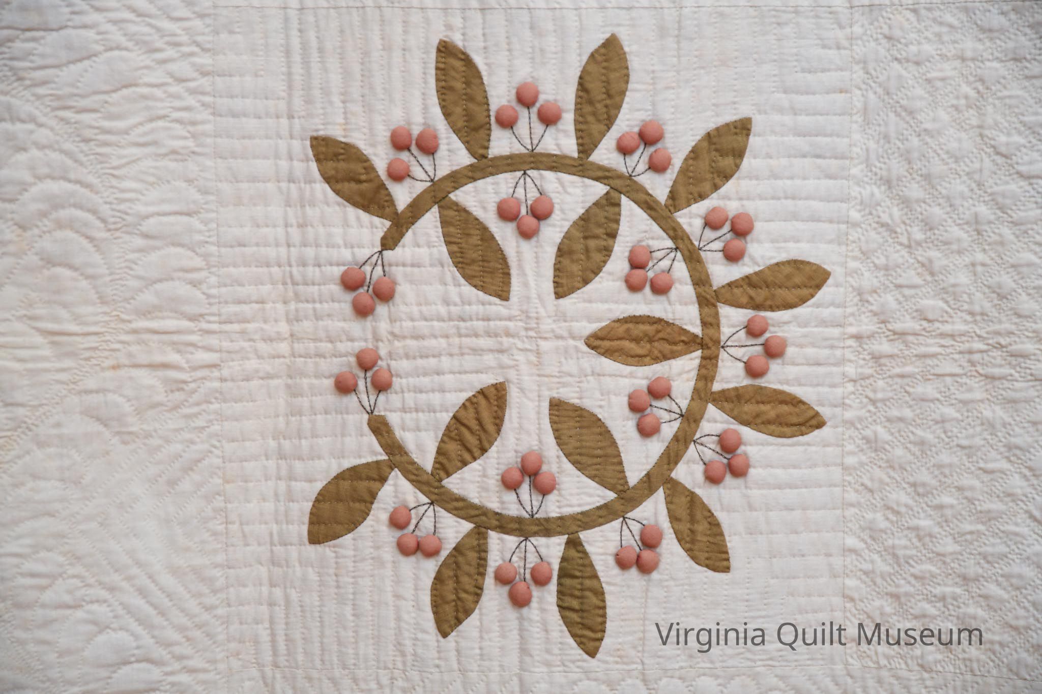 This is what we believe to be an original open-ended wreath design, possibly an original whole cloth design. The green wreaths are in the shape of a horse shoe with leaves attached and pink stuffed cherries.