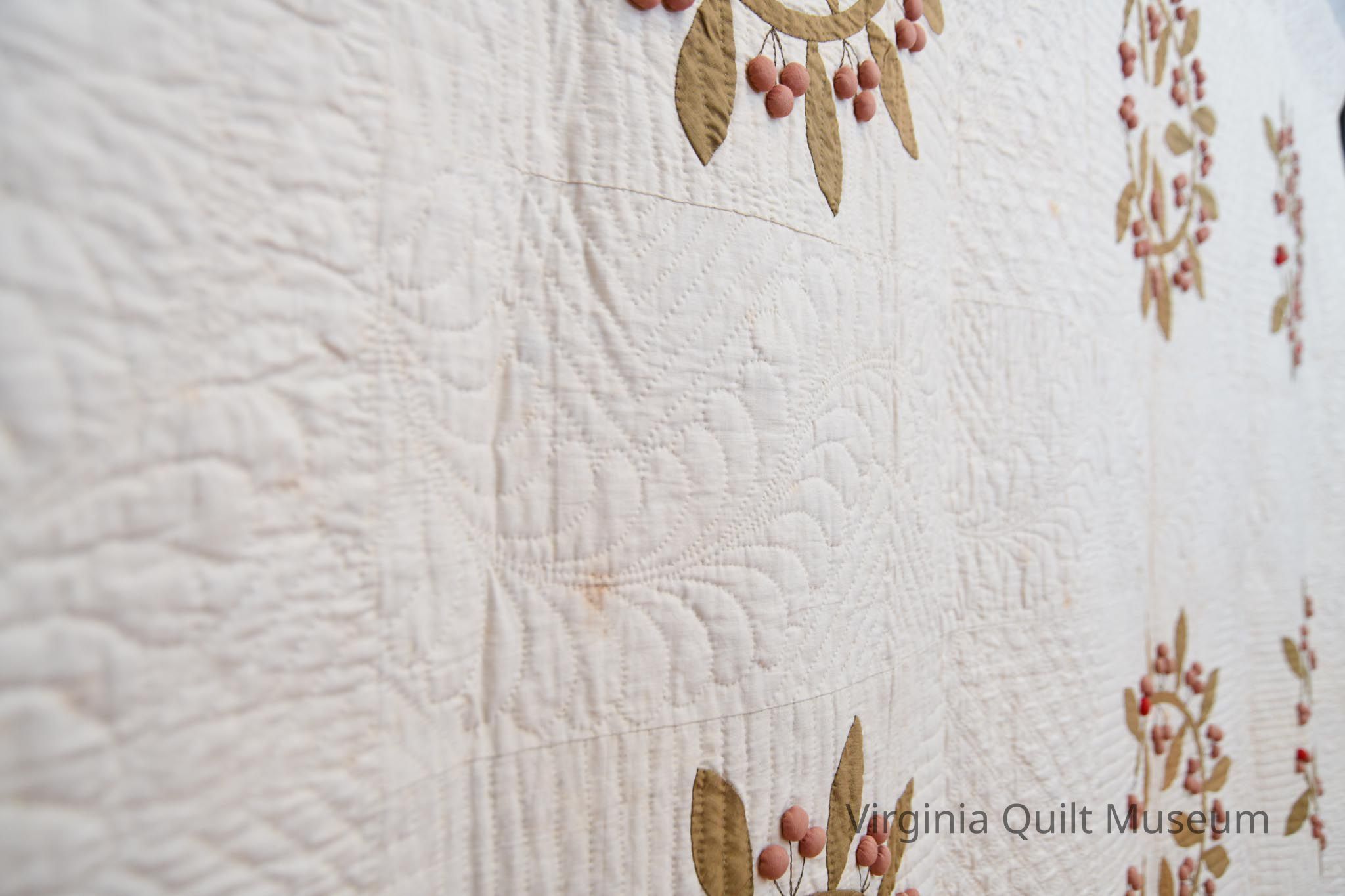 There is little to no batting. It was hand-quilted on appliqué blocks. The quilting on the border is feather in the blocks and crossed in between each block. Double crosshatching on the horizontal sashing and feather swags with straight lines on the vertical sashing.Context