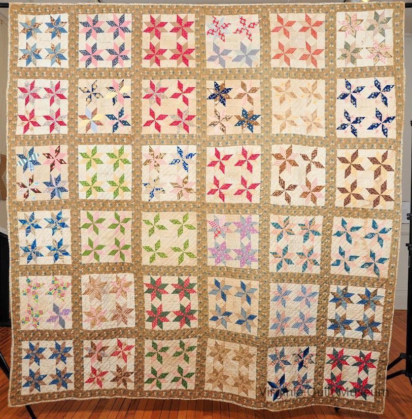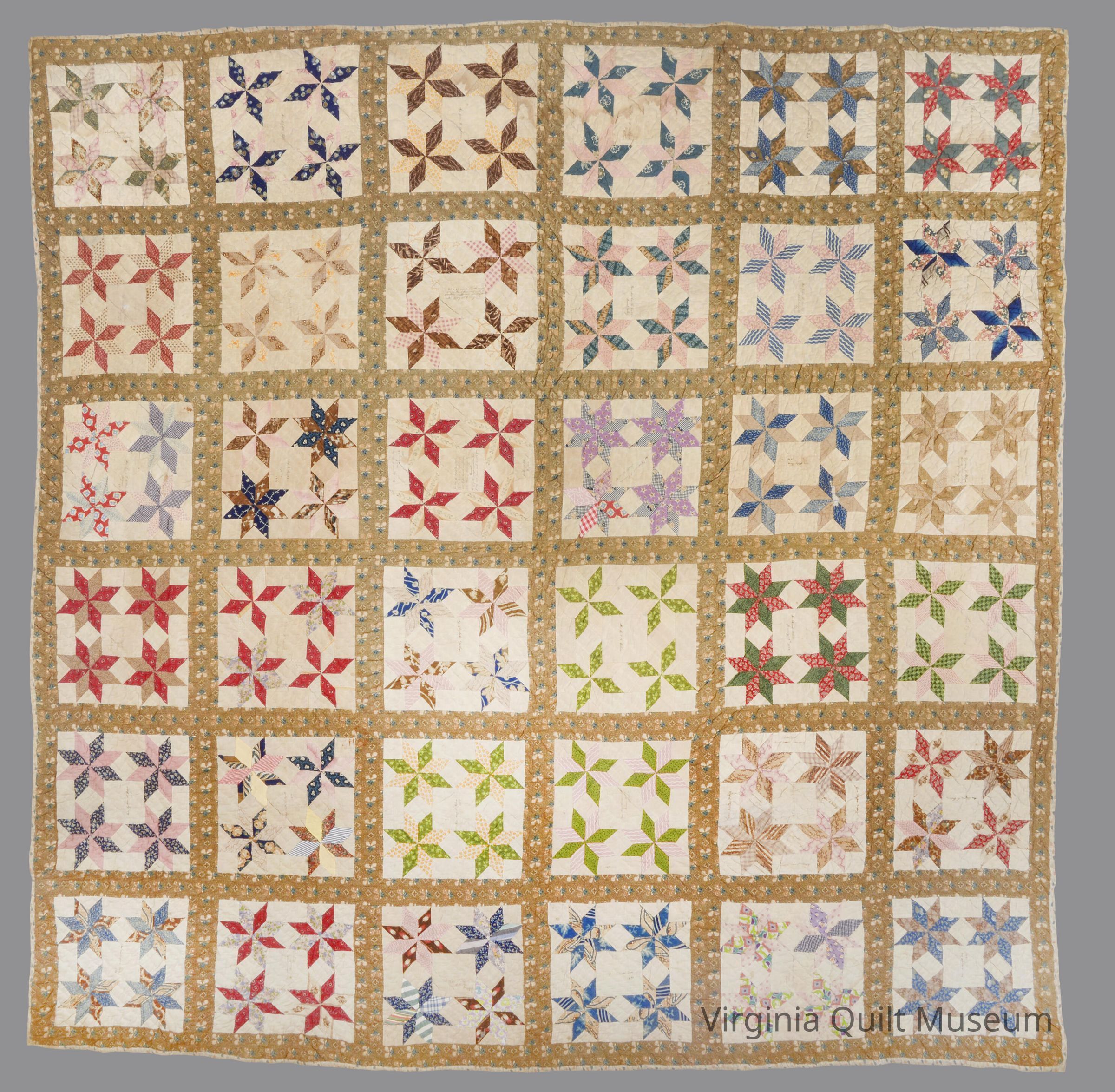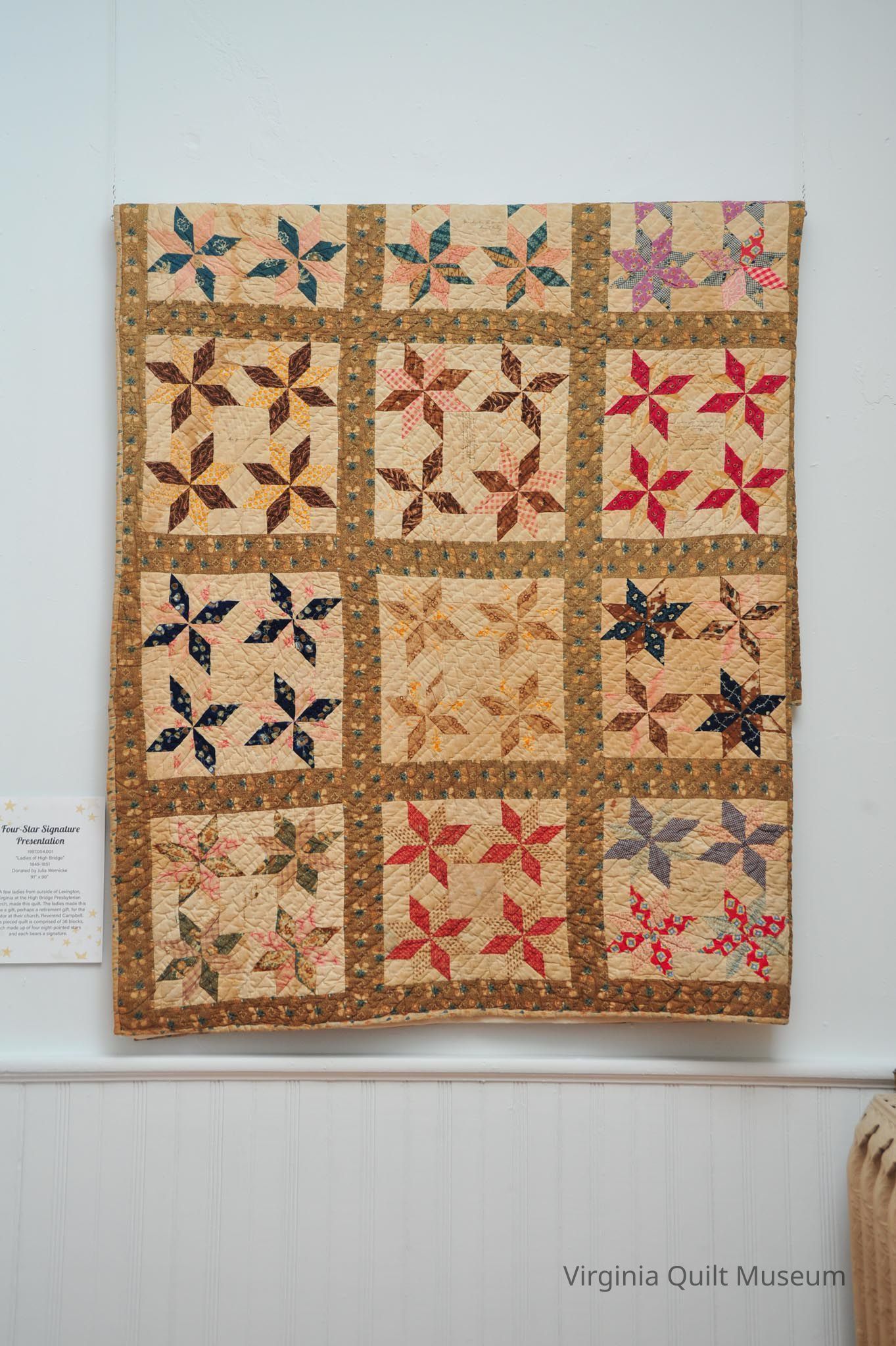 This pieced quilt in colors of blue, red, brown, and pink on an off white background consists of 36 blocks each measuring 12" square. Each block is made up of four eight-pointed stars and each bears a signature, some including dates from 1849-1851. The center block bears written documentation about the quilt and says: "To the reverend S.D. Campbell/The Ladies of High Bridge/and hope he will accept this as a token of their regard. Farewell/ Be of good comfort and the God of Love and peace shall be with you. February 7, 1851/ Rockbridge Co., Virginia"