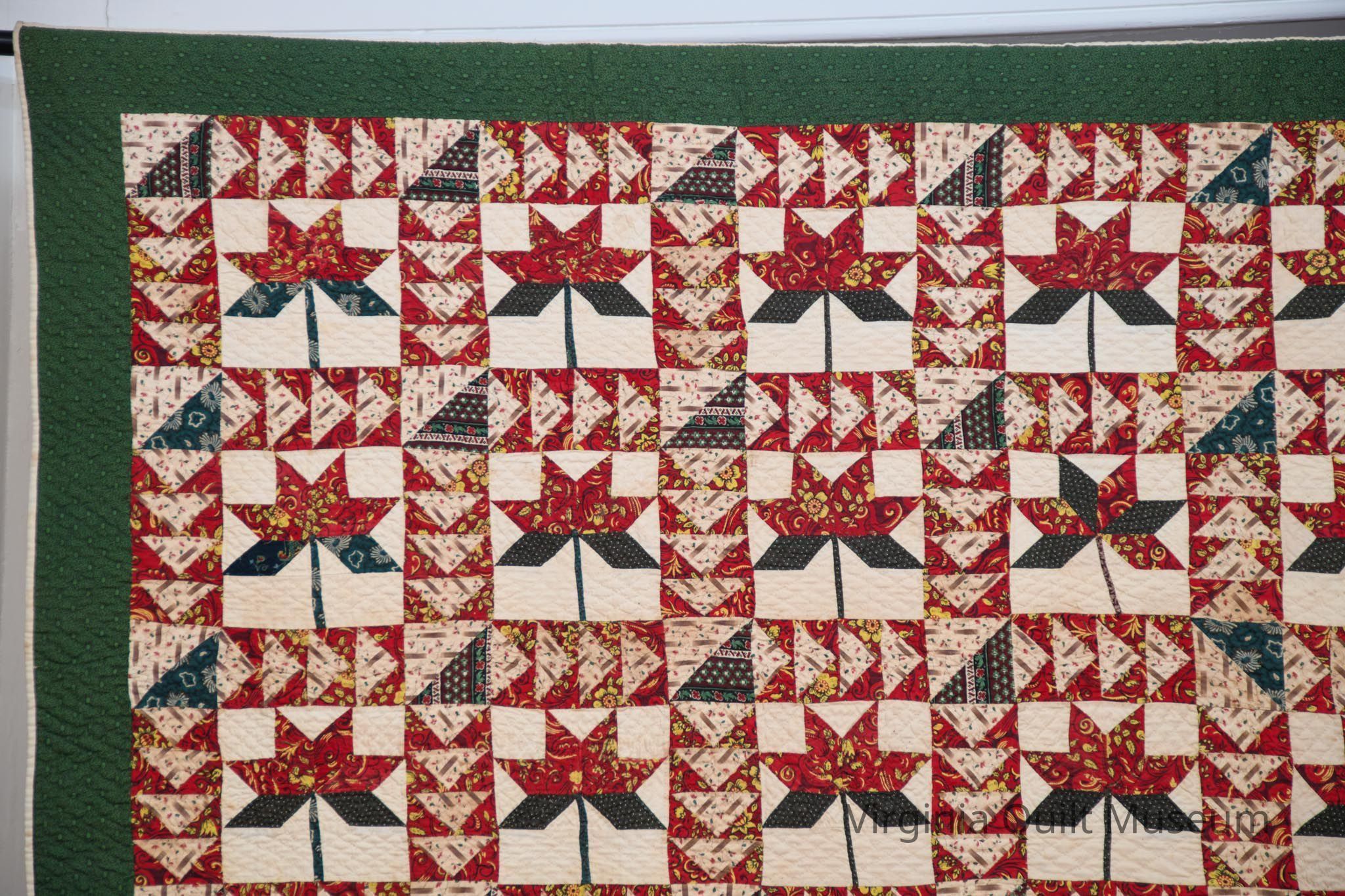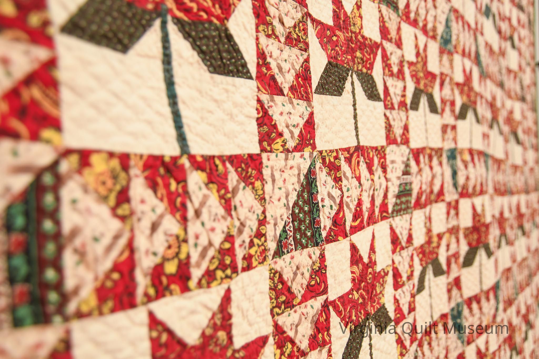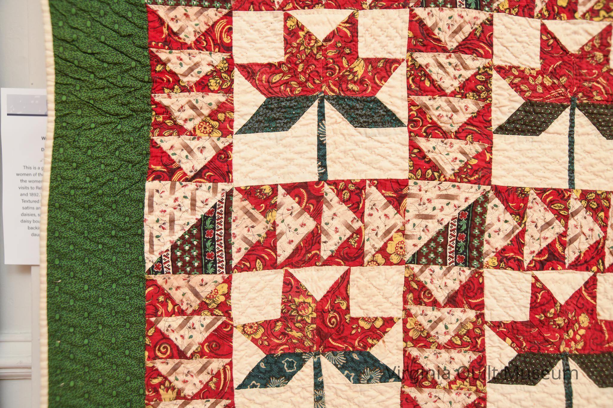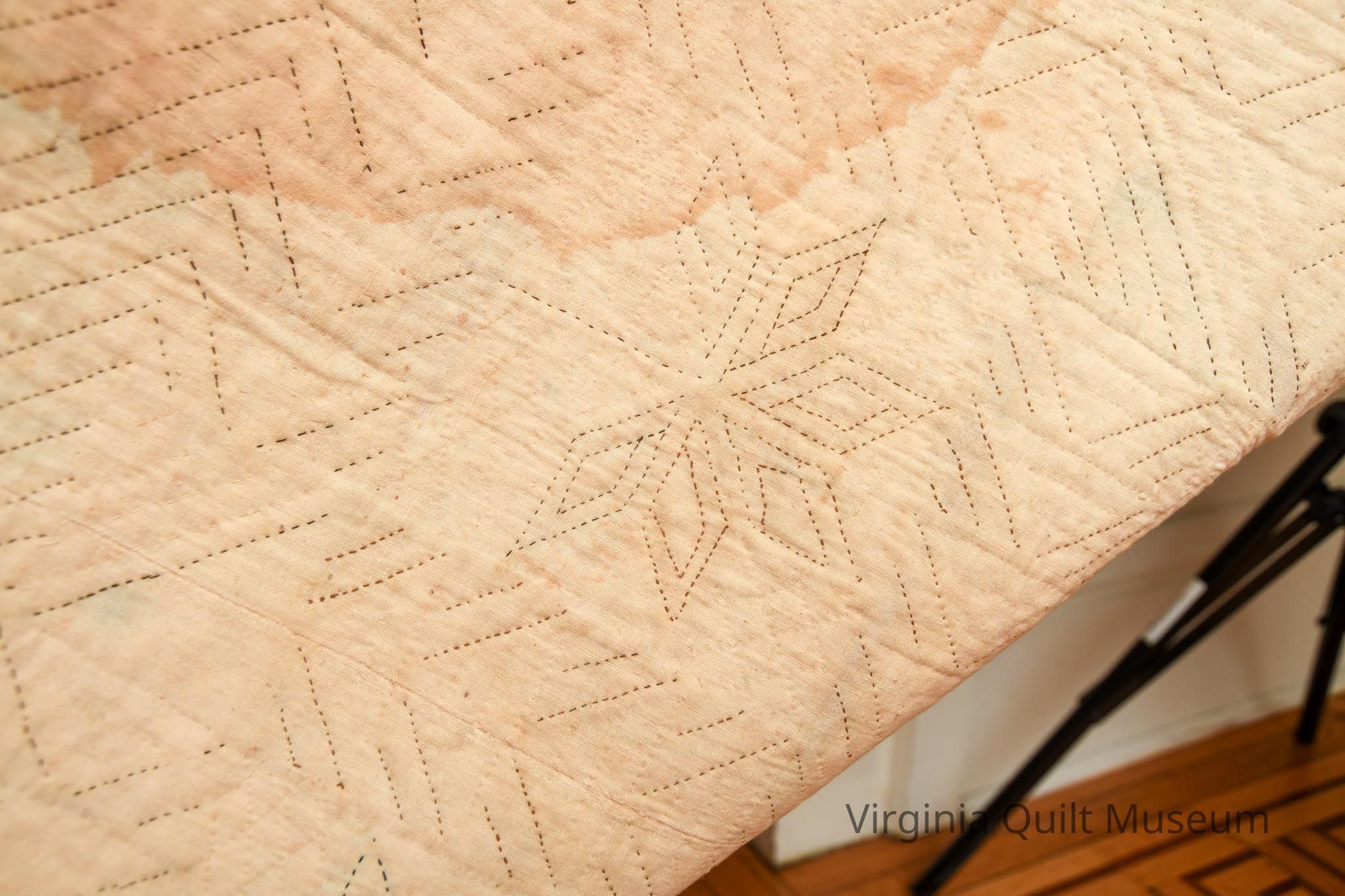 Hand pieced, appliqued, and quilted. It is densely quilted in diamond and chevron patterns.Context