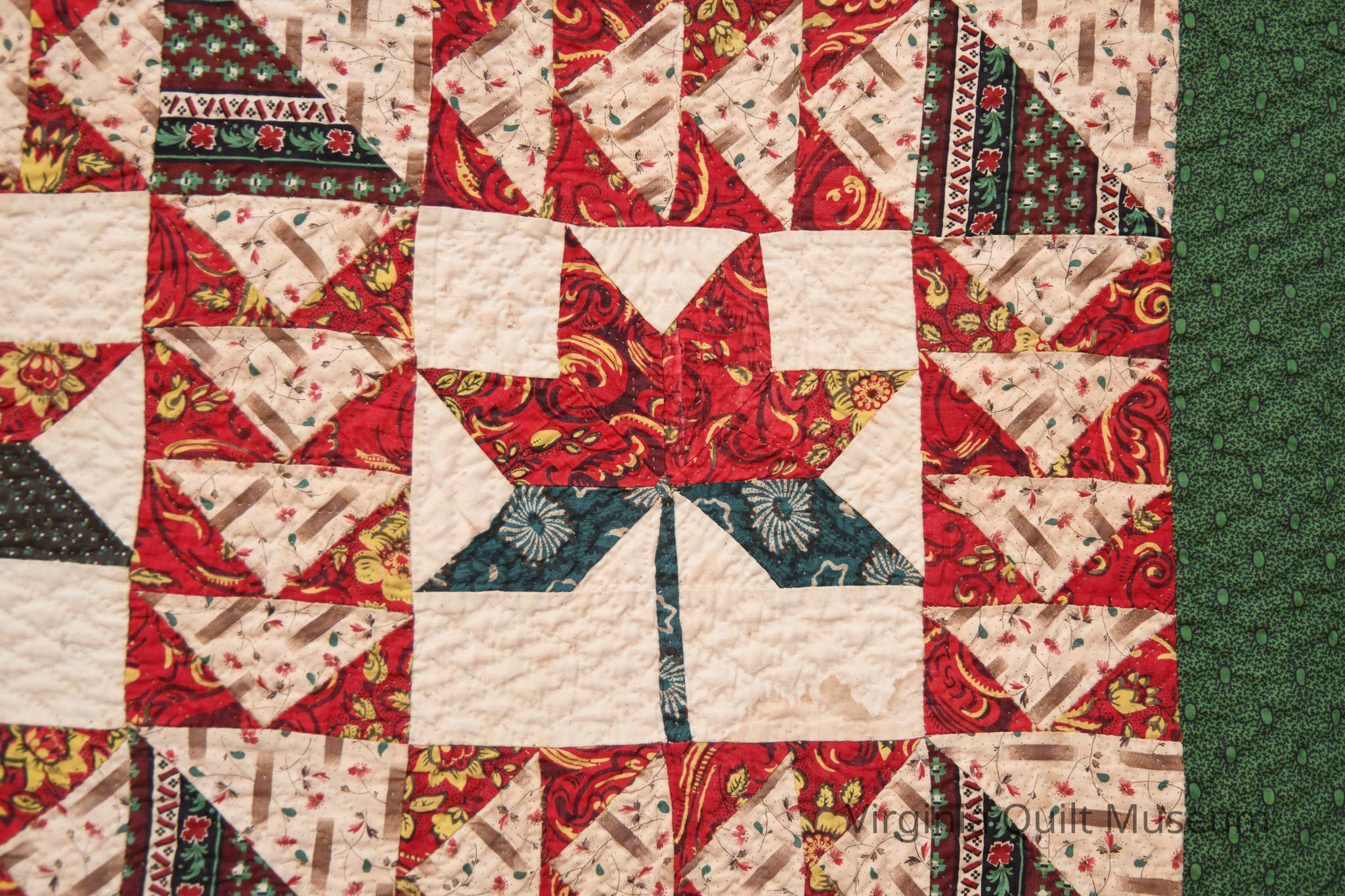 6 1/2'' Maple Leaf blocks set 8 x 9 with 3'' Flying Geese lattice and half square triangle squares as cornerstones. 3 1/2'' green border on 2 sides and 3 3/4'' on 2 sides. Heavy amount of 1/2'' square grid and hanging diamonds in block backgrounds. 1/2'' parallel diagonal lines in borders and lattices. 1/4'' straight white cotton applied binding.
