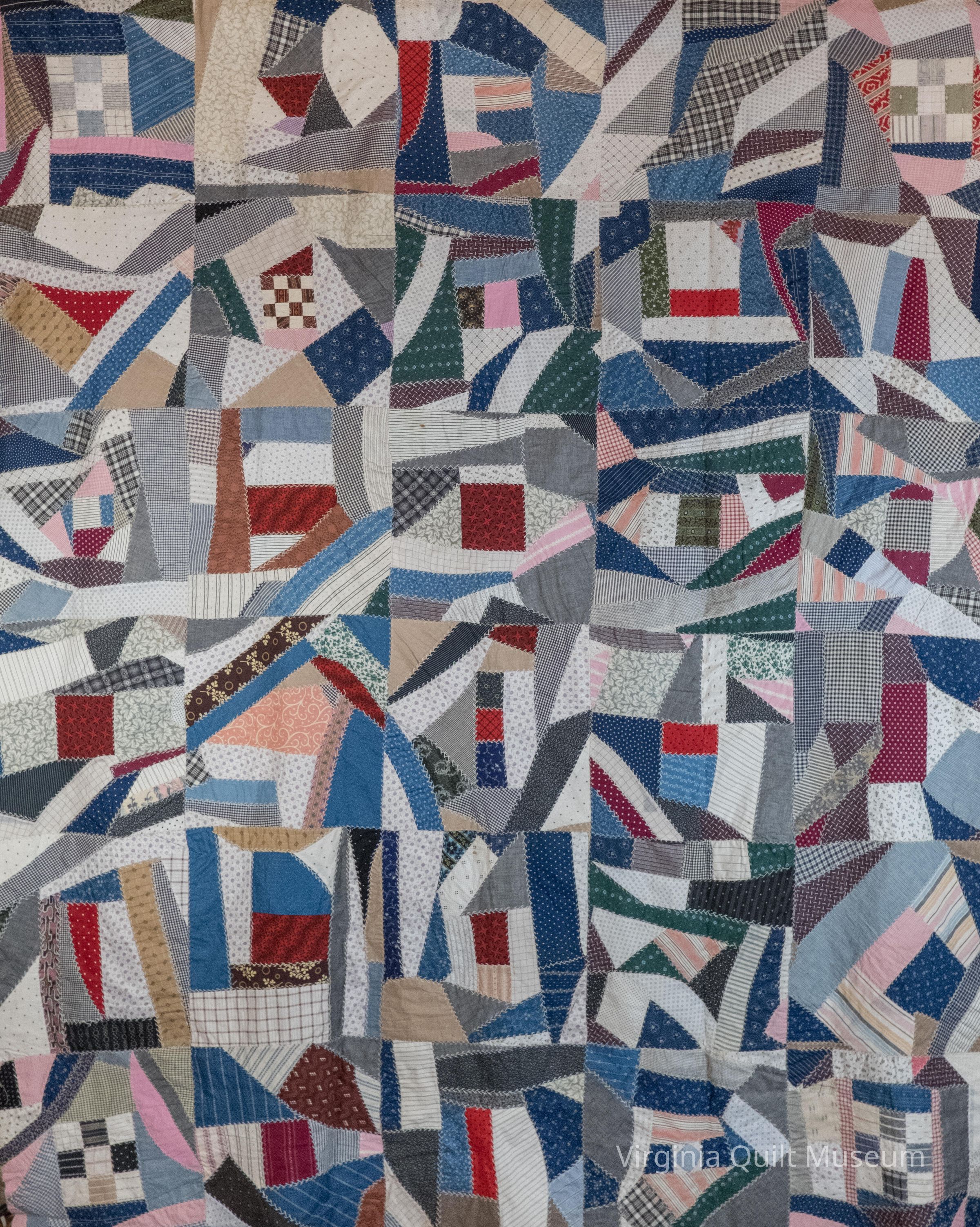 This multi-colored crazy quilt was pieced on a foundation. It has much embroidery on the top.