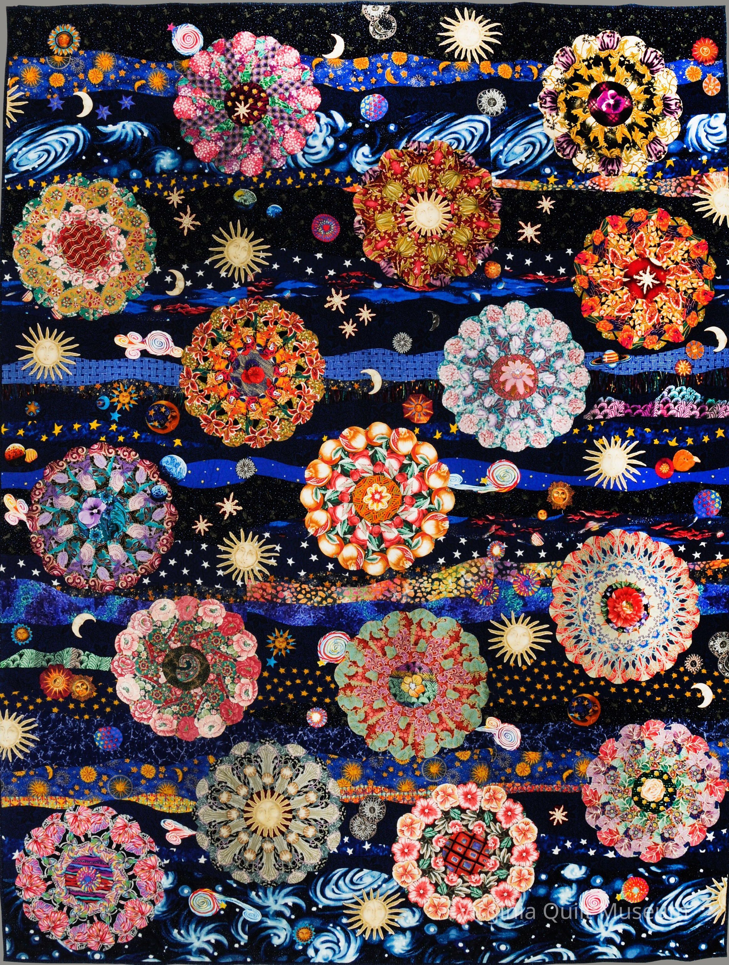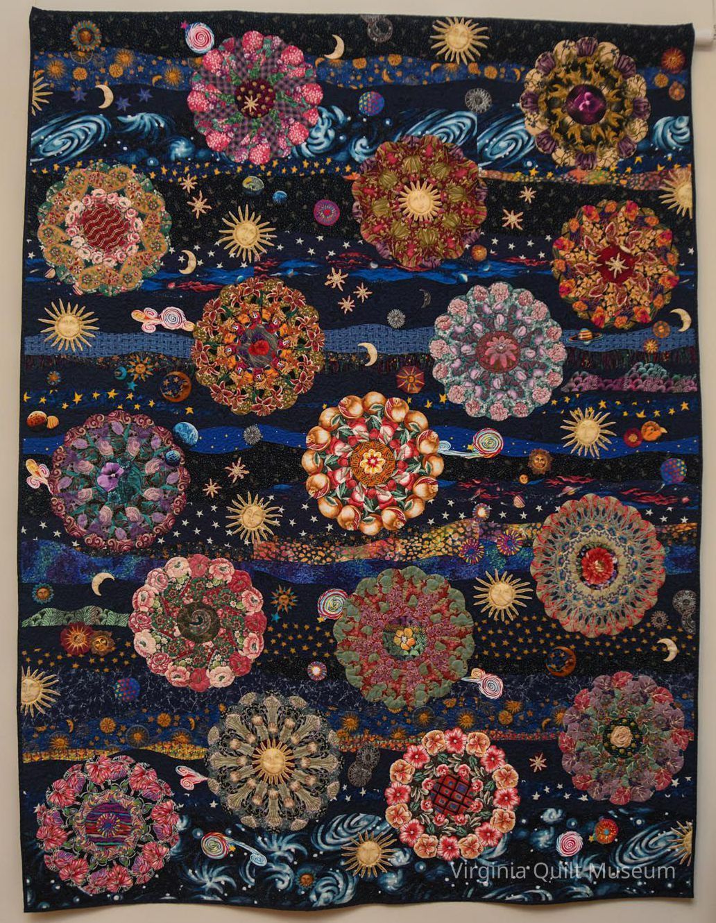 Vibrant kaleidoscopes made with the Plate pattern appear to float on a curved pieced background mimicking the night sky. The Dresden Plate blocks are appliqued on-top of strips of pieced outer space (dark blues and starred fabrics) fabric.
