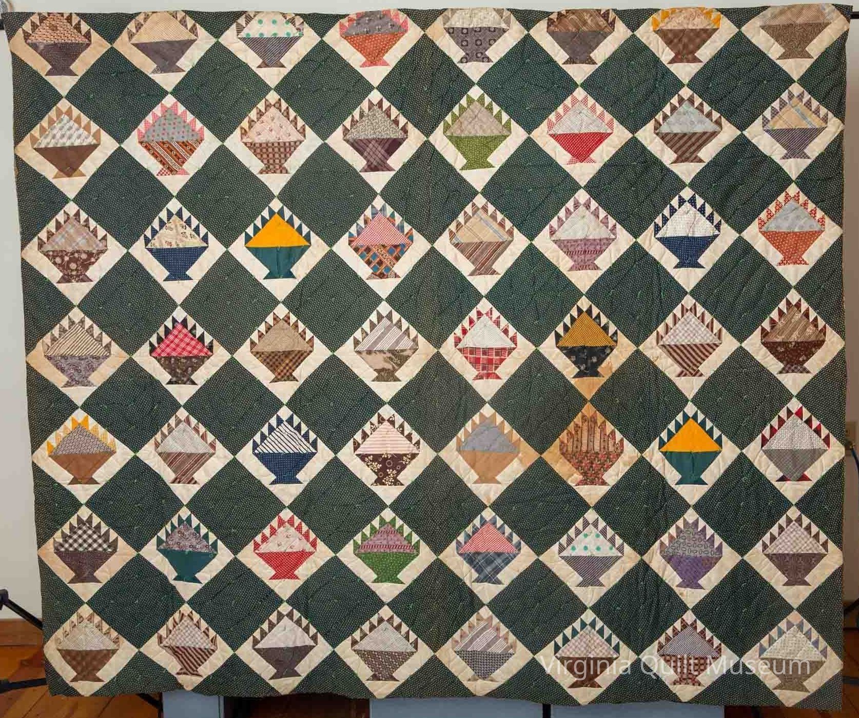 Pieced Basket blocks in multicolored fabrics set with alternating blocks in green print. Wool challis paisley print backing purchased and finished by the Long Sisters c. 1930. Tied. Initial "E" in cream in the corner.