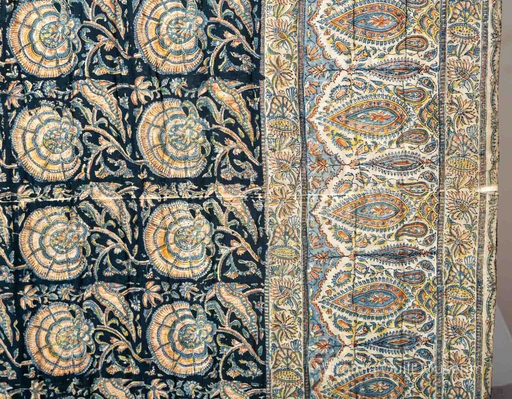 There is a total of 56 blocks (8 x 7), each measuring 7.5'' square. Each block is set on point with a green print fabric. The binding is turned inside. There is a thick cotton batting.