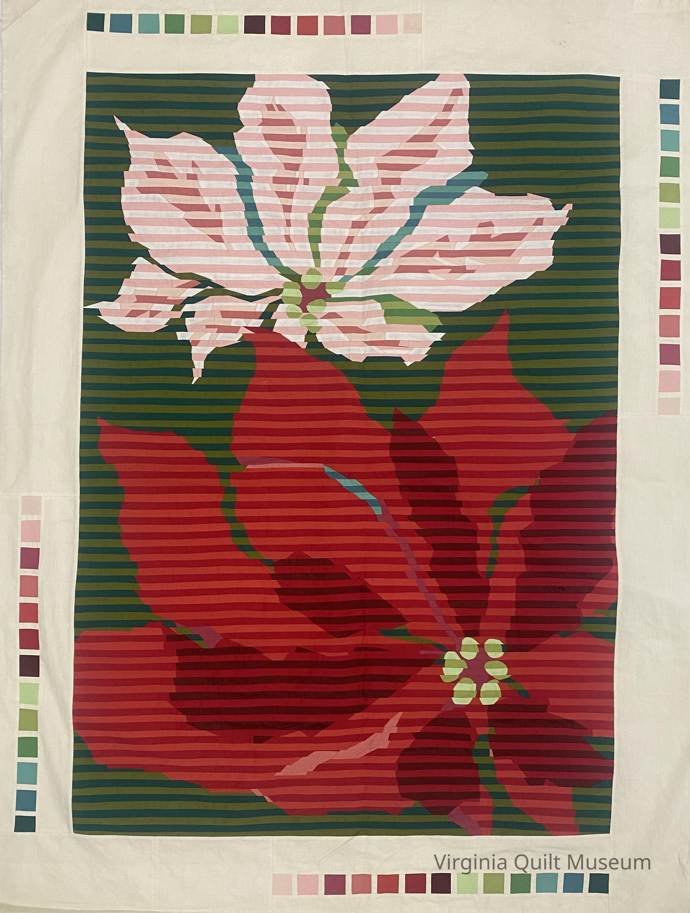This quilt top was inspired by poinsettias on a Christmas card, the designs of Georgia O'Keeffe, and a 1920 Dresden Plate block.