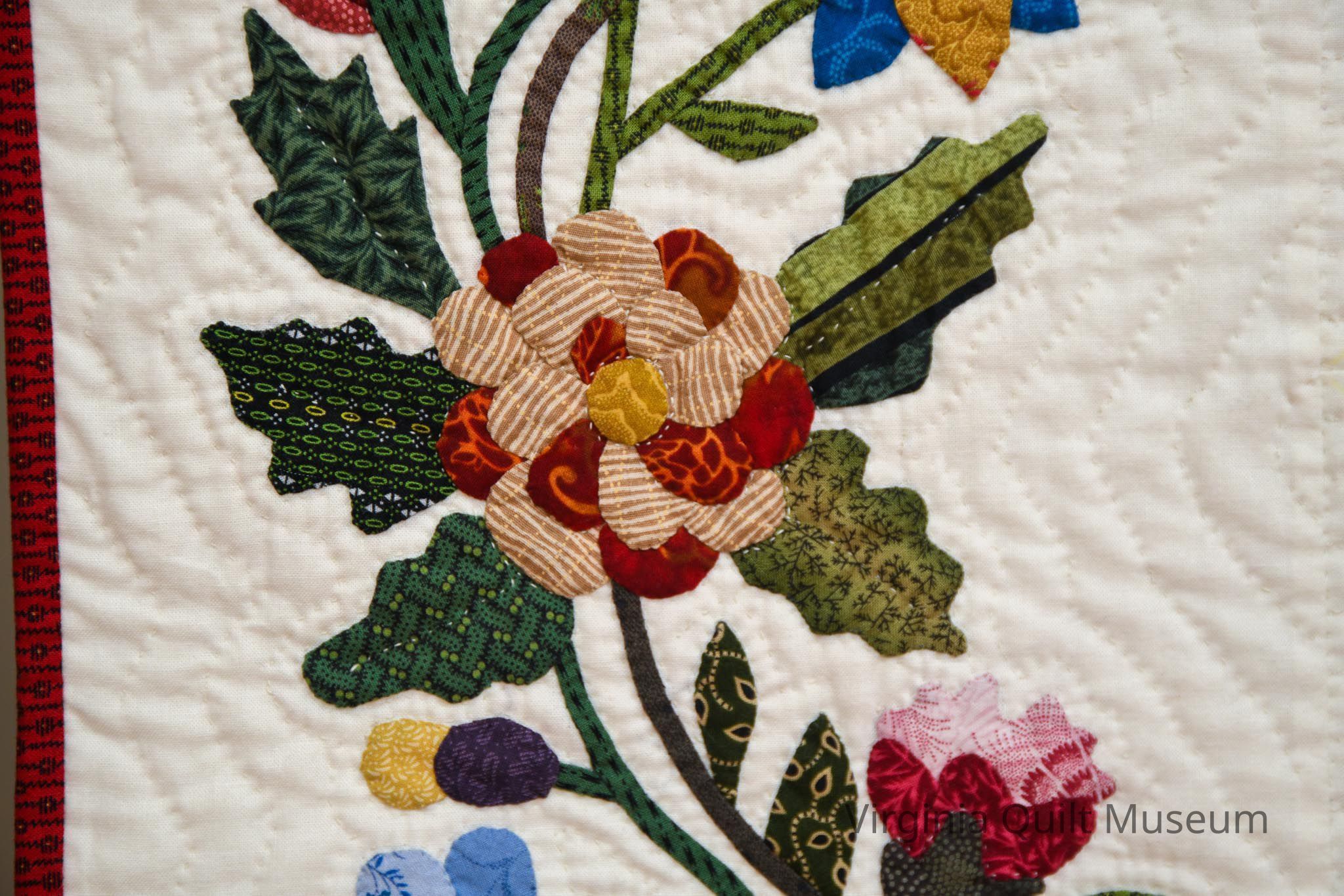 Machine assembled, hand applique/quilting in dense lines and shadow stitching.Context