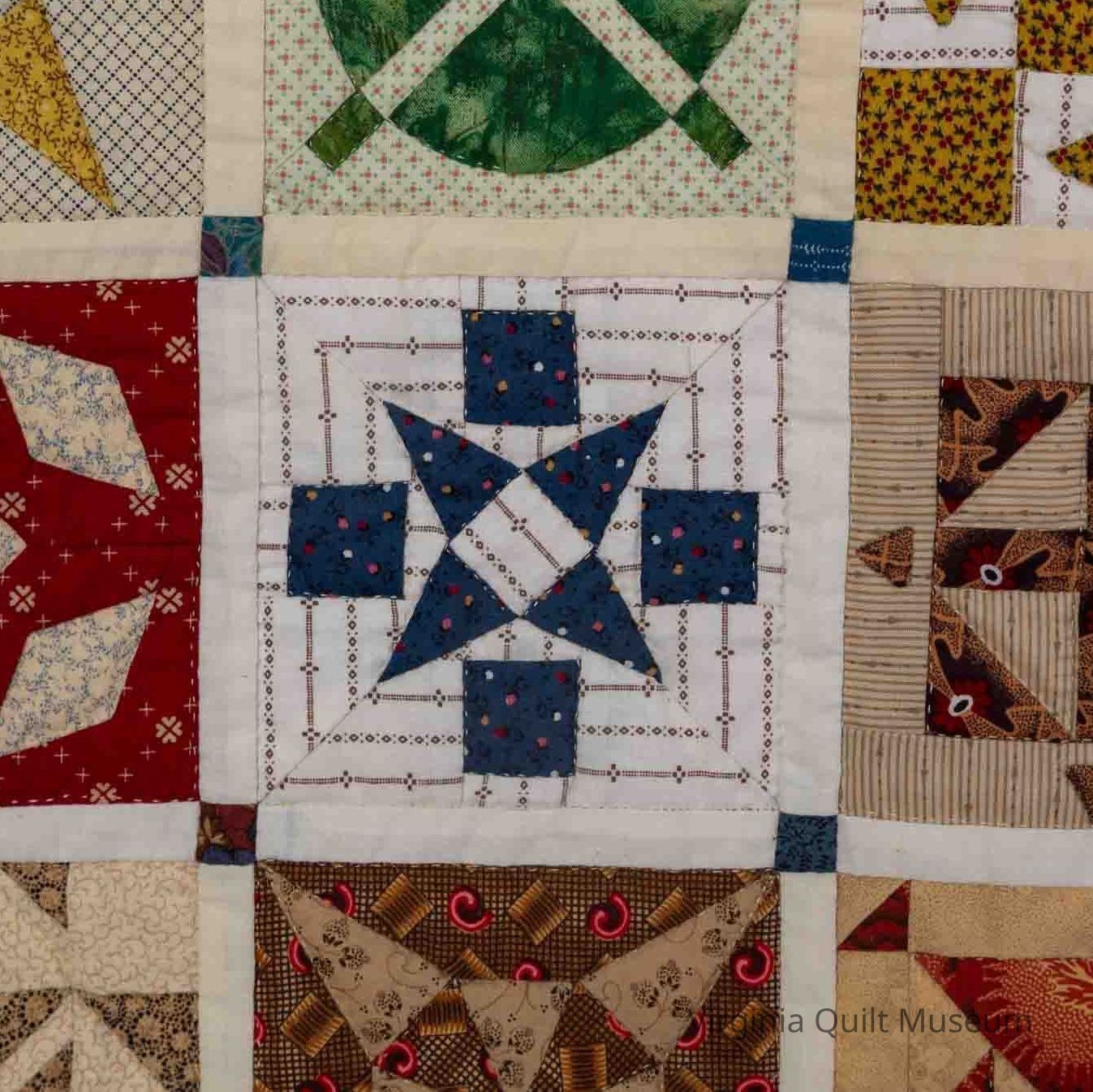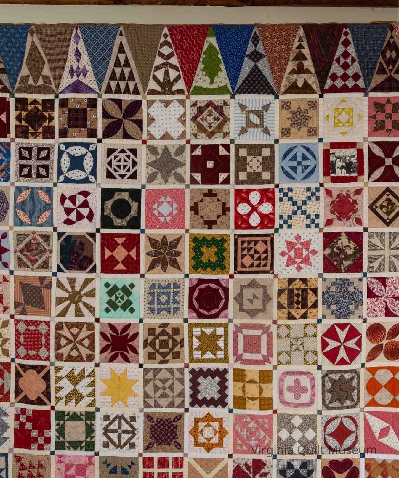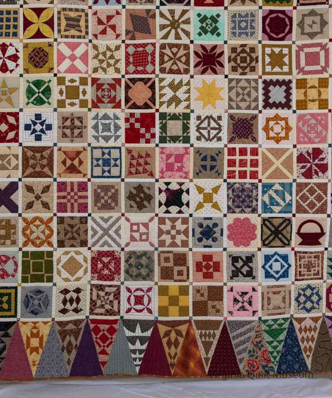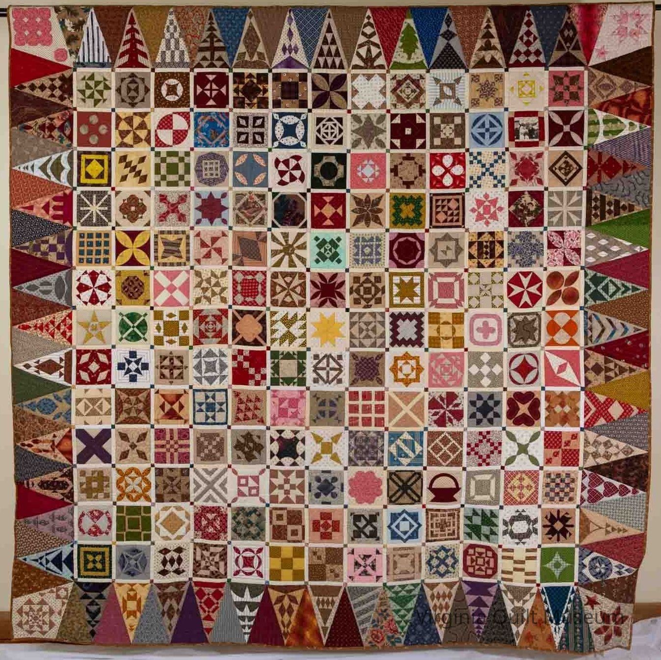 This is an 81" square quilt, hand-pieced. It was made using cotton and multi-colored blocks.Context