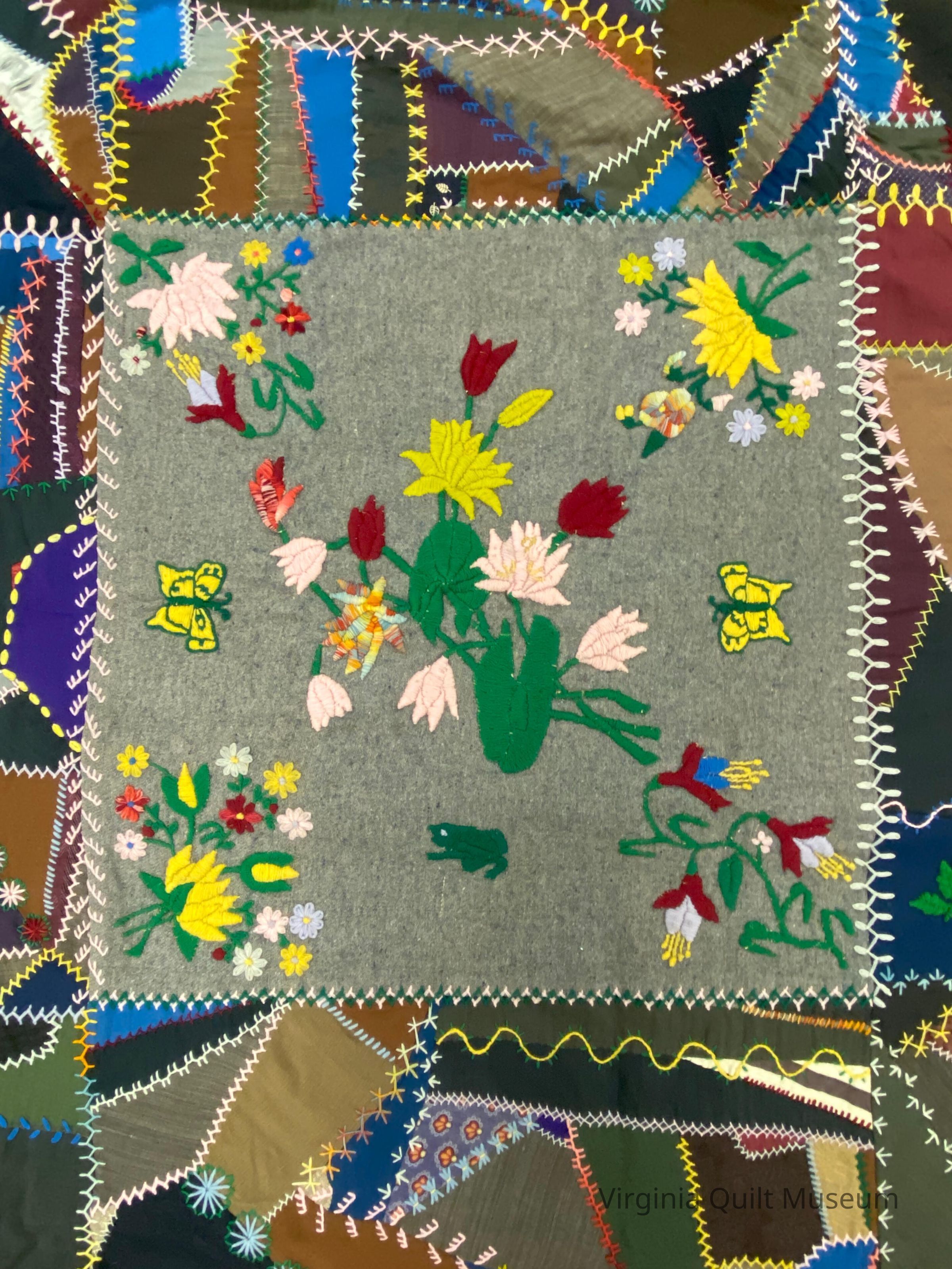This wool crazy quilt measures at 75" x 88". It uses randomly sized and shaped pieces of fabric stitched together and is heavily embellished with embroidery stitches. A solid gray block embroidered with lily pads, flowers, and butterflies is the center of the quilt. The pieced blocks surrounding it contain a variety of embroidery stitches and include embroidered initials of the makers children. A 5 inch border contains the blocks and there is no backing.Context