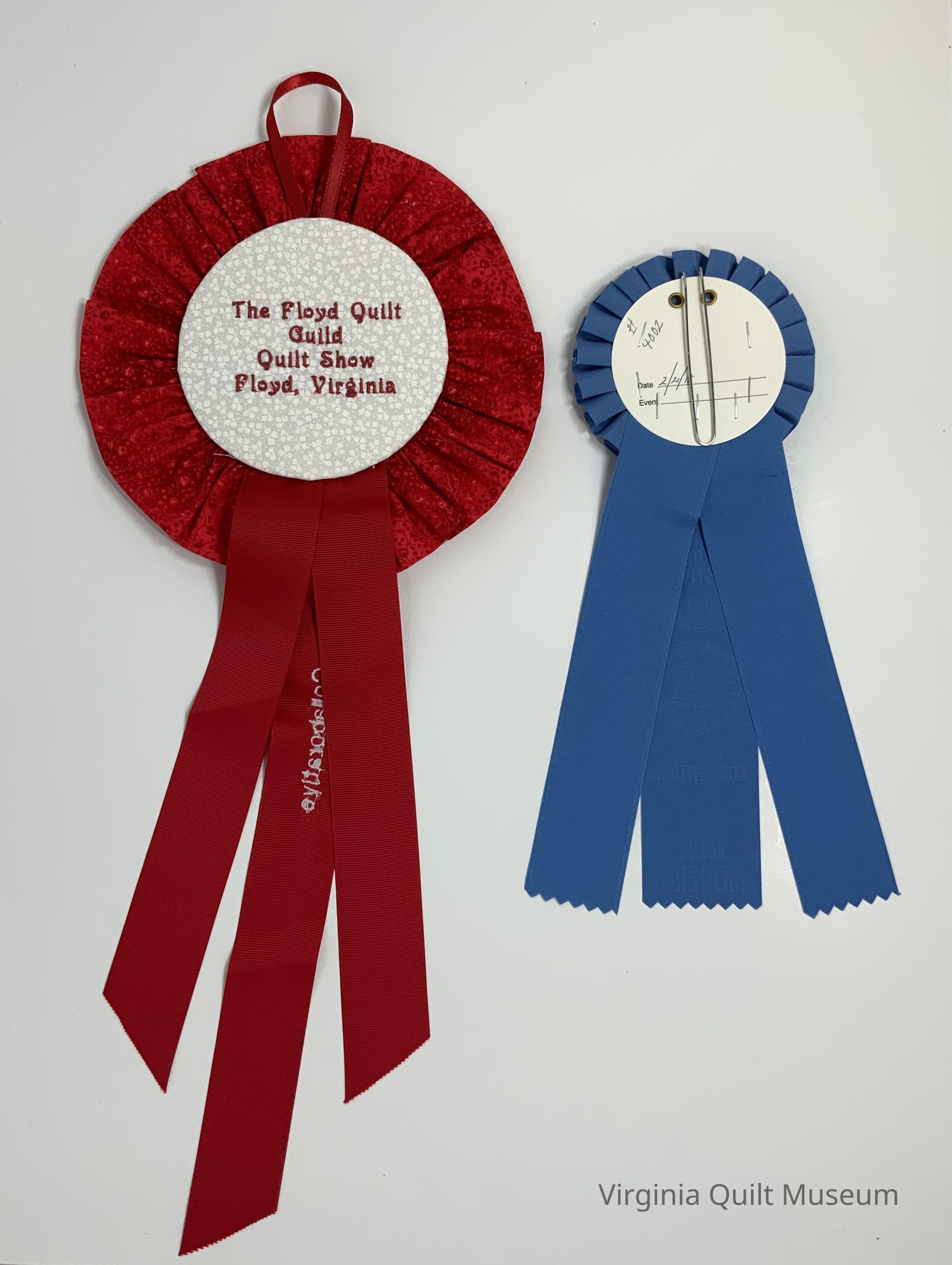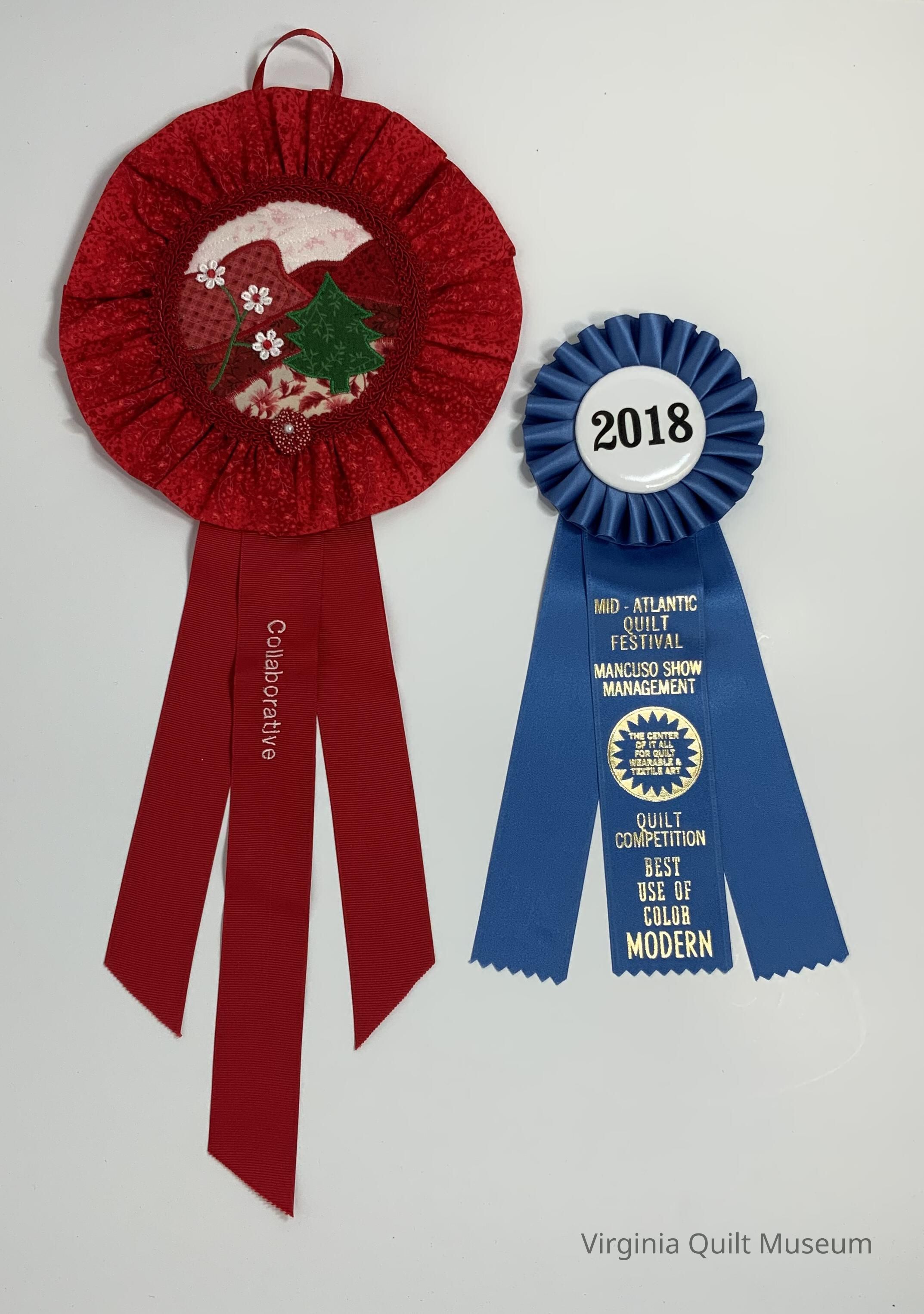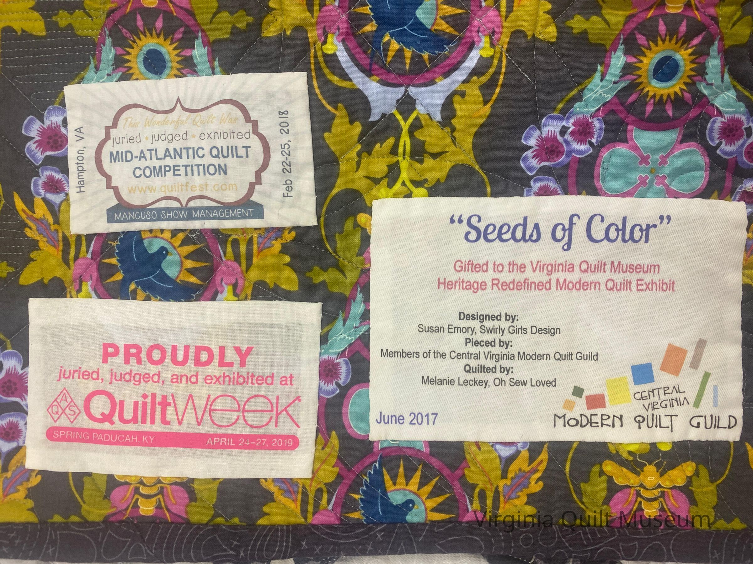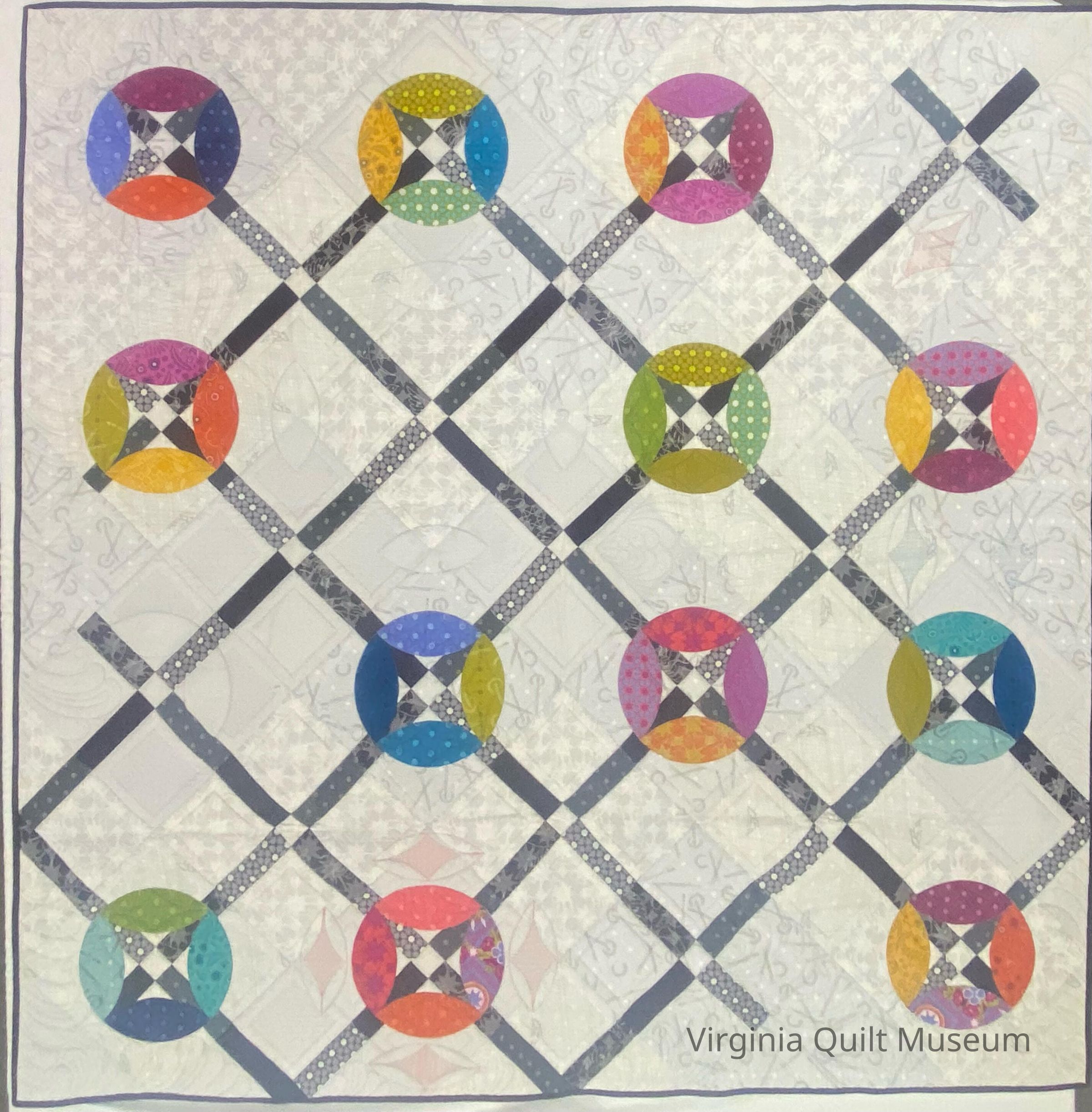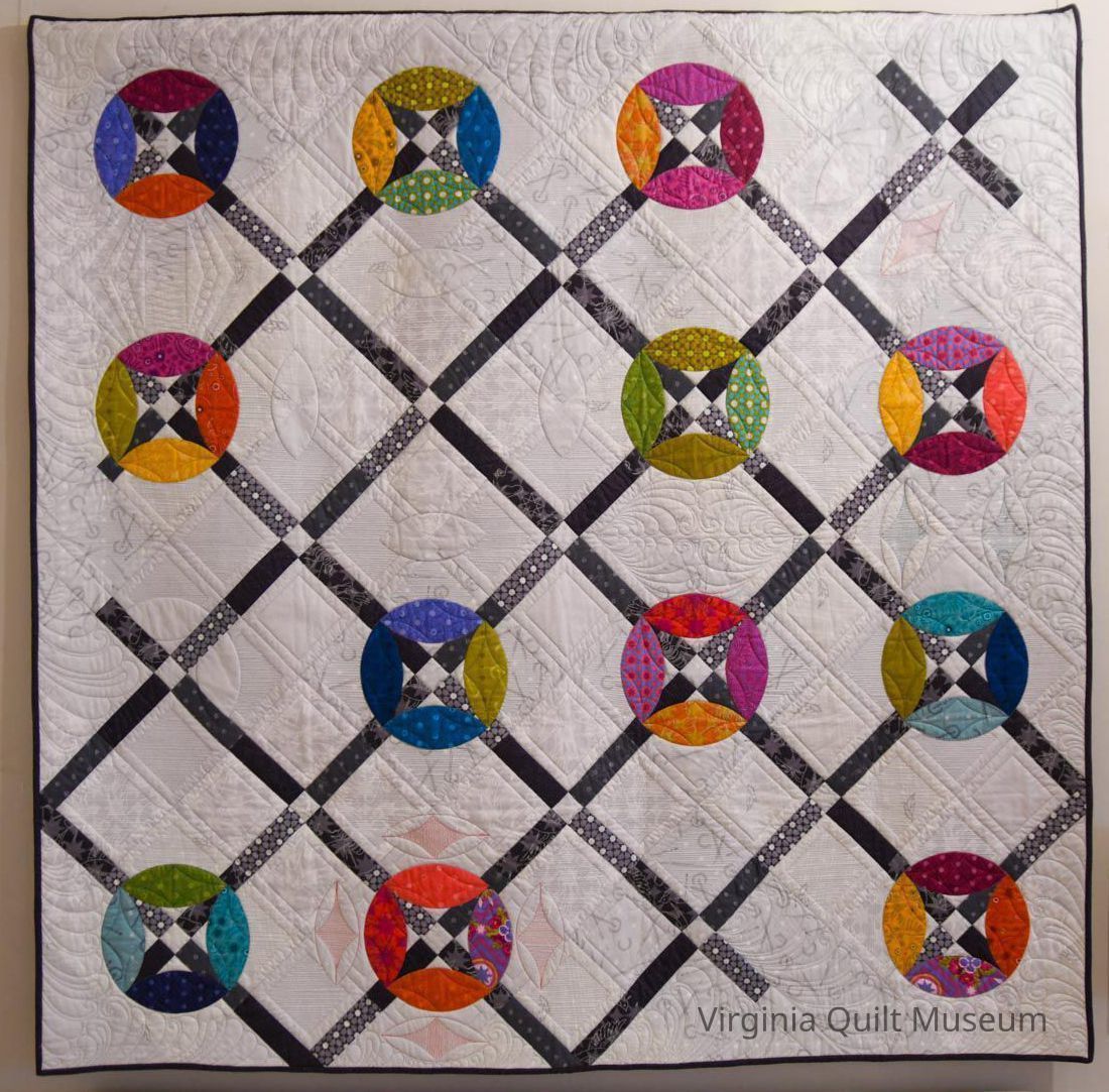 This opportunity quilt was gifted to the Virginia Quilt Museum as part of the Heritage Redefined Modern Quilt Exhibit. Susan Emory’s design was inspired by the traditional “orange peel” block, but with a modern, deconstructed aesthetic. Bold colors were chosen to make a dramatic statement against the white and gray background. Melanie Leckey’s free motion quilting continued with the deconstruction of the orange peel with free floating “peels” to emphasize the design.Collection