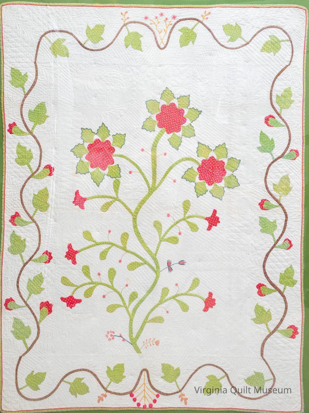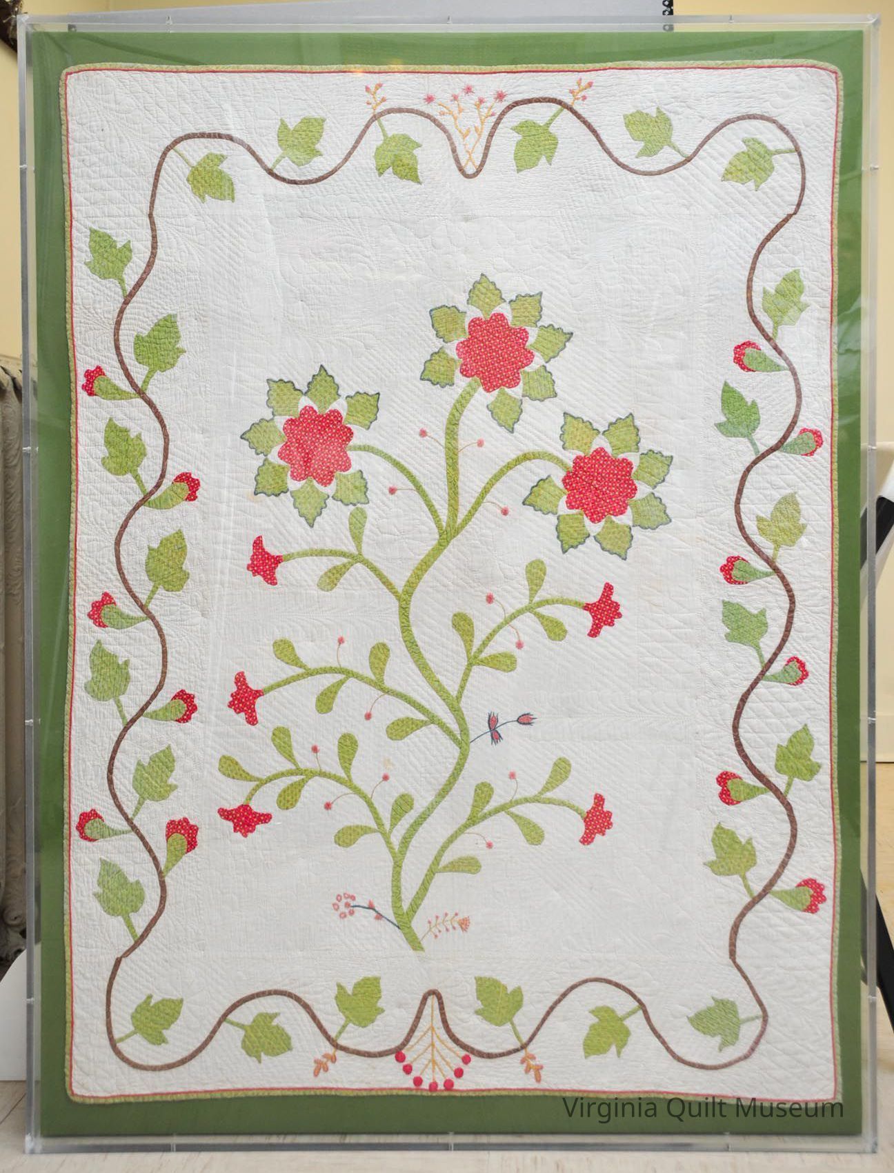 Appliquéd Tree of Life in center with 3 red 8 lobed flowers surrounded by 7 green print leaves, 2 branches on right, 3 on left with 5 lobed flowers and teardrop shaped leaves. Buds and stems on each branch are embroidered with wool and cotton threads. Brown print vine with green appliqué leaves surround the center panel. Quilting includes flowers, leaves, 2 feather wreaths in the top right and left, diagonal parallel lines, as well as hanging diamonds and clamshells.Context