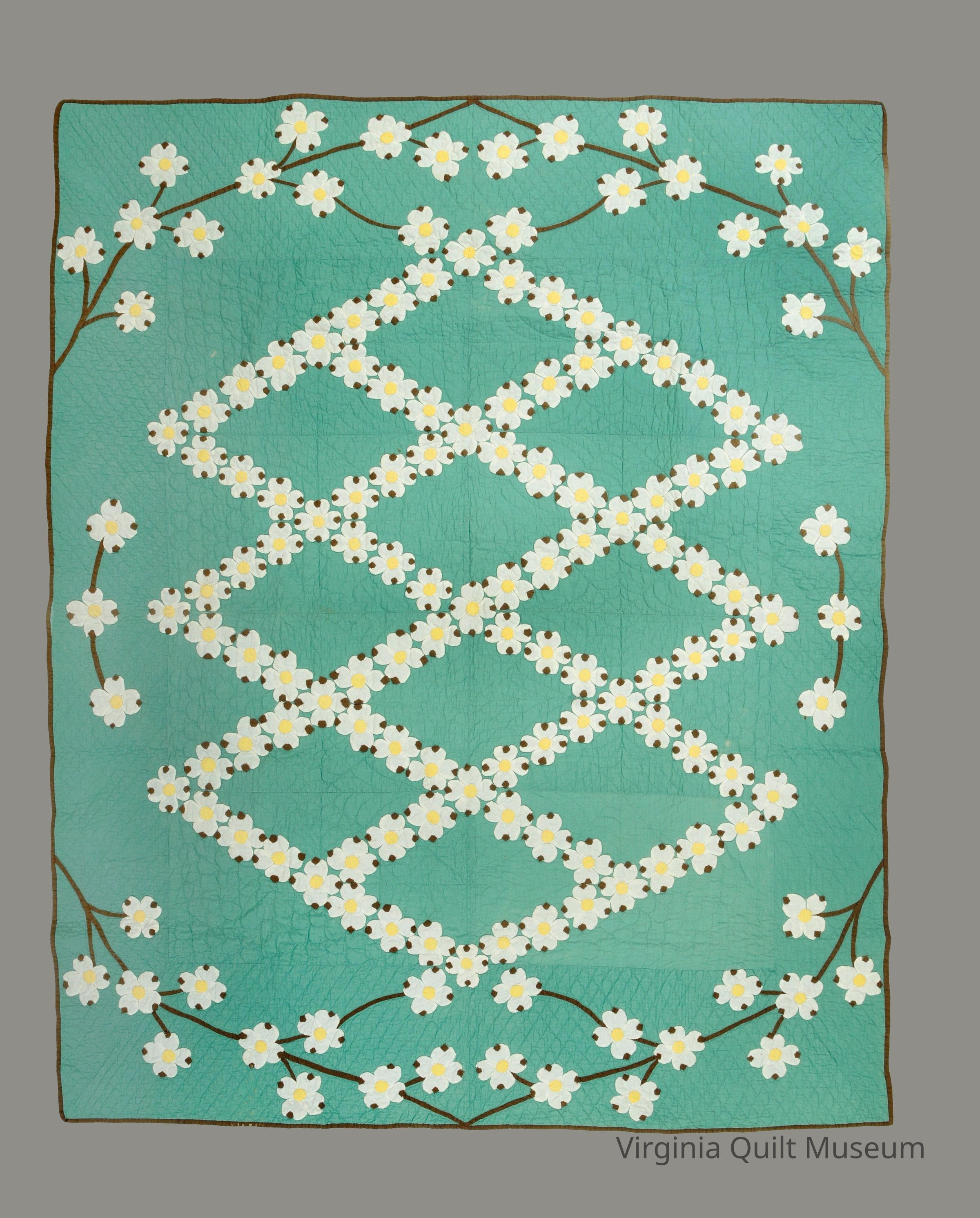 Green background with white blossoms and yellow centers. Patterns is in a diagonal diamond design in the center of the quilt. On the top and bottom there are brown branches with the white flowers. "Mother 1940" is embroidered on the back. Hand-finished binding on the back. Quilted with green thread.Context