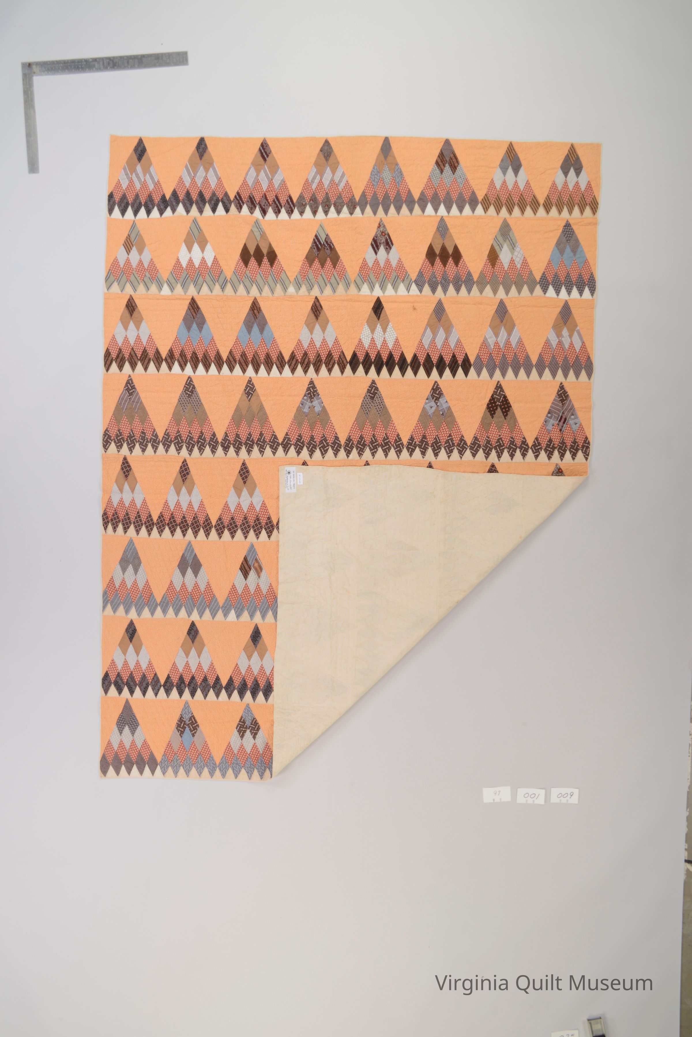 This is a multi-colored pieced quilt. Its quilting was done in the outline by hand and there is crosshatch stitching. An "E" is embroidered in lavender on the back corner.
