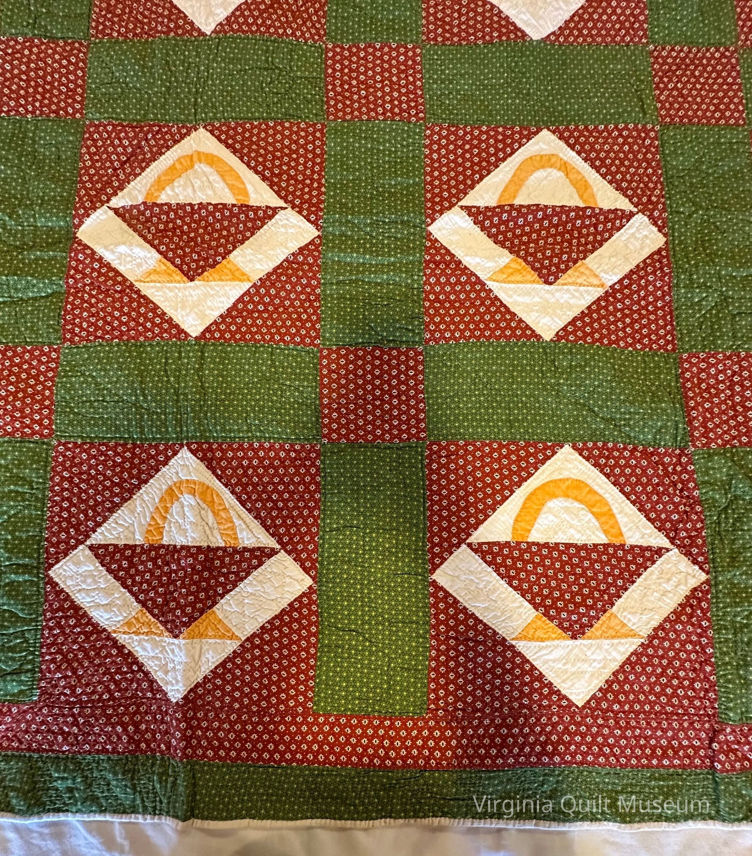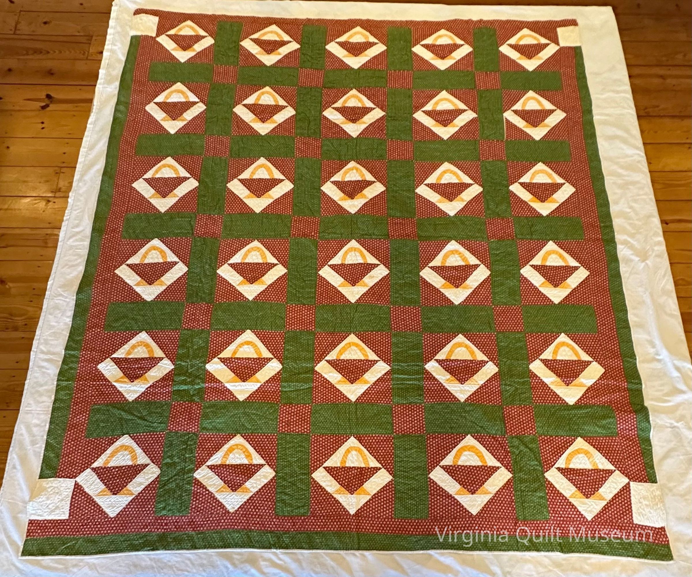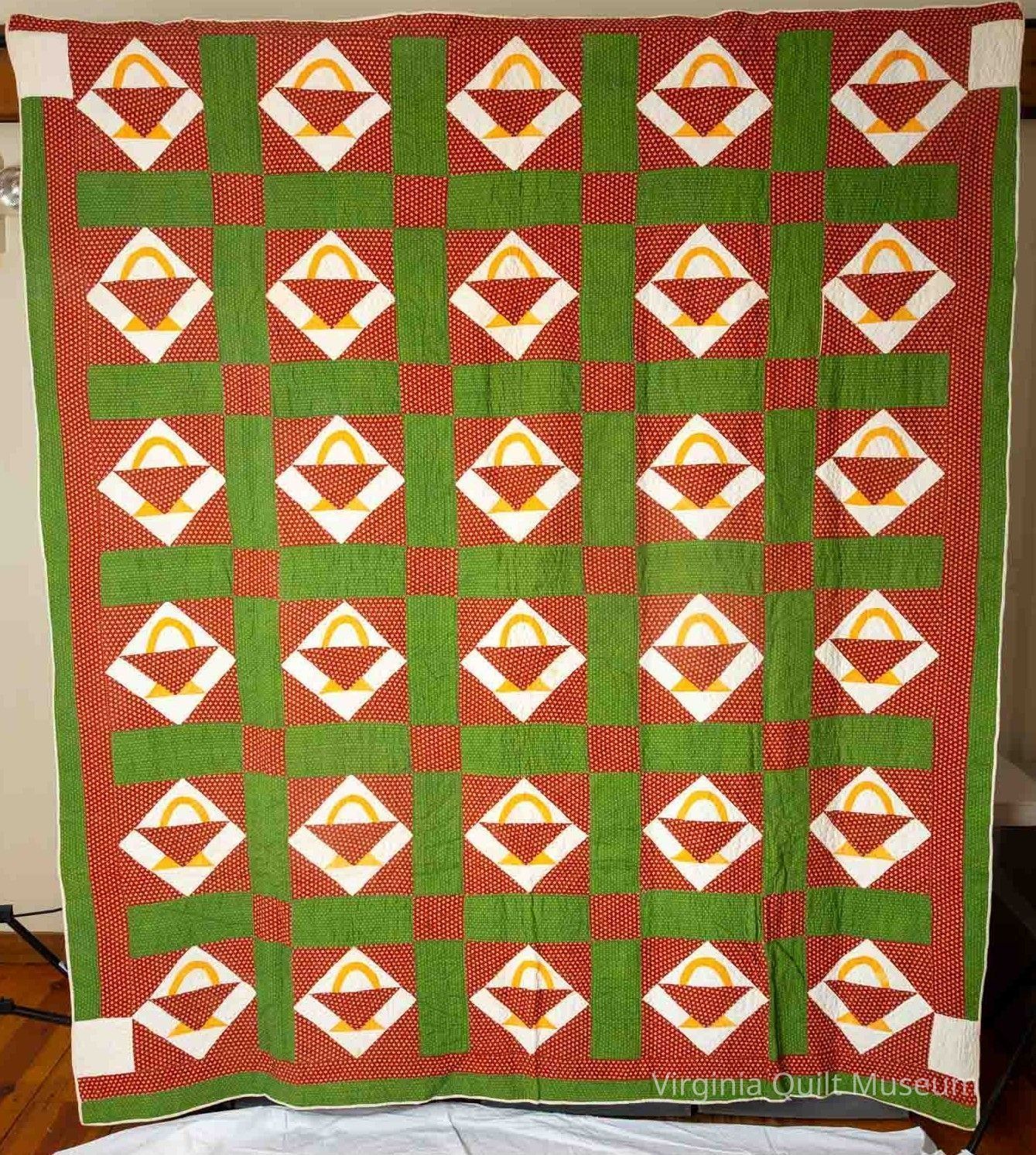 30 basket quilt blocks featuring made out of solid cheddar fabric and a red print. The baskets are centered in a white square on-point and a full square of red prints. Each block is surrounded by a poison green print and the red print at the square intersections. The entire quilt is finished with a double border in the red and green print.