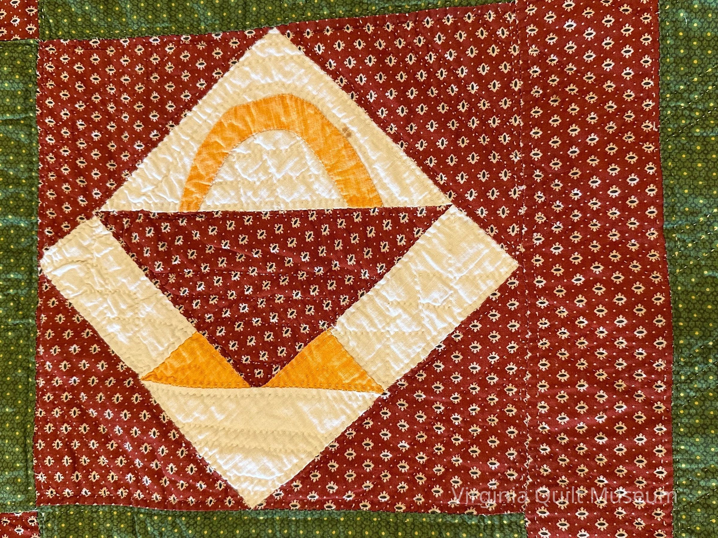 The backing is a white muslin. The binding is back to front. The entire quilt is hand quilted using single, white, cotton thread at 6-7 stitches per inch. The borders and blocks contain diagonal lines of three. The quilting in the sashing is an undulating vine with leaves, while the square intersections feature a circle with crosshatching. A white square with quilting is placed at each corner of the quilt with a circular flower or wreath design.Context