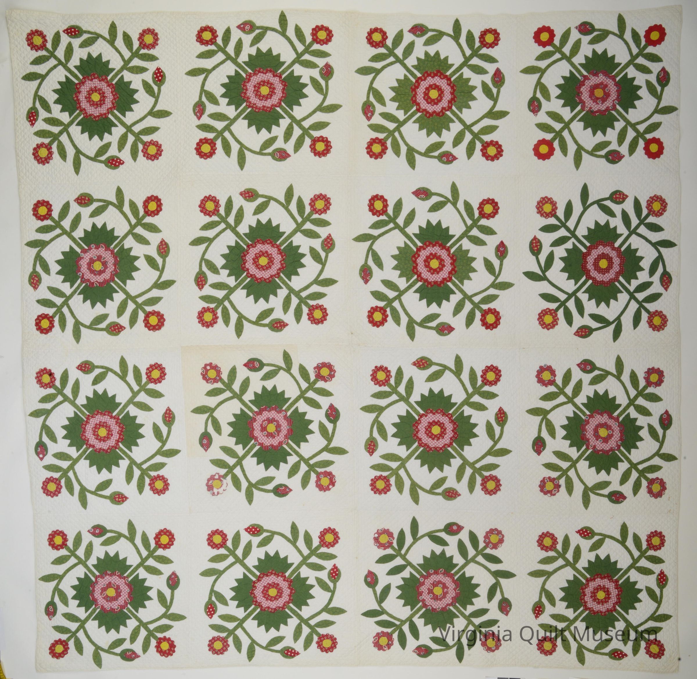 A note on the back of the quilt attributed it to Emily Bowers, but the donating family believes a Mrs. Sam Mouffet was the creator. Either way, this quilt was made circa 1860-70. Red and green appliqué quilts were considered "the best quilts" by families in the mid 19th century. The finest needlework was on display in these quilts.Collection