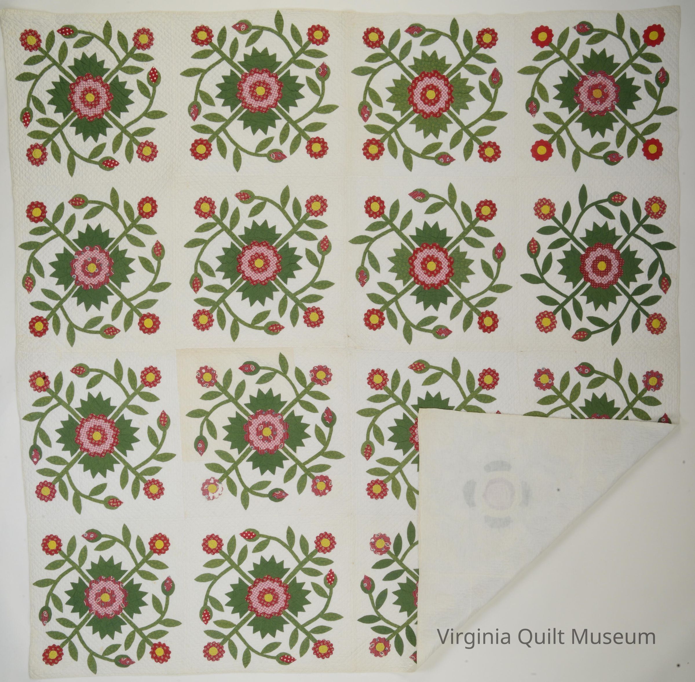 The quilt is hand appliquéd and hand quilted. Quilting consists of an outline around the flowers and a crosshatch 1/2" apart in the background. The white backing is brought to the front to form the binding.Context