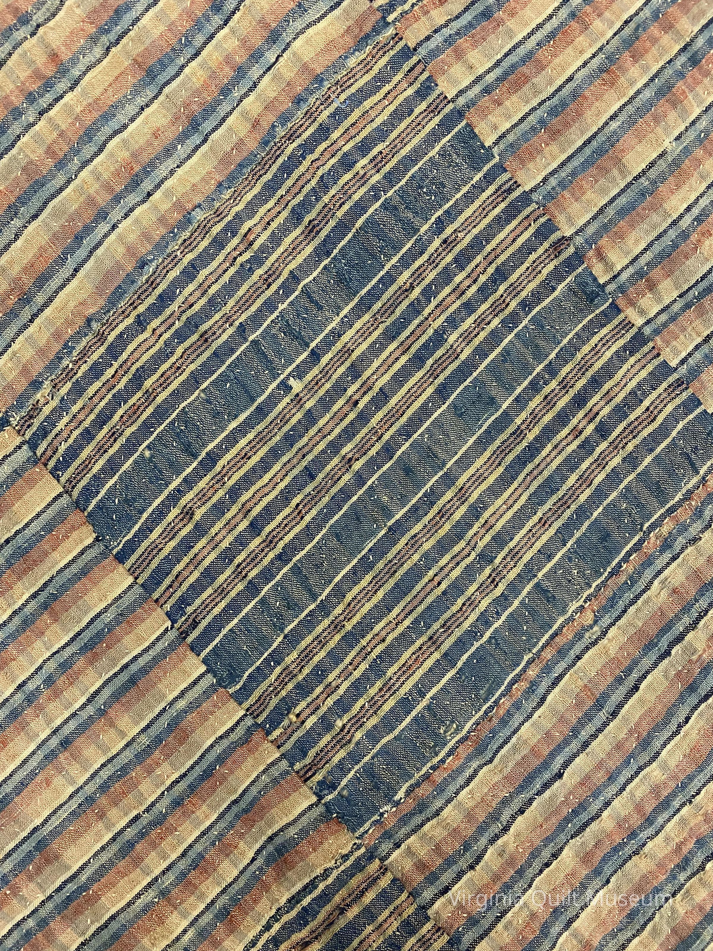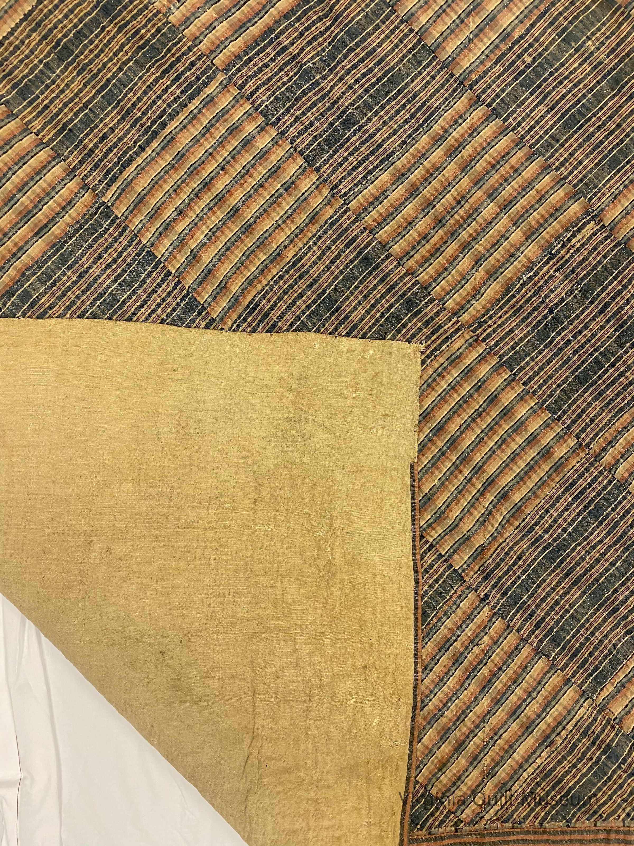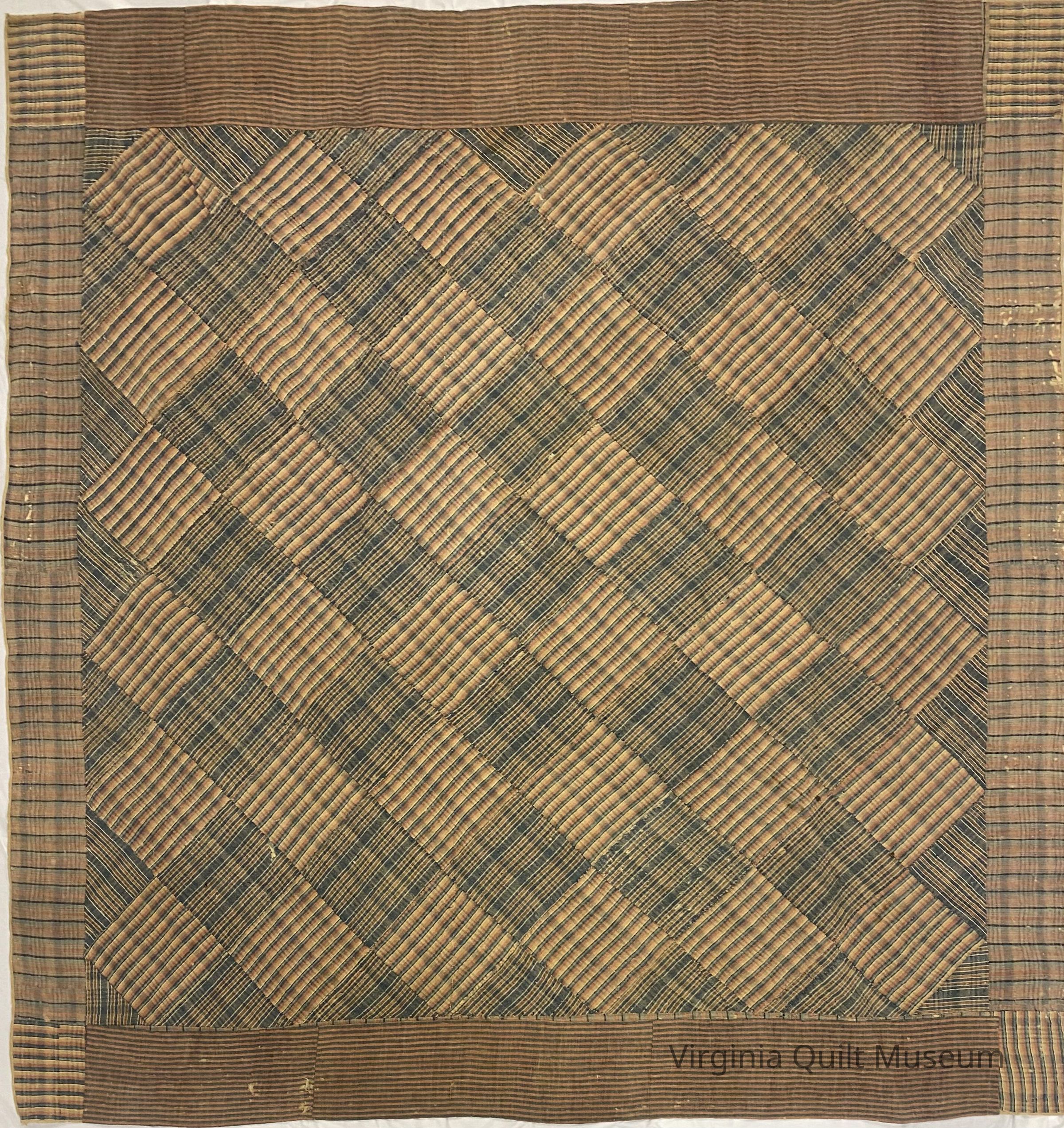 Pieced quilt with square blocks in diagonal rows. Colors alternate between dark and light plaid. Wide outer boarders of various plaids. Hand made, home spun, home woven, pieced.Context