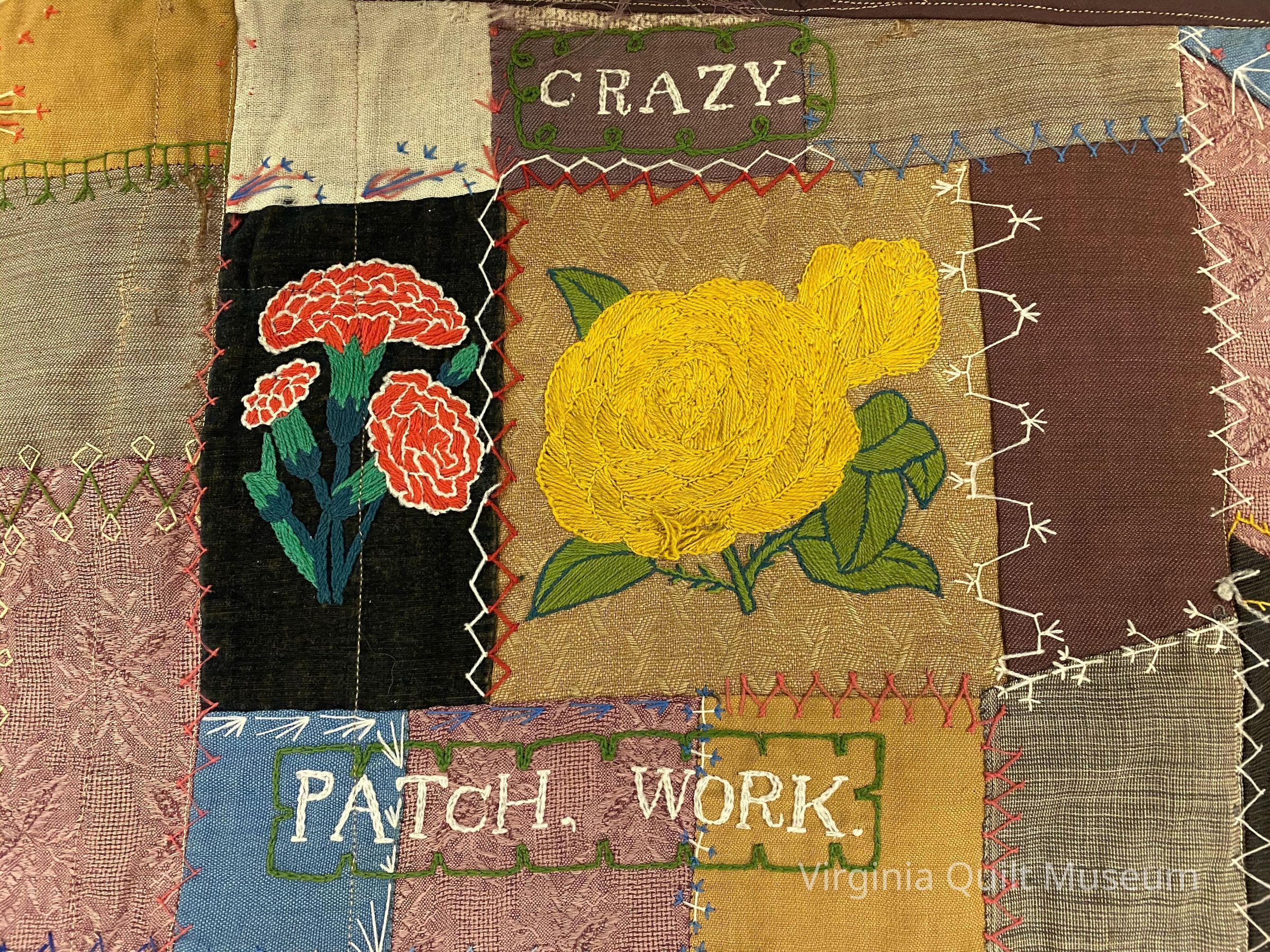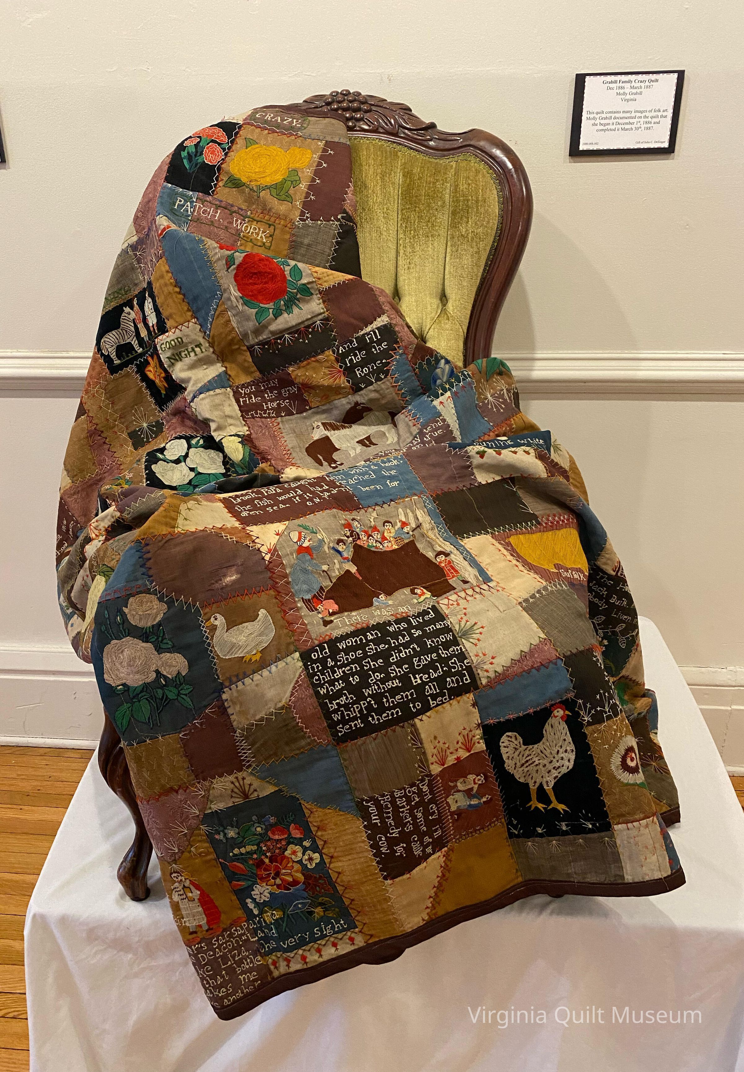 This crazy quilt was made by Molly E. Grabill, who stitched her initials on the quilt.  She made it between the years of 1886 and 1887. This is a folk art quilt in the crazy quilt format. Molly's husband gave land in Rockingham County for the East View School and their kids later attended that school.Collection