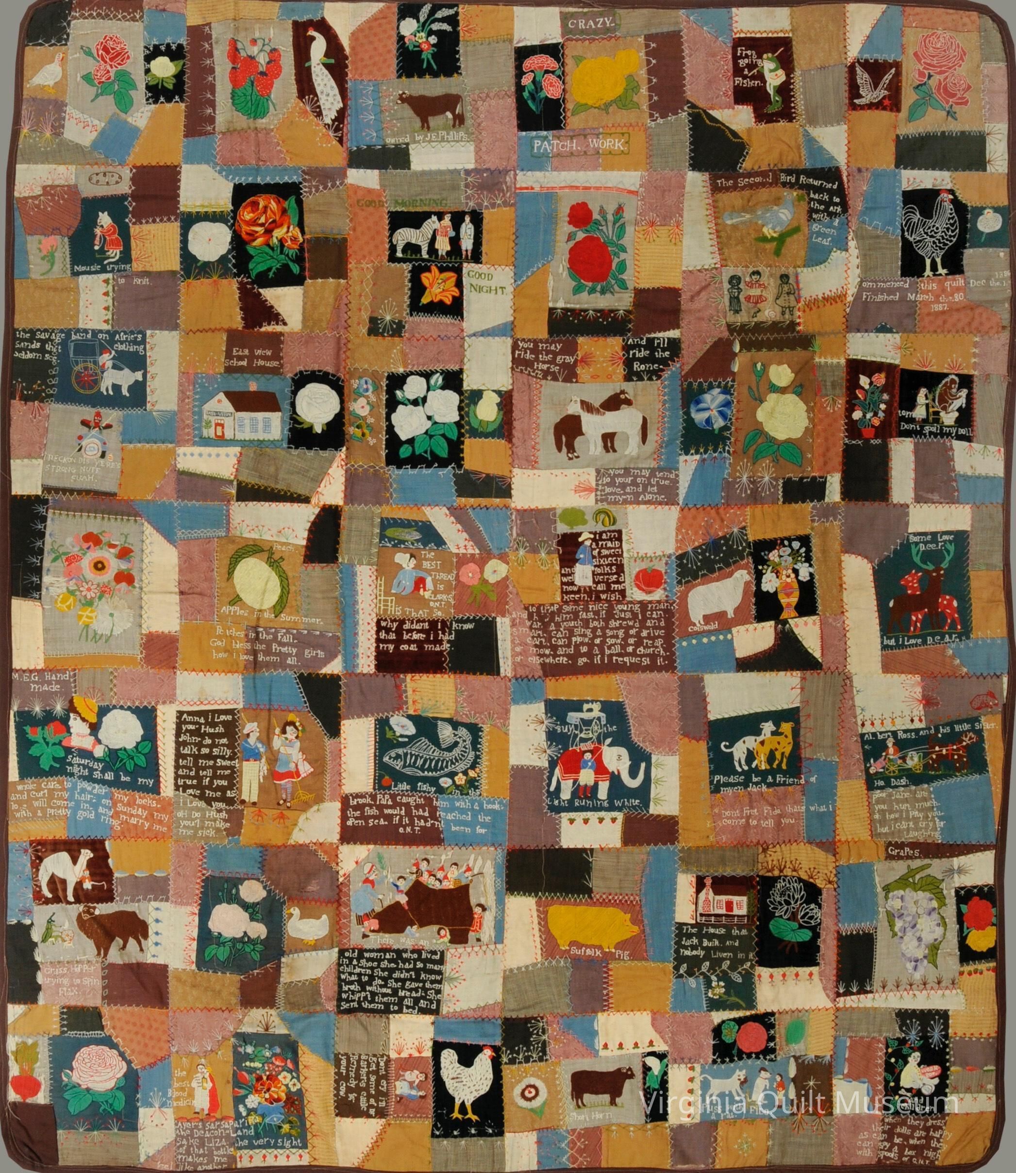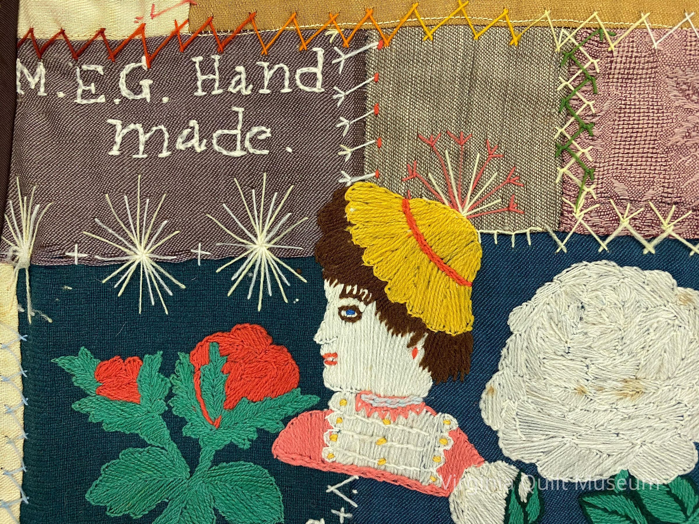 This quilt measured at 68 1/2" x 80" and uses velvet, cotton, brocade, and woven fabrics. It is in the crazy quilt style and consists of 42 blocks measuring 11 inches square. Colors in the quilt include rose, tan, blue, burgundy, and black and are rendered in a variety of fabrics. Embellishments to this quilt make use of appliqué and embroidery techniques and create a storybook style, which includes many sayings of the day and advertising logos, particularly for Clarks O.N.T. thread. In addition to the embroidered "M.E.G., Handmade" on the left quilt front, is the documentation embroidered on the right: "commenced this quilt Dec. the 1, 1886 Finished March the 30, 1887.