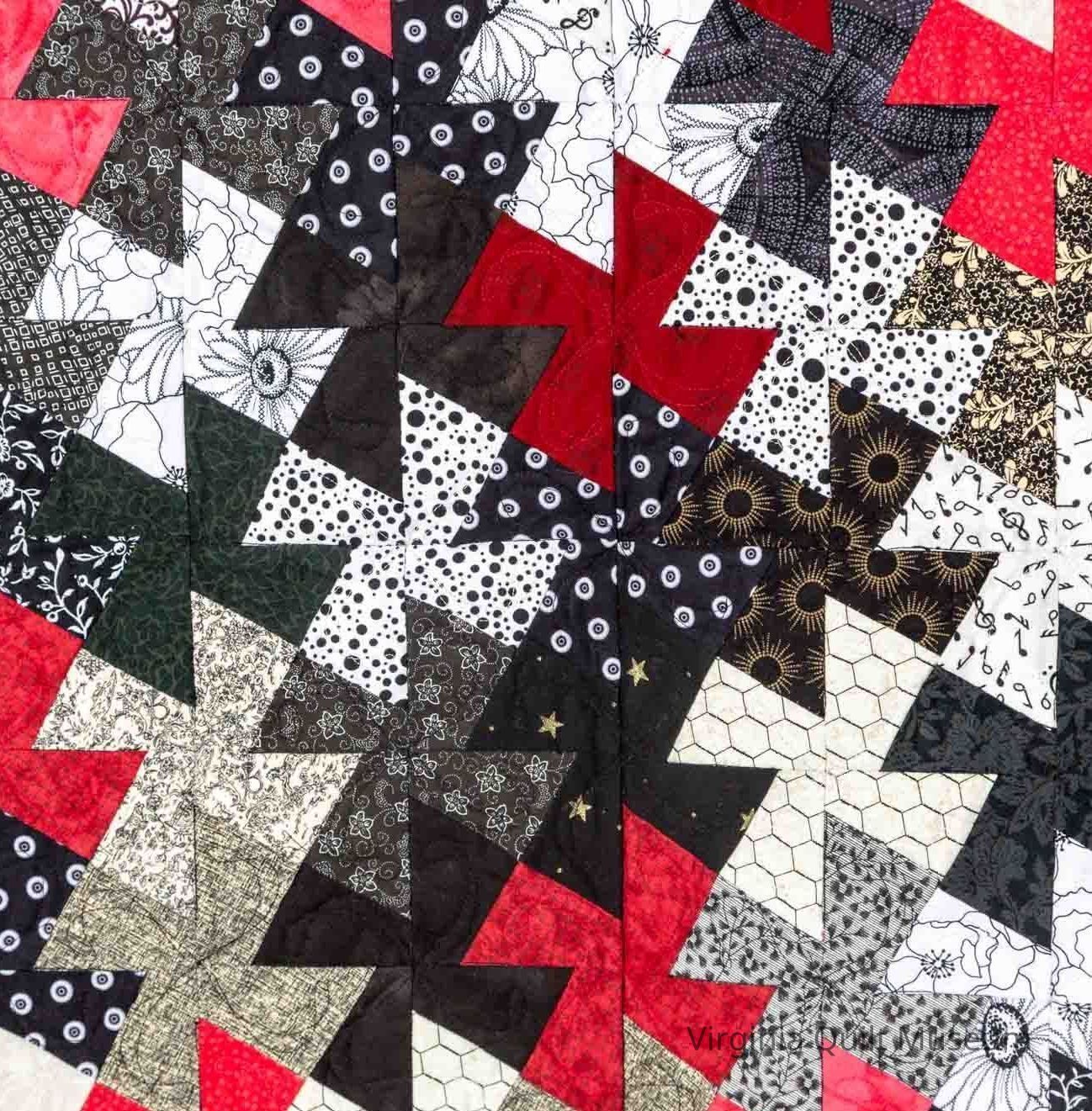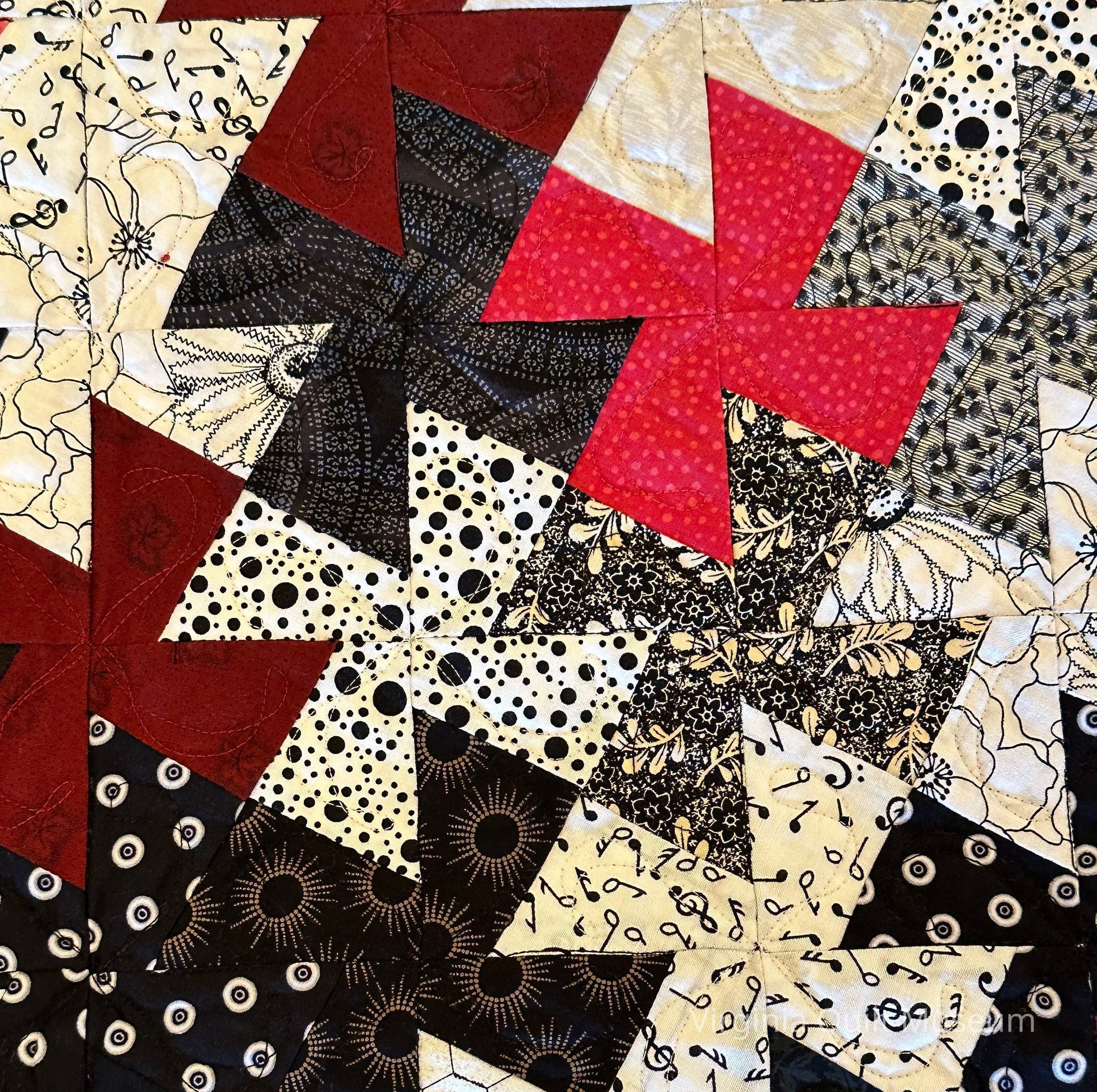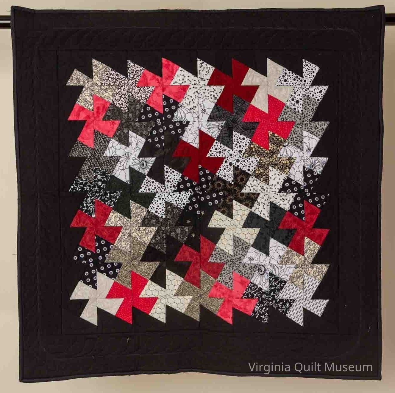 Black, red, white, and gray pinwheel wall hanging, machine pieced and machine quilted. Border has quilting in a feather pattern, center has pinwheel quilting.