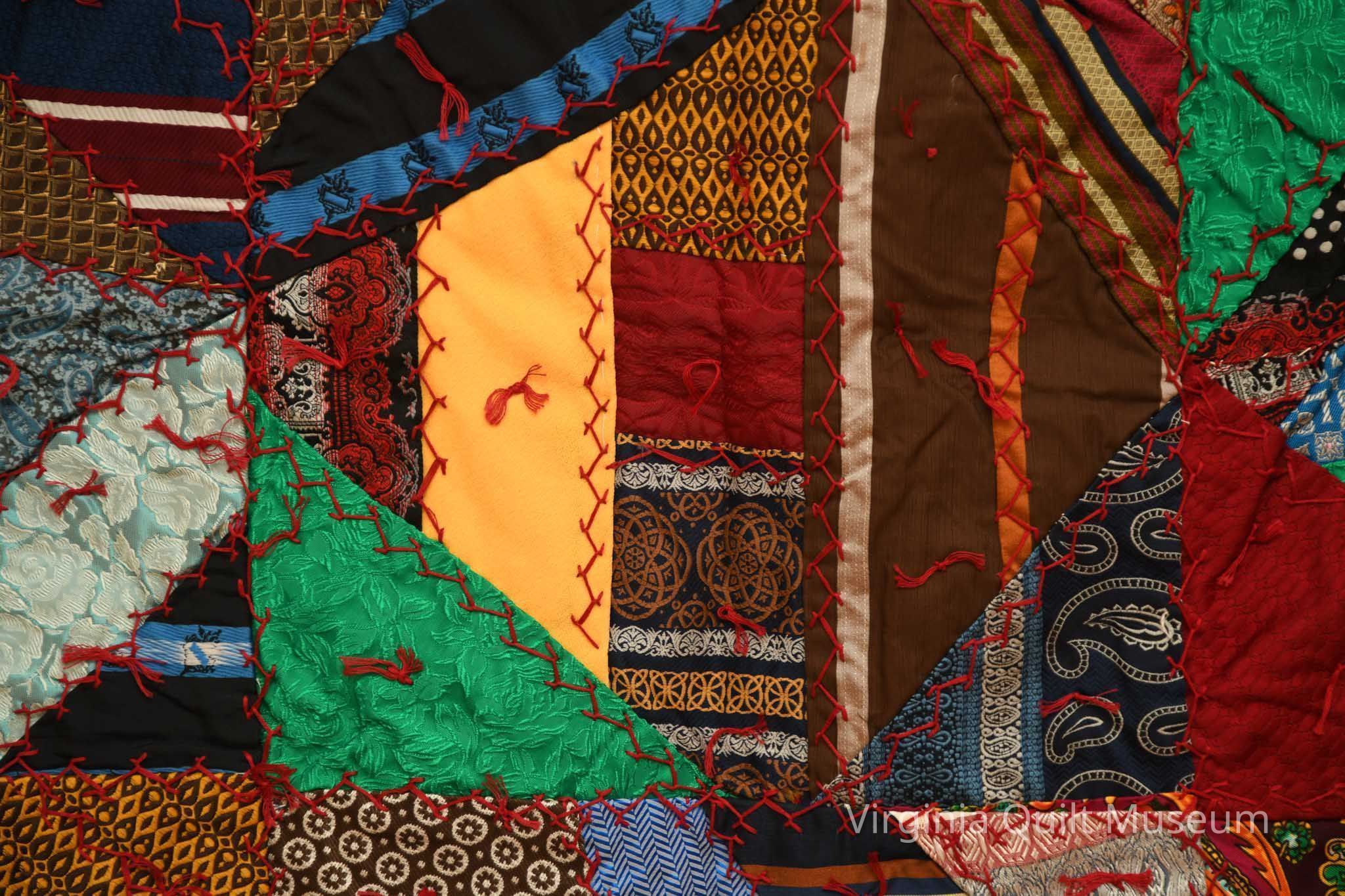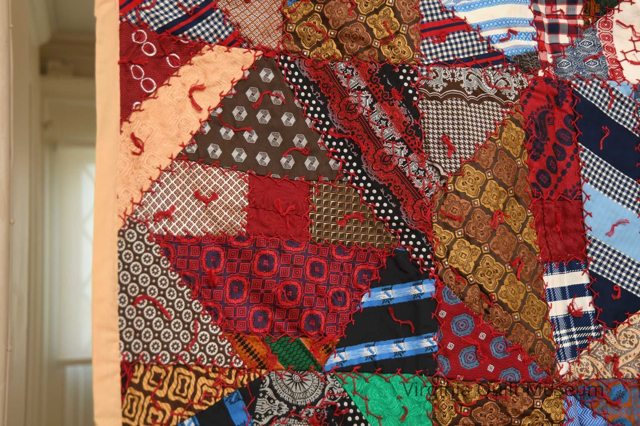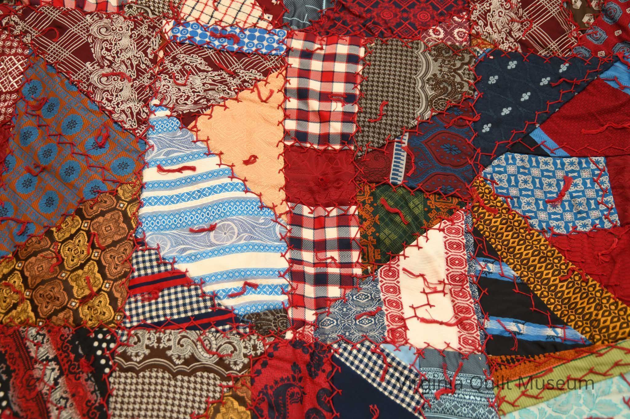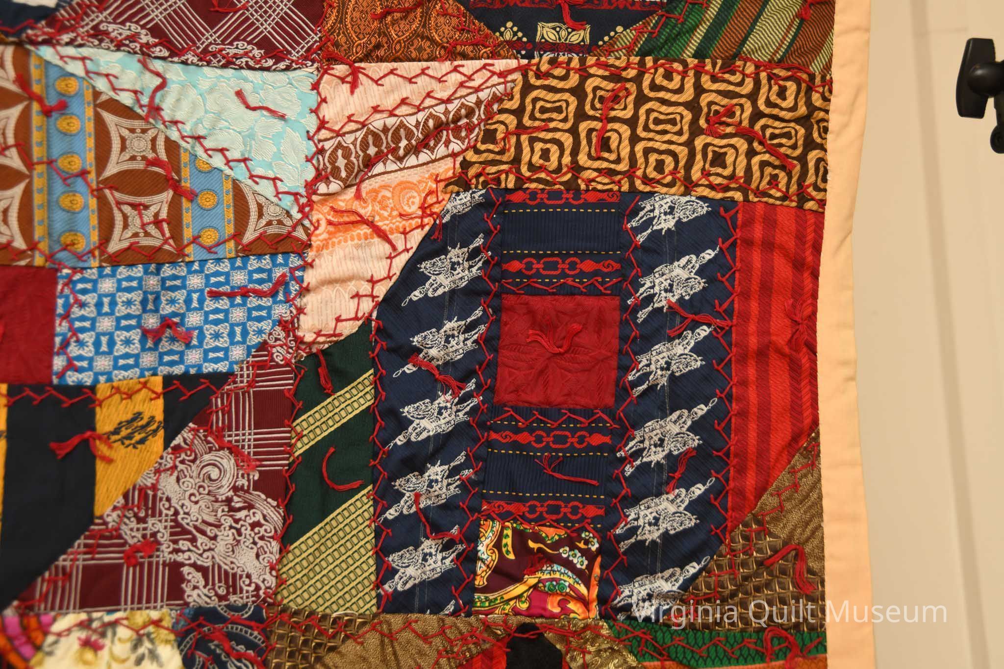 Embroidery done in red embroidery floss. The quilt is tied with knots on the front with red embroidery floss (6 strands).