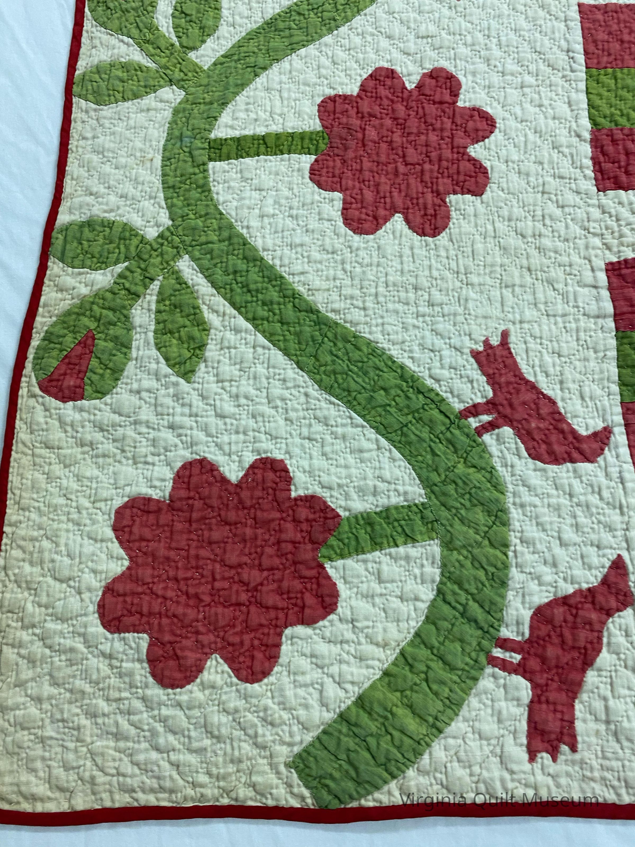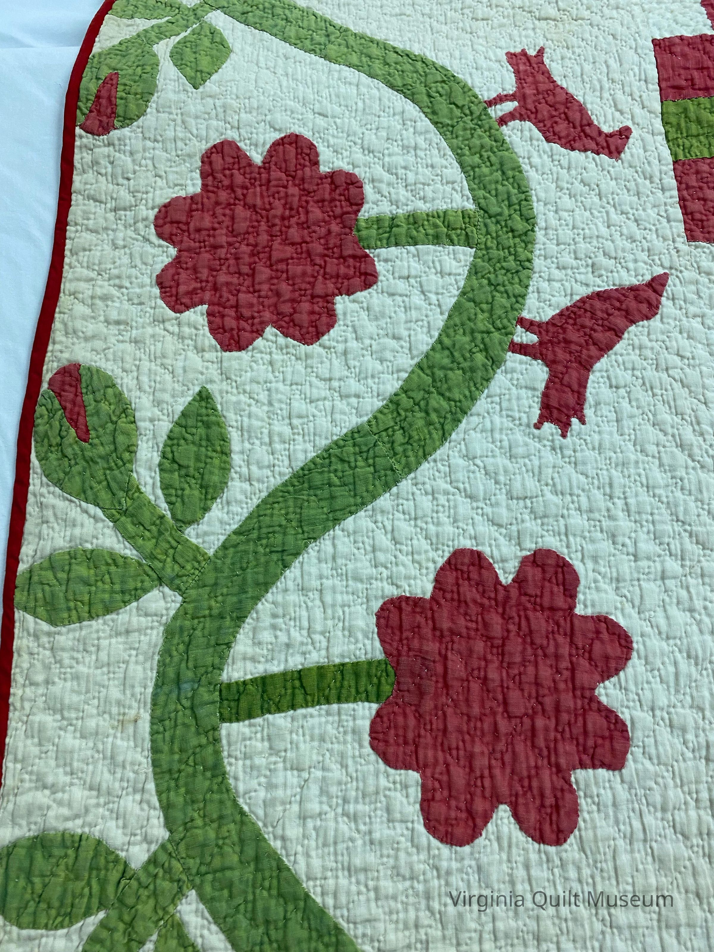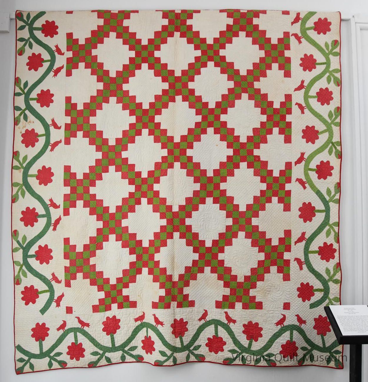 Irish chain quilt set into a grid pattern with a single border around 3 sides of the quilt. The border is 12'' wide and includes a hand appliqued vine with bird and floral motifs. The vine is made out of a green fabric with red flowers, buds, and birds on top.