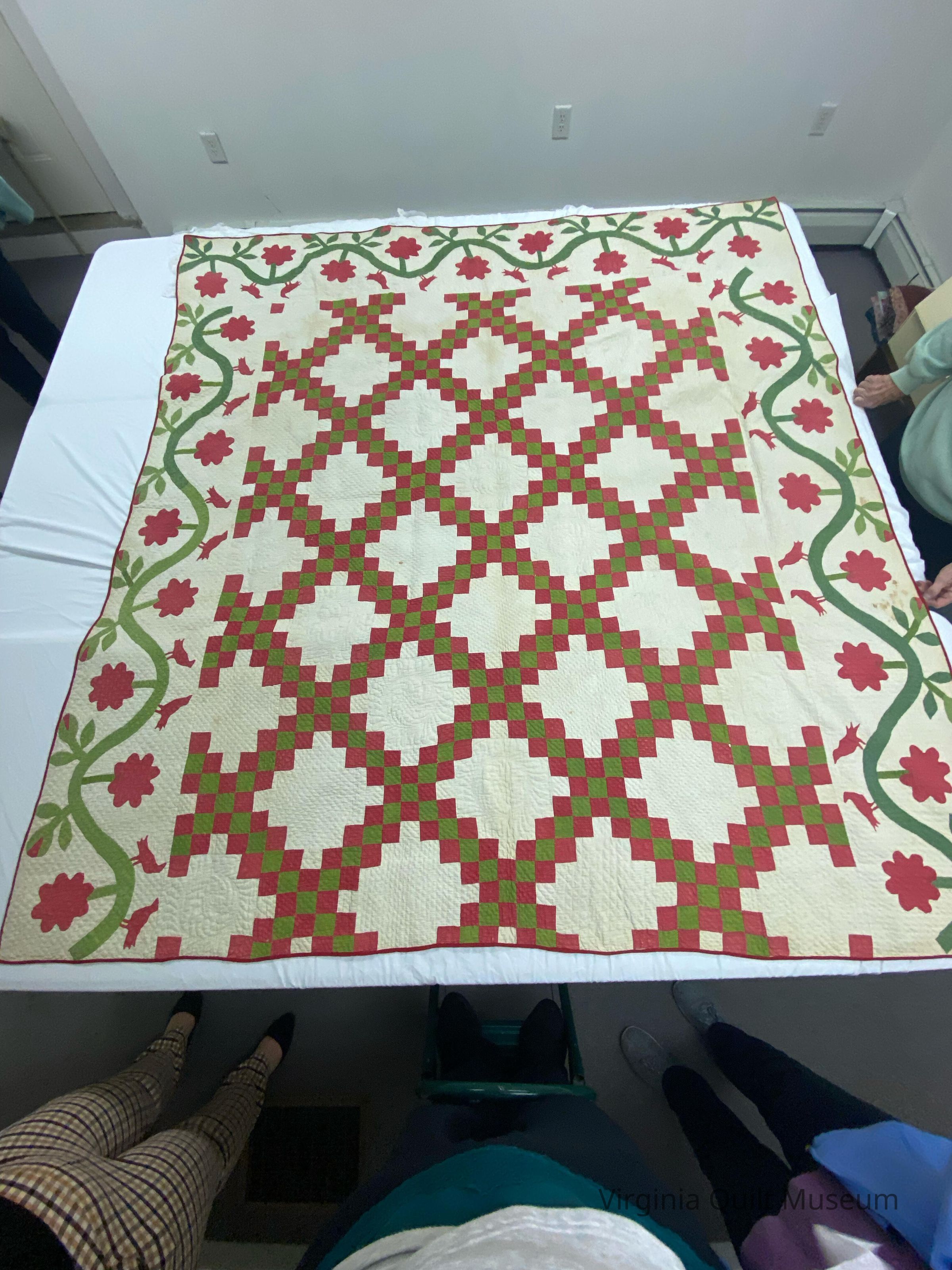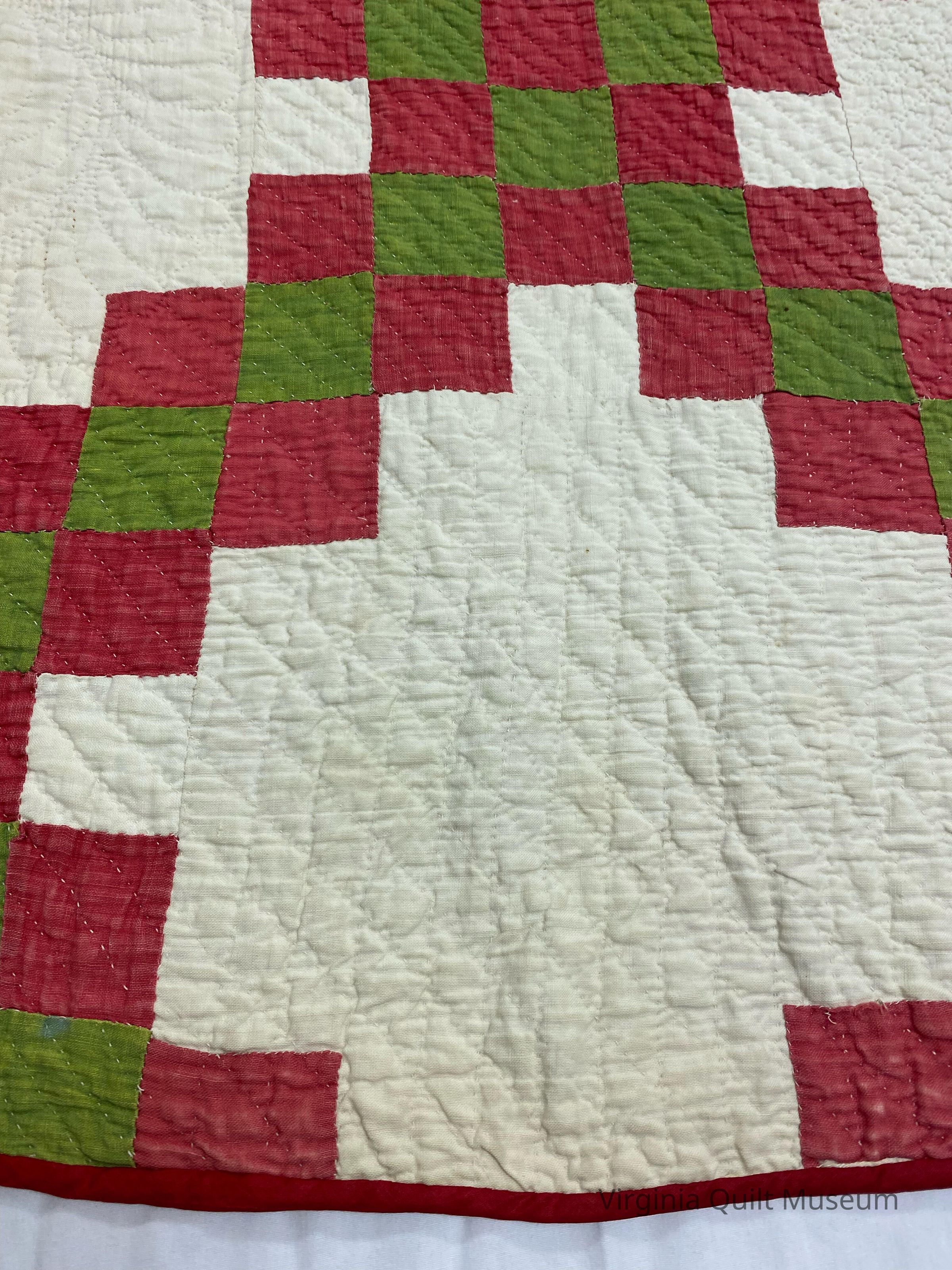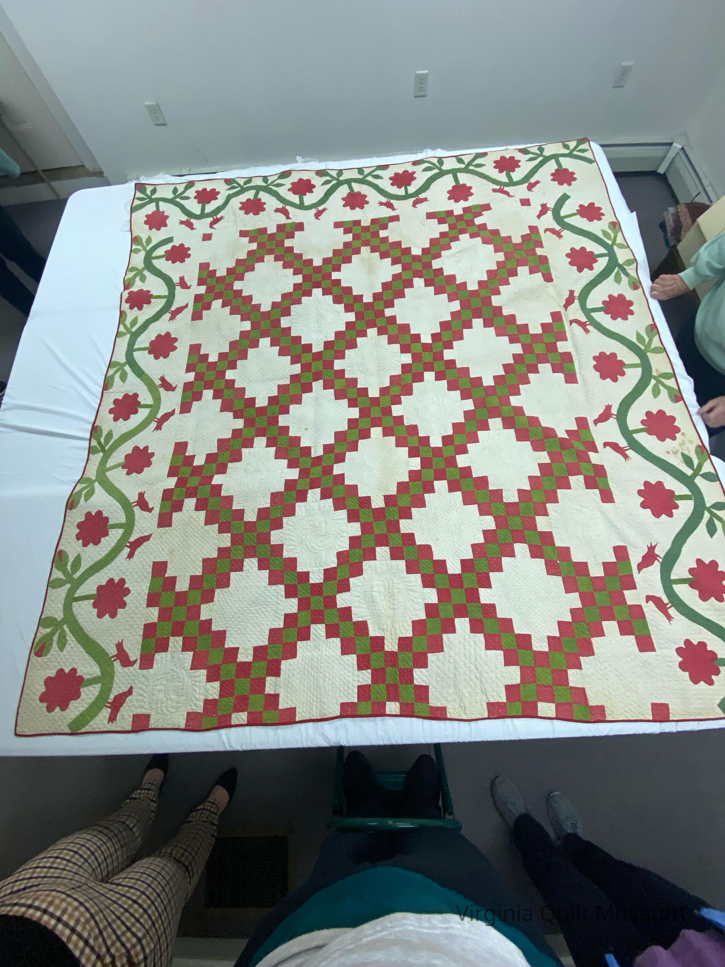 Irish chain quilt set into a grid pattern with a single border around 3 sides of the quilt. The border is 12'' wide and includes a hand appliqued vine with bird and floral motifs. The vine is made out of a green fabric with red flowers, buds, and birds on top.