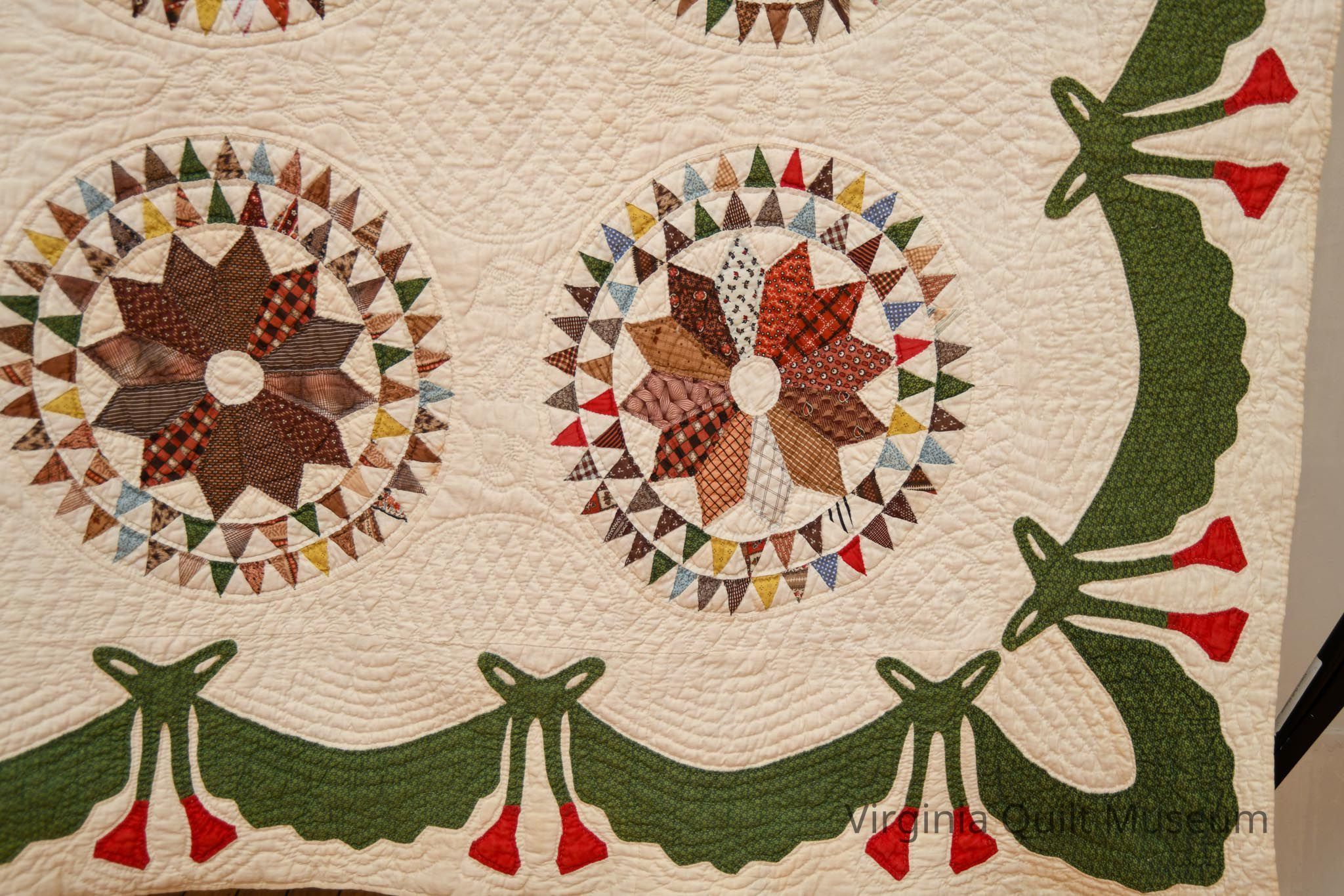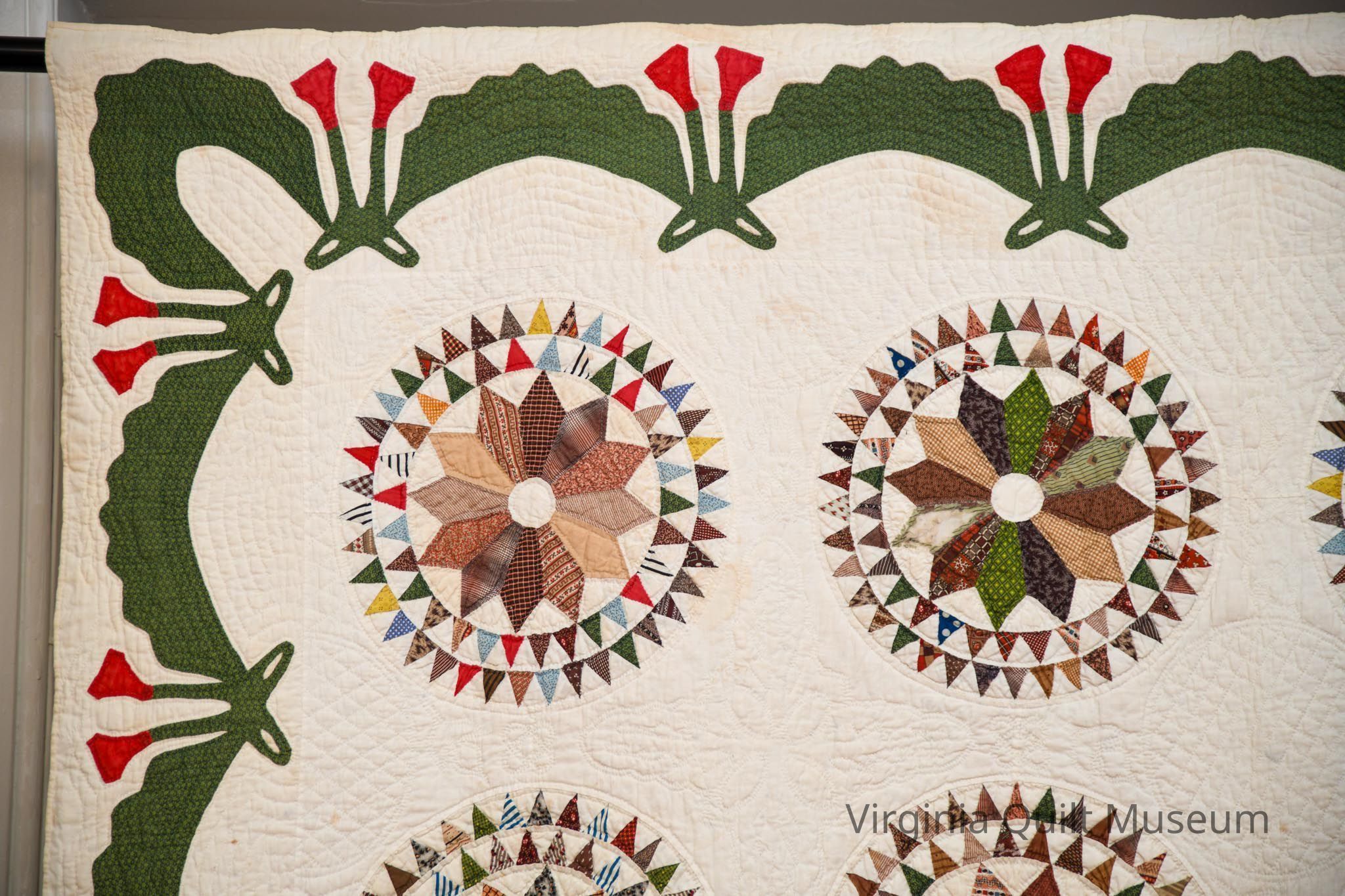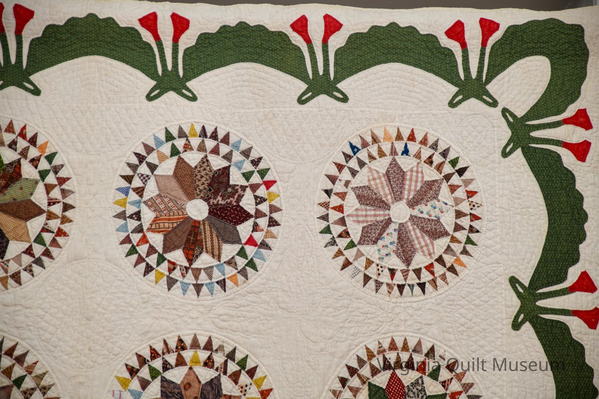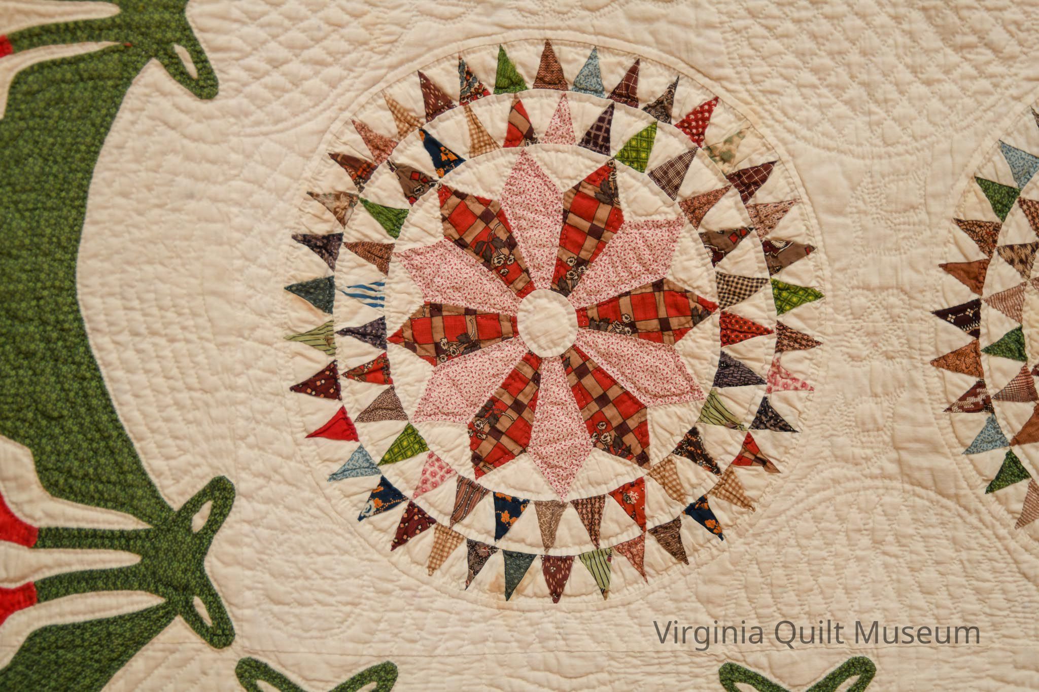 Hand pieced, hand appliqued, and hand quilted Farmer's Fancy quilt. It is dense quilting of diamonds, rosebuds, clovers, circles, and shadow stitching. 20 round designs floating on white ground. Green applique swags with red tassles in border on all sides. Each circle design has two outer rings of triangle points done with multi-colored period prints. There is a 12-point "petal" element inside the rings and a small white circle in the center. There are 37-39 points in the outer rings. Abundant quilting fills the ground. It is noted that the swag boarder is unusual for this pattern as the design is difficult to make.