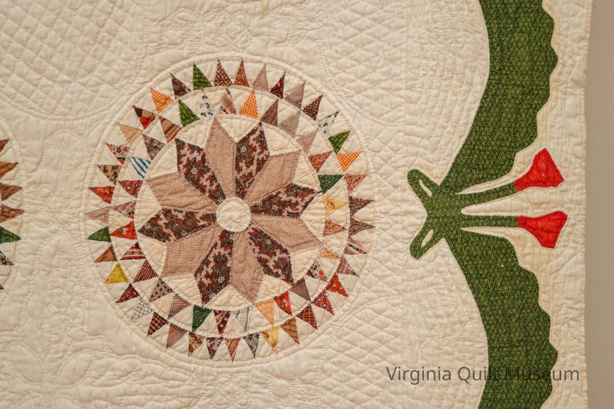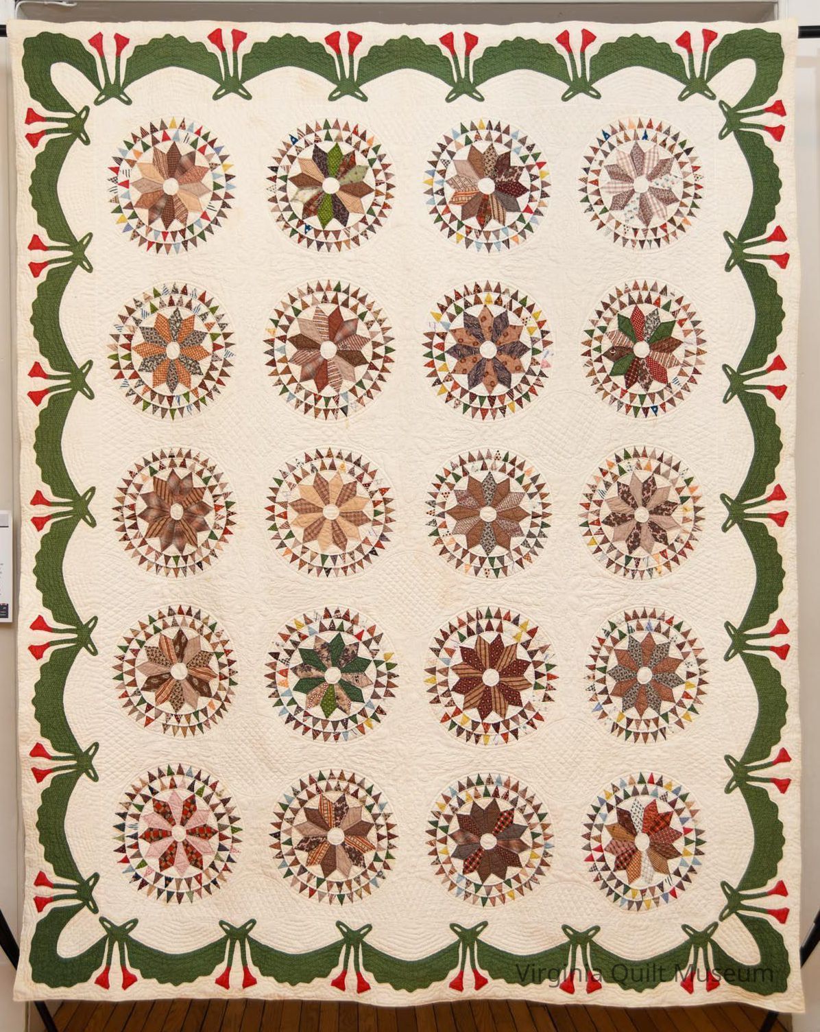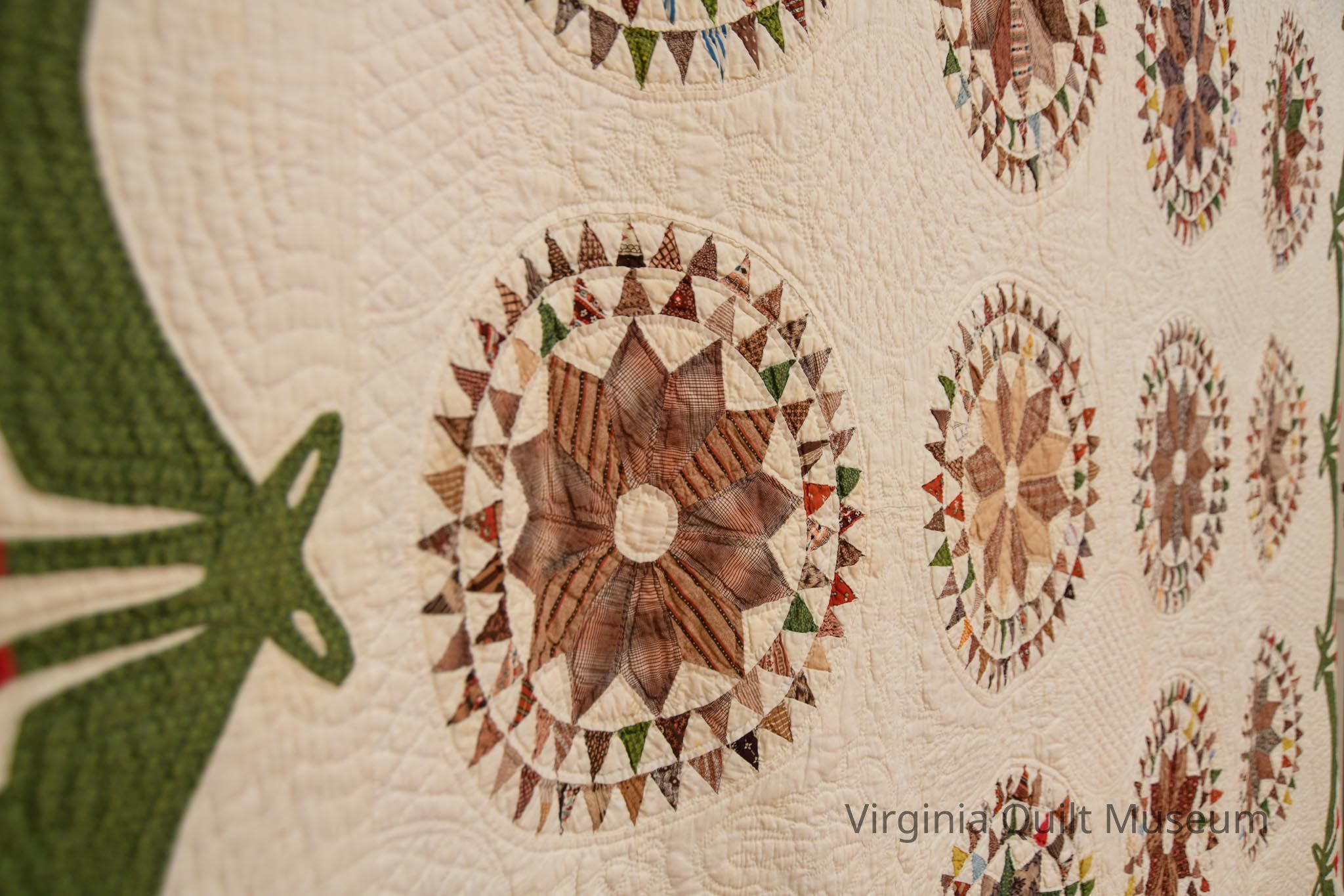 Hand pieced, hand appliqued, and hand quilted Farmer's Fancy quilt. It is dense quilting of diamonds, rosebuds, clovers, circles, and shadow stitching. 20 round designs floating on white ground. Green applique swags with red tassles in border on all sides. Each circle design has two outer rings of triangle points done with multi-colored period prints. There is a 12-point "petal" element inside the rings and a small white circle in the center. There are 37-39 points in the outer rings. Abundant quilting fills the ground. It is noted that the swag boarder is unusual for this pattern as the design is difficult to make.