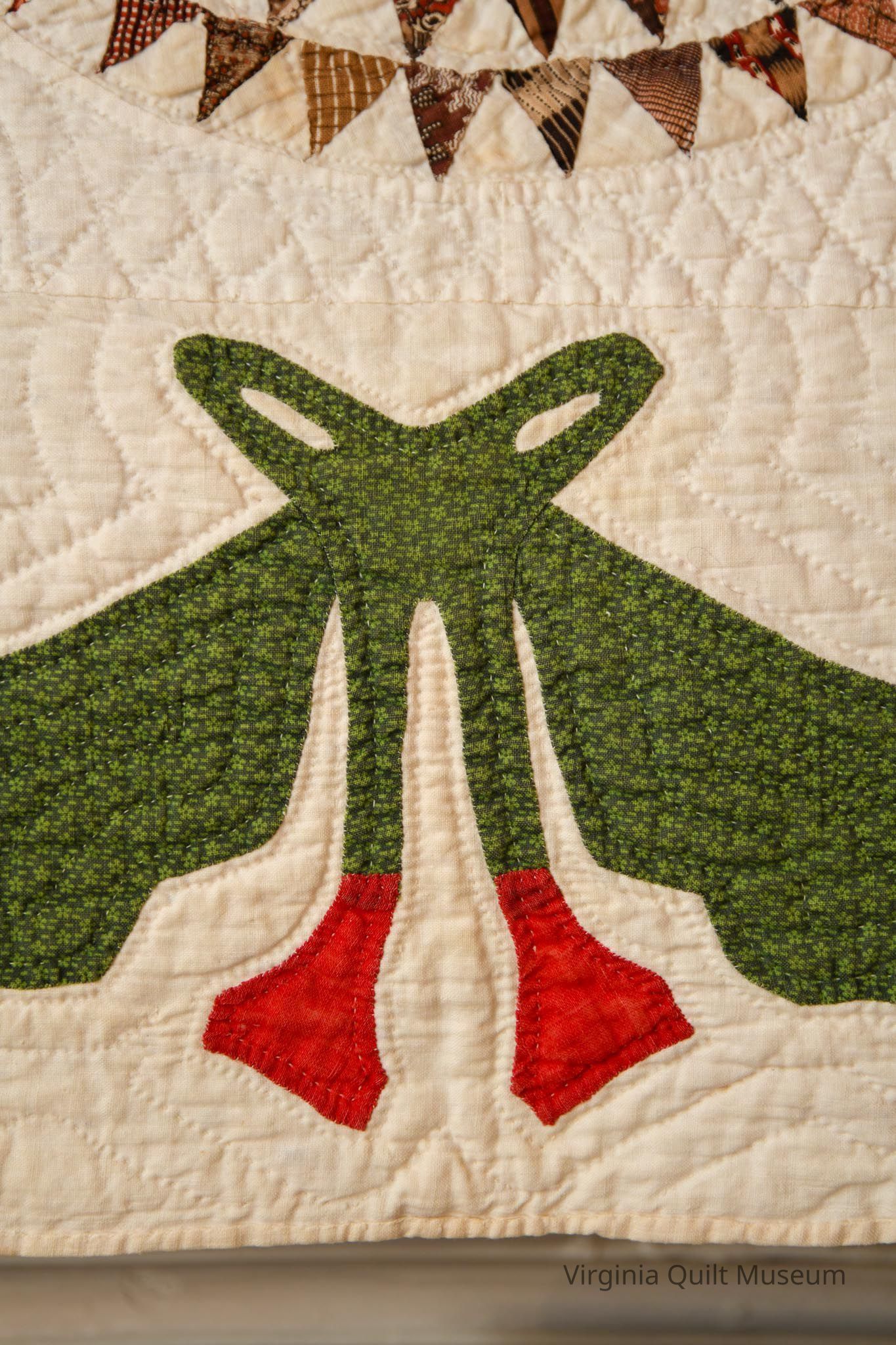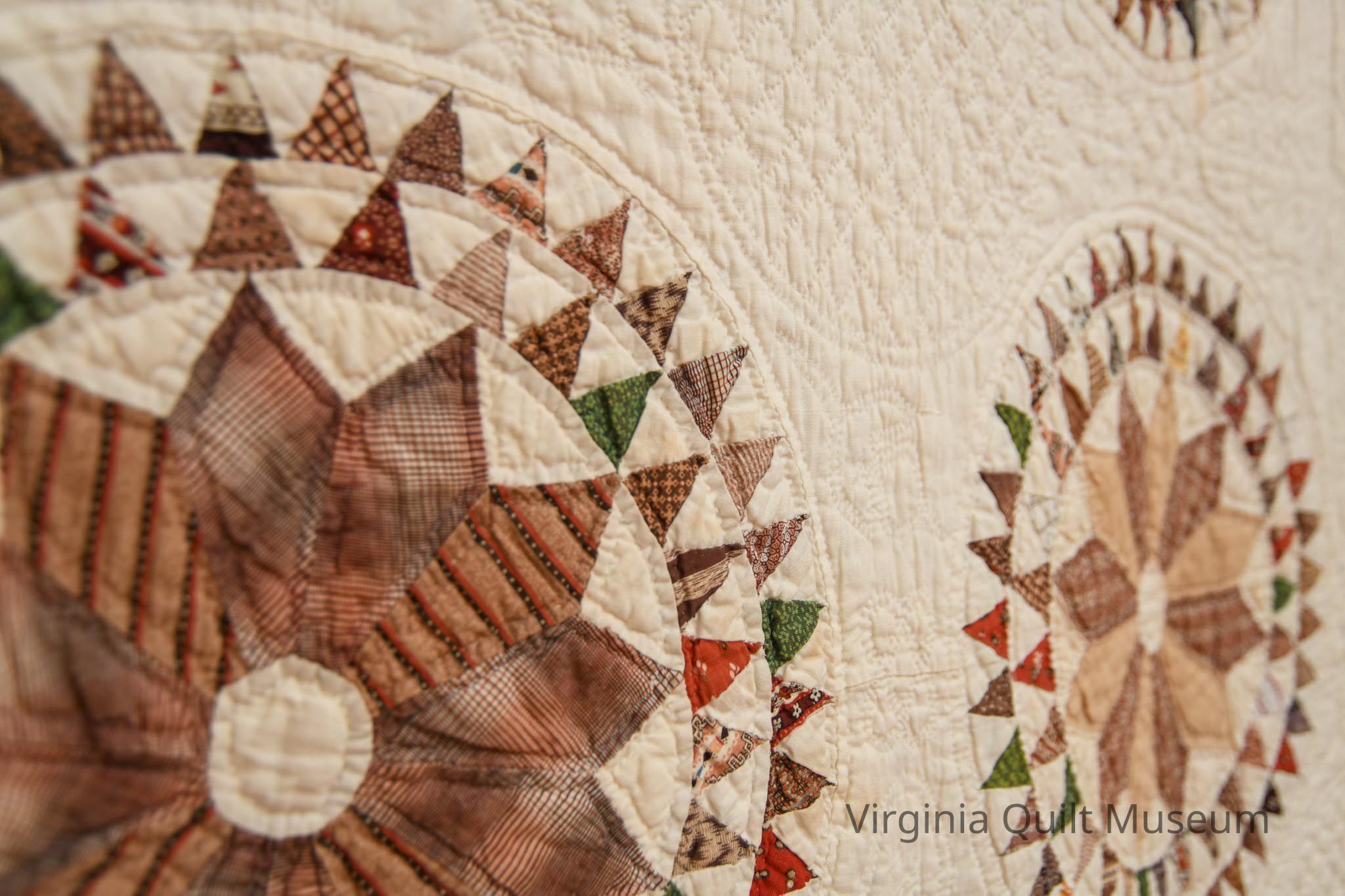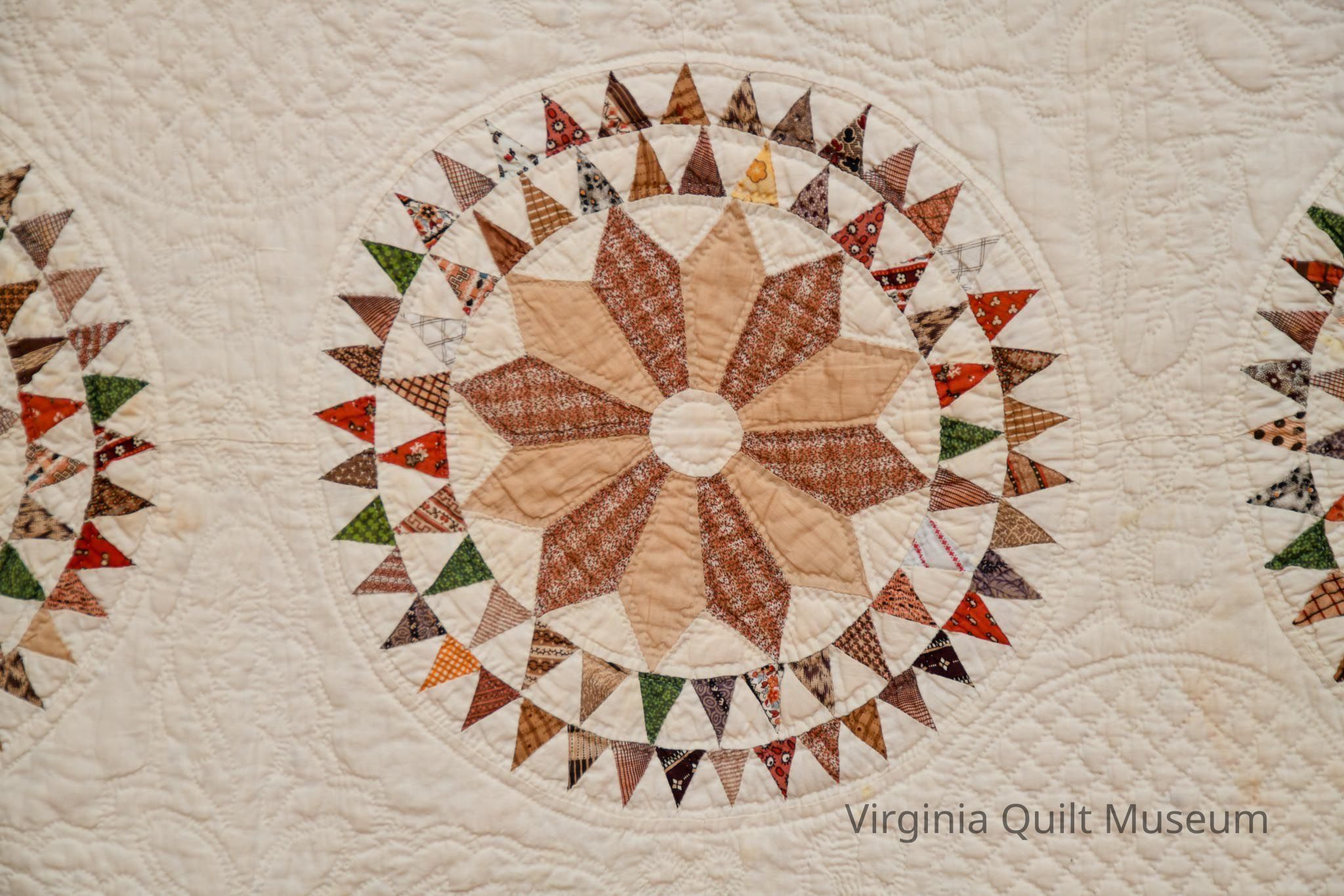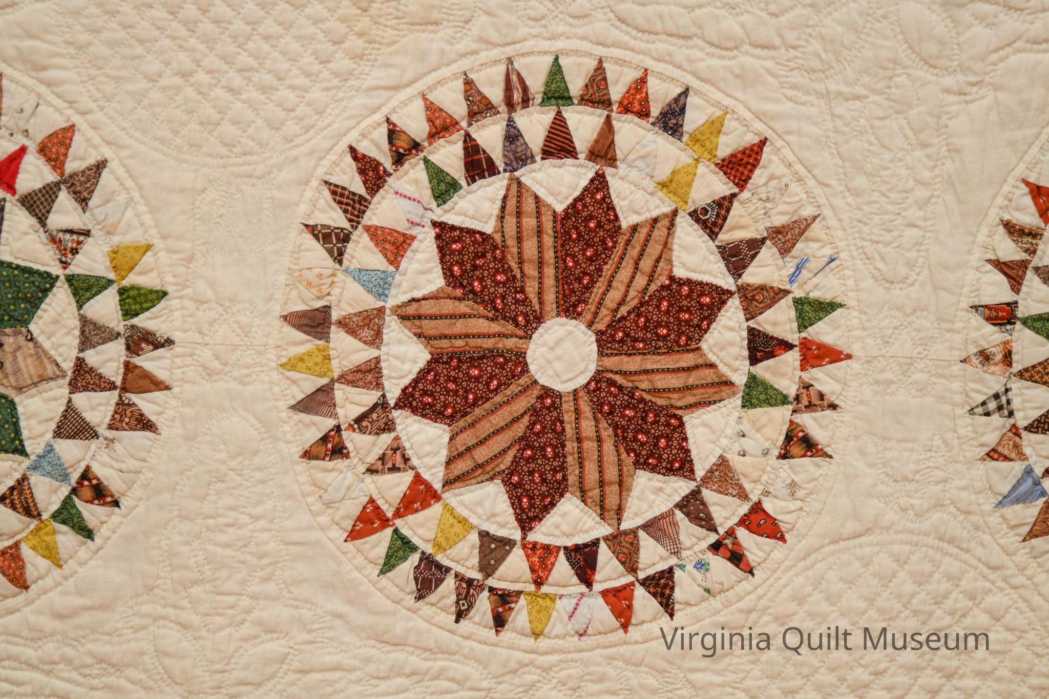 Hand pieced, hand appliqued, and hand quilted Farmer's Fancy quilt. It is dense quilting of diamonds, rosebuds, clovers, circles, and shadow stitching. 20 round designs floating on white ground. Green applique swags with red tassles in border on all sides. Each circle design has two outer rings of triangle points done with multi-colored period prints. There is a 12-point "petal" element inside the rings and a small white circle in the center. There are 37-39 points in the outer rings. Abundant quilting fills the ground. It is noted that the swag boarder is unusual for this pattern as the design is difficult to make.