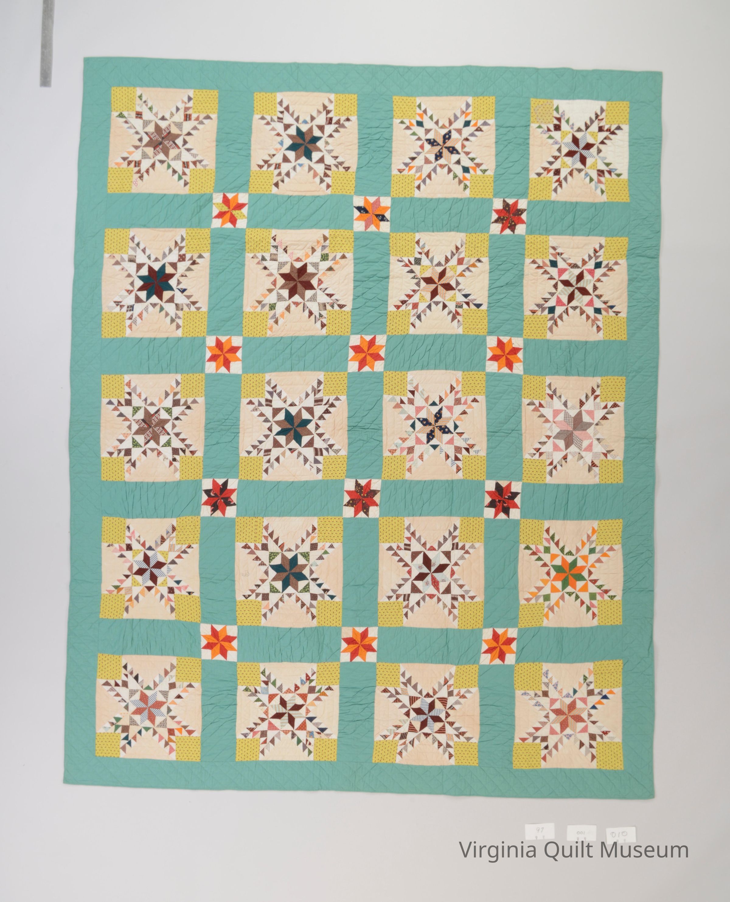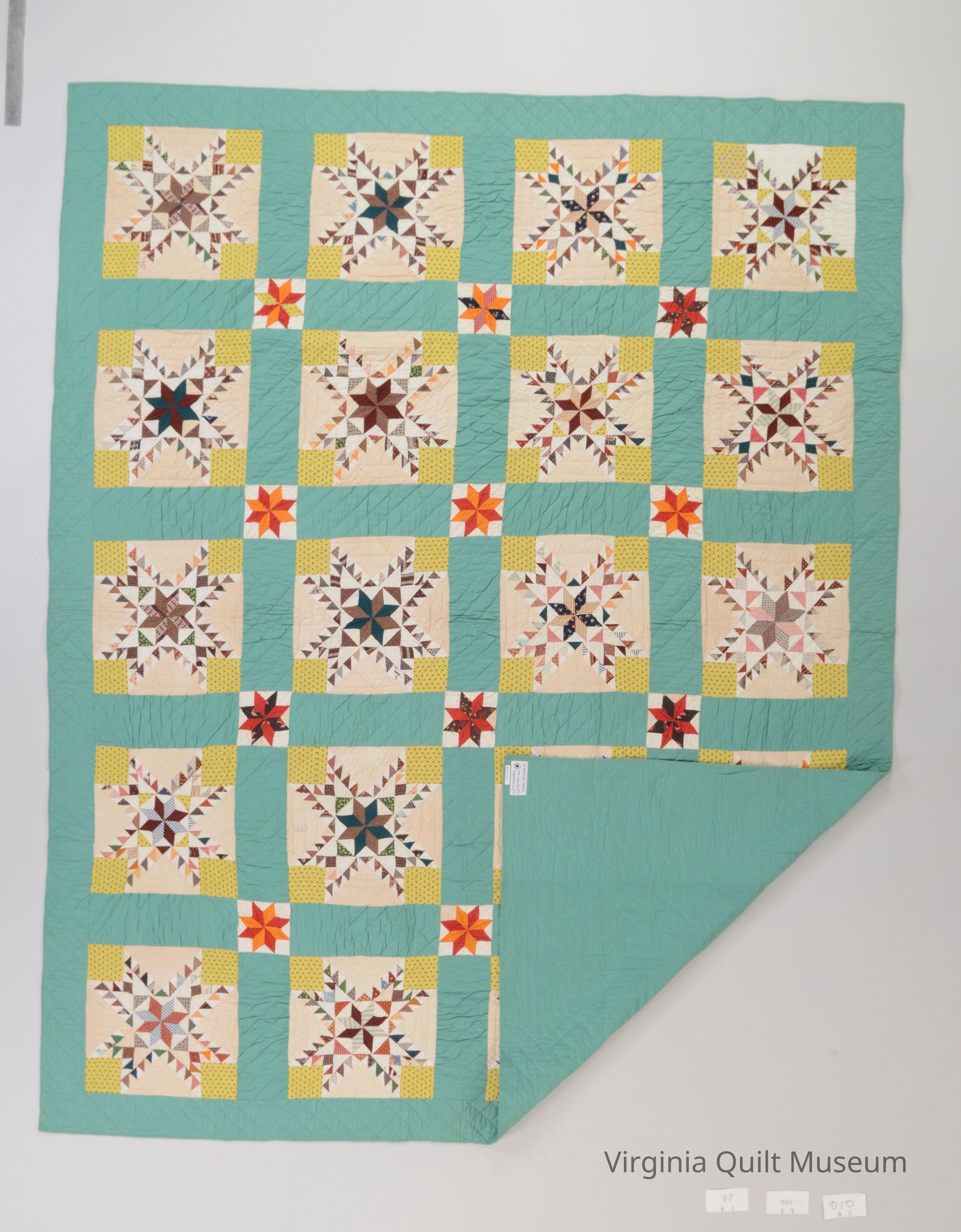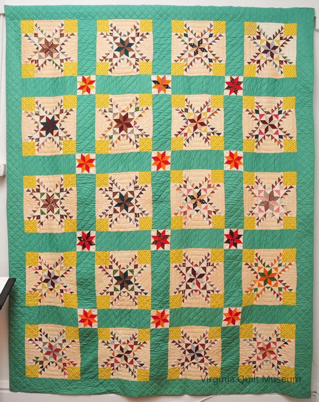 The twenty 15” x 15” Feathered Star blocks in multi-colored scrap fabrics made in the 1870s blocks were pieced much earlier by Ellen Rebecca Spitzer (Jan. 29, 1854 and died Sep. 16, 1933). Her niece, Emma Mabel Baldwin Spitzer (1882 – 1997), later had the blocks assembled into a quilt by neighbors, Berta and Effie Long of Harrisonburg in the 1930s. The Long sisters also did the sashing in the green color. This green fabric is also the backing. They did many varieties of quilting on this quilt, including crosshatching and straight lines through the eight-pointed stars.