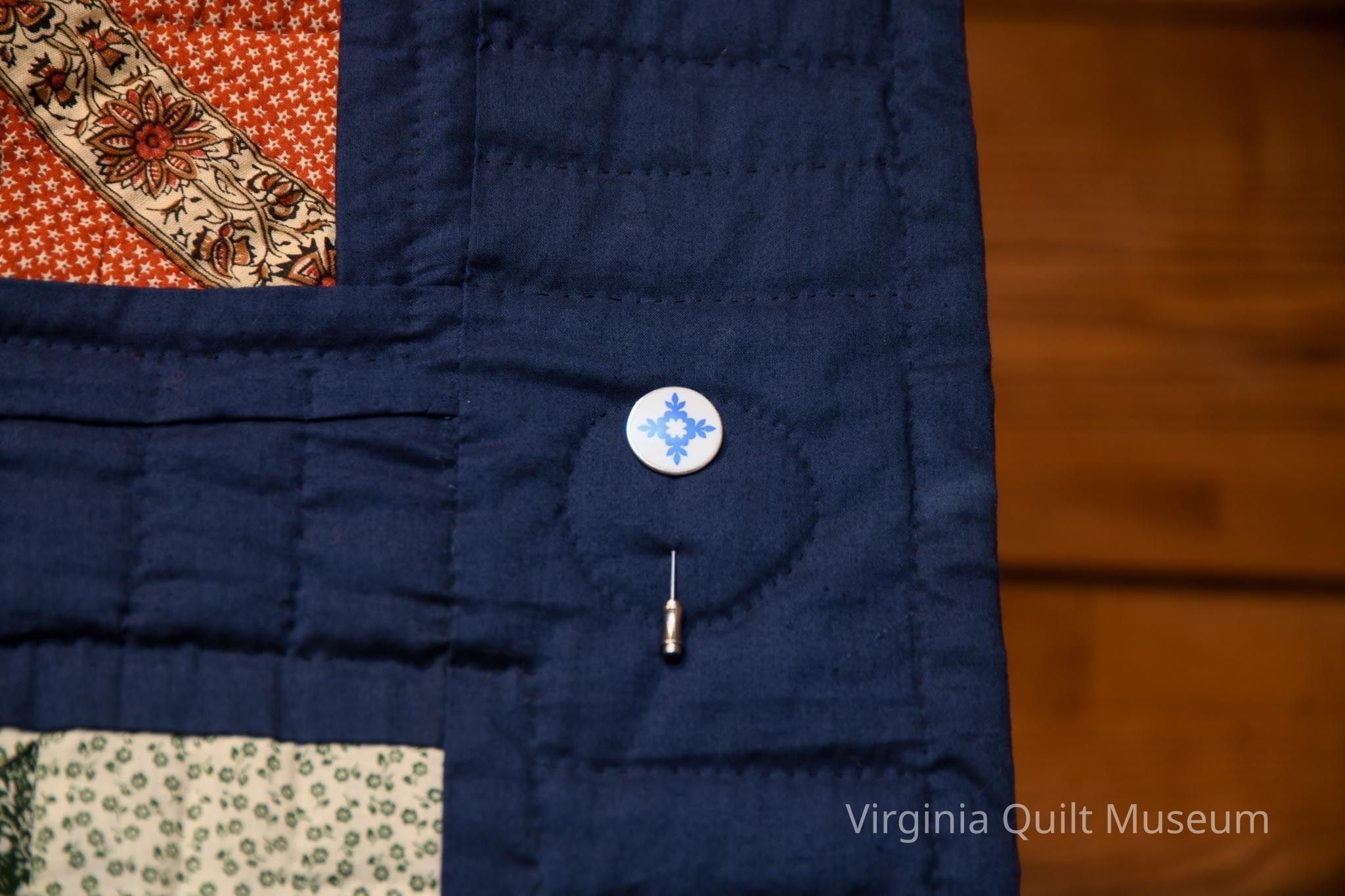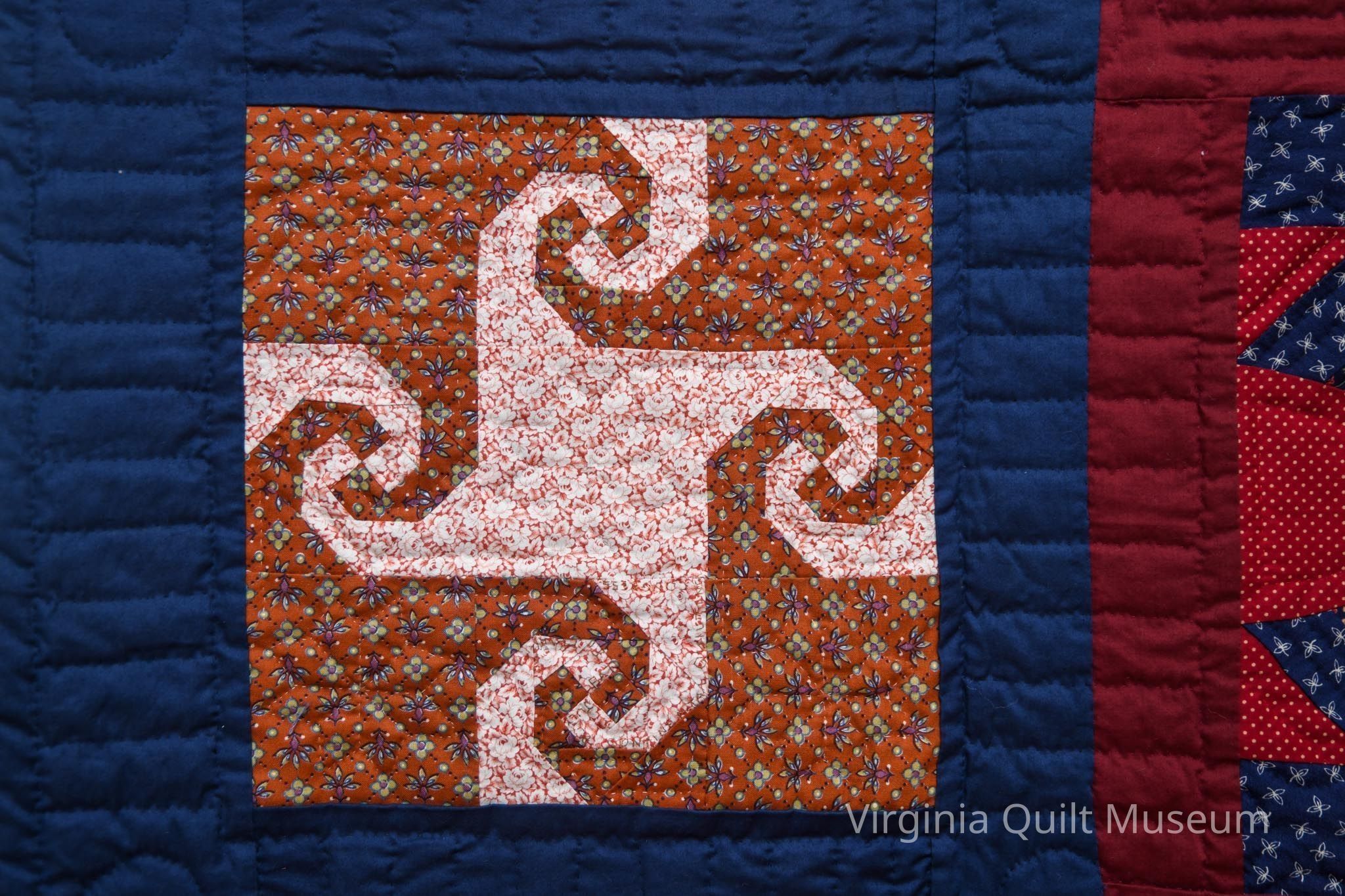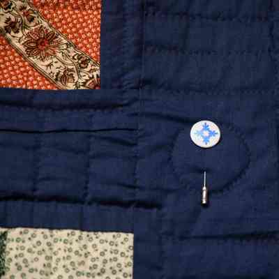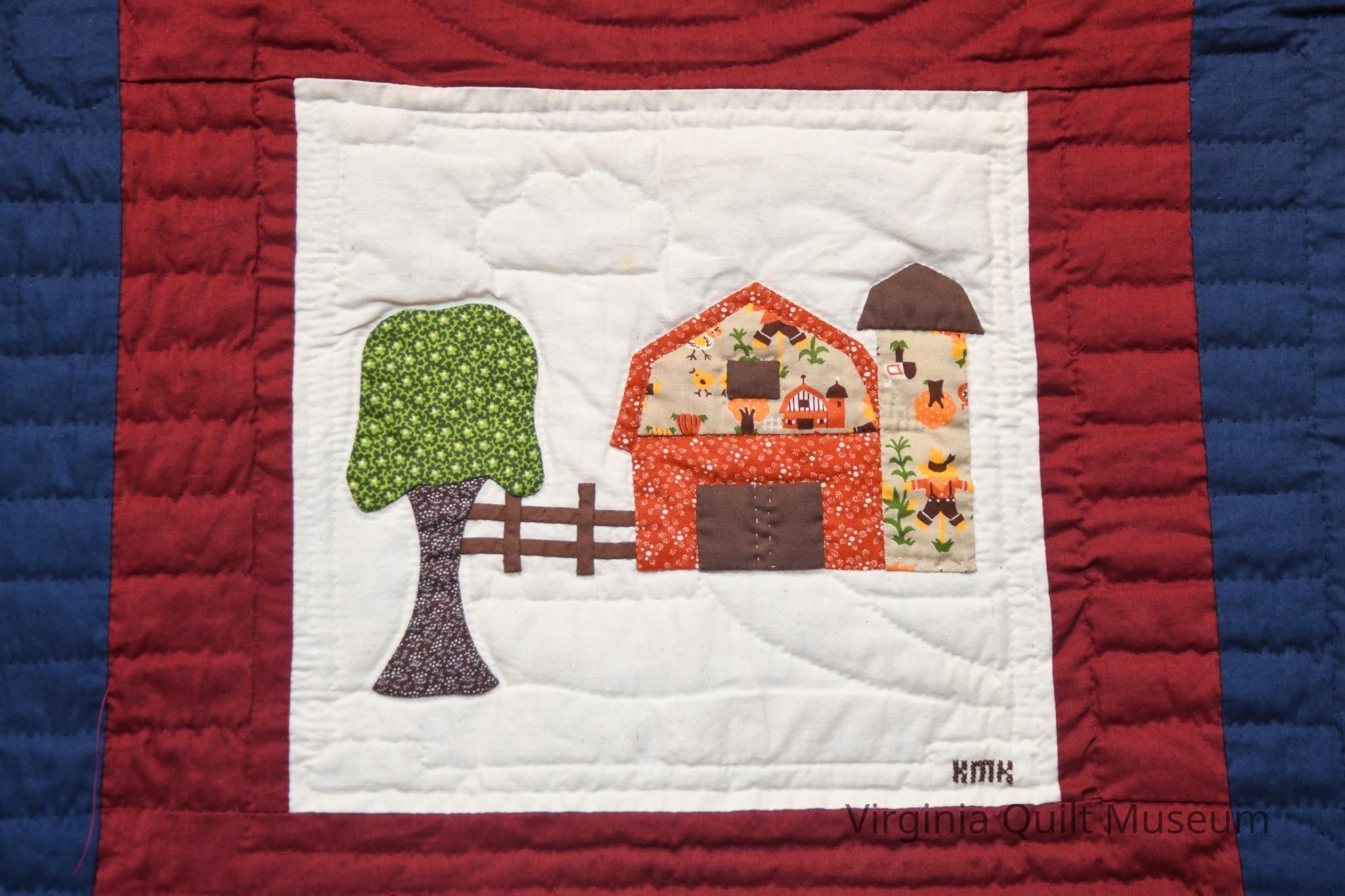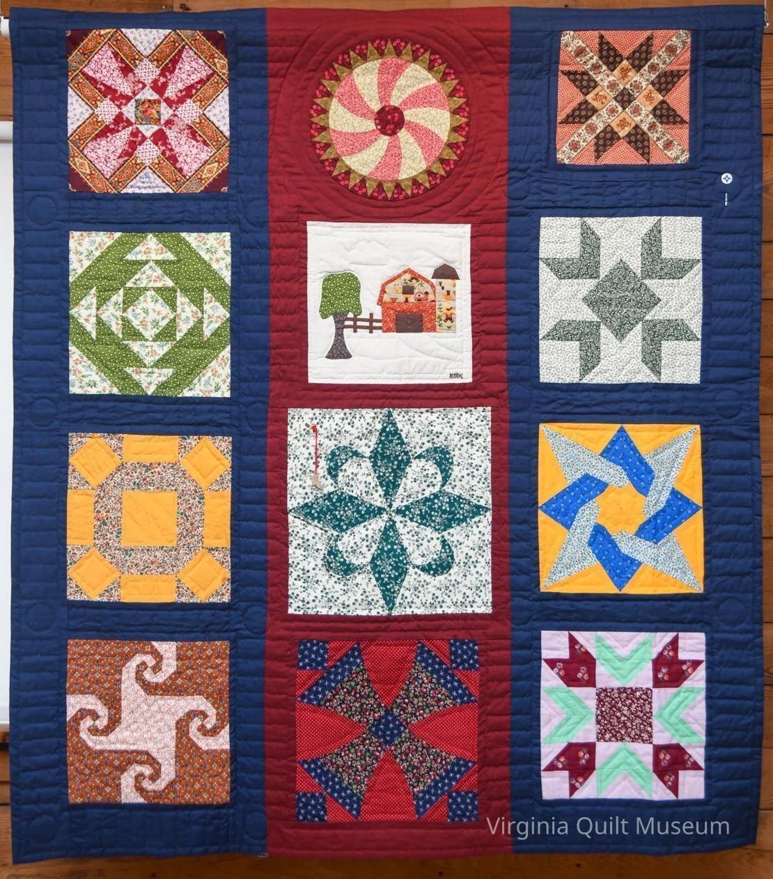 12 different blocks, arranged into a 3x4 grid. Blue sashing frames the blocks on the outside and red sashing frames the center column. Hand quilted with straight lines and circles at each cornerstone.Context