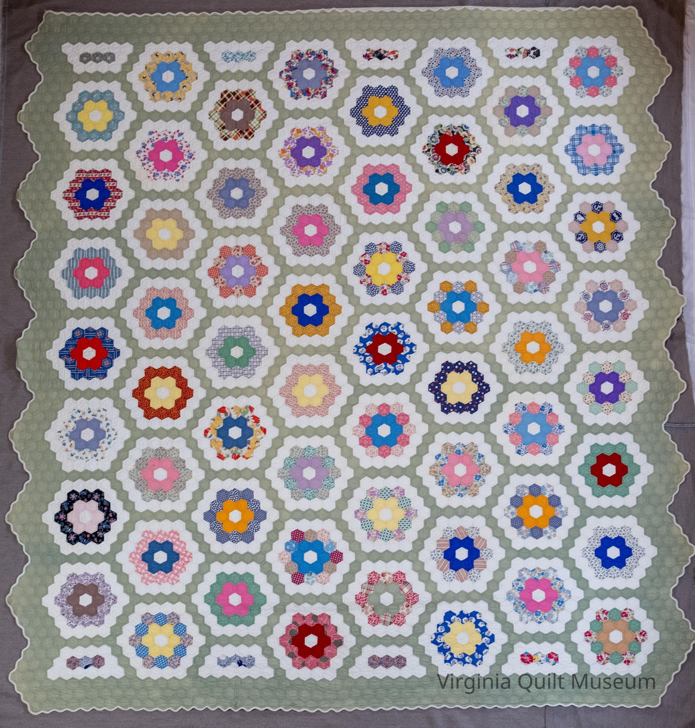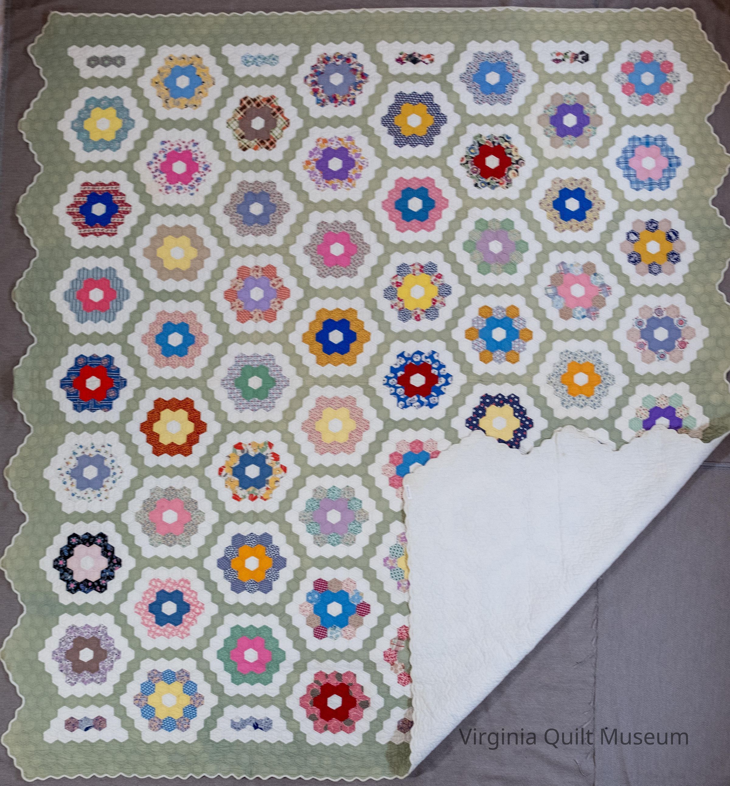 Flowers of hexagons are made with white centers, plain row, and then a row of printed fabric with white fabric surrounding each. Hexagons are 1.5'' across.Context