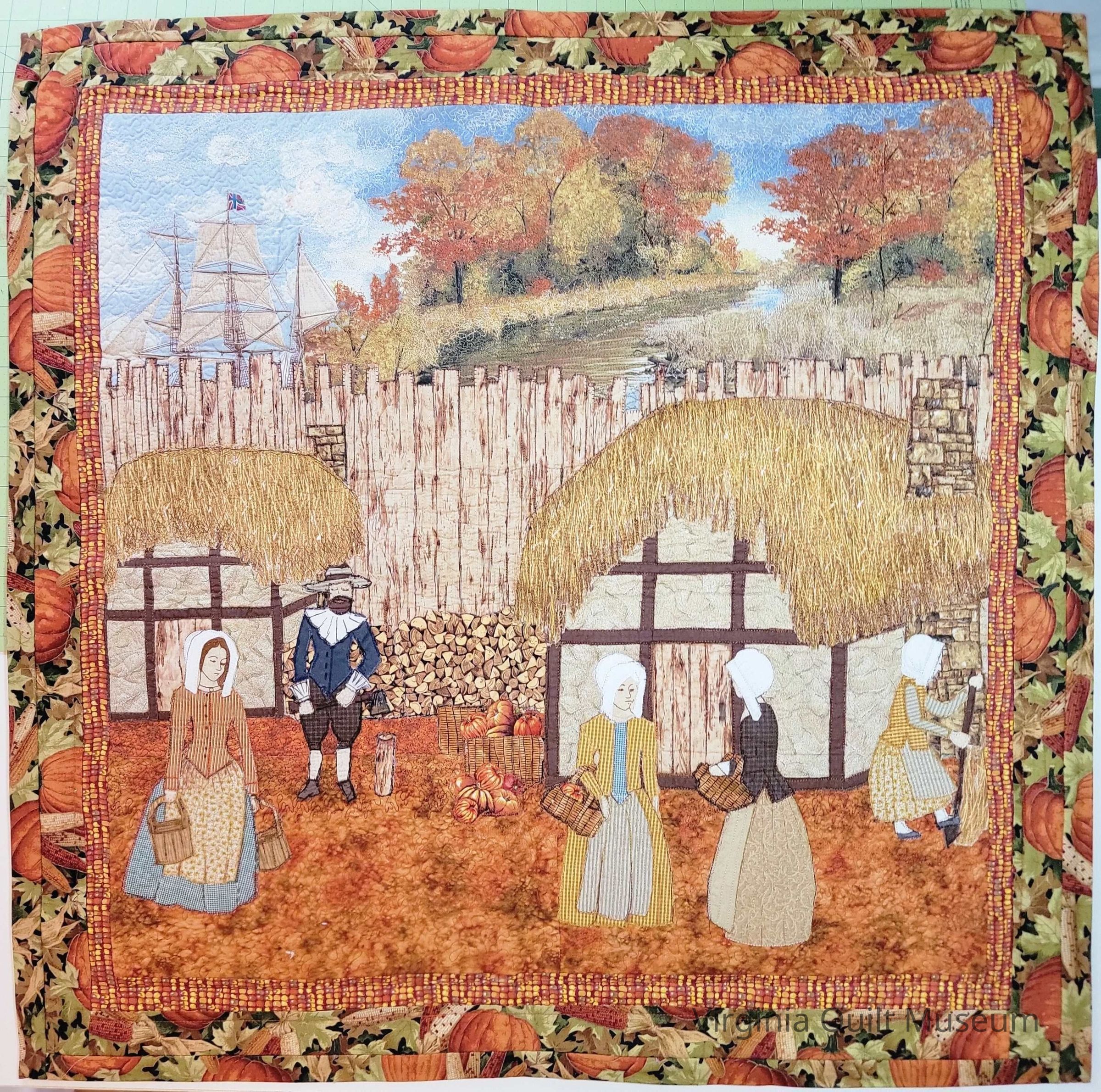 This quilt depicts an autumn scene inspired by life at Jamestown Settlement. In the foreground, several women in colonial dress carry baskets and gather produce, while a male figure stands nearby. Behind them are two timber-frame cottages with thatched roofs, enclosed by a wooden palisade fence, with pumpkins and firewood reinforcing a harvest theme. In the background, trees in fall foliage line a gently rising landscape beneath a blue sky, and a sailing ship appears at left. The composition is framed by coordinating borders, including a pumpkin-patterned outer border, and features extensive machine embroidery that adds texture and detail throughout.Context