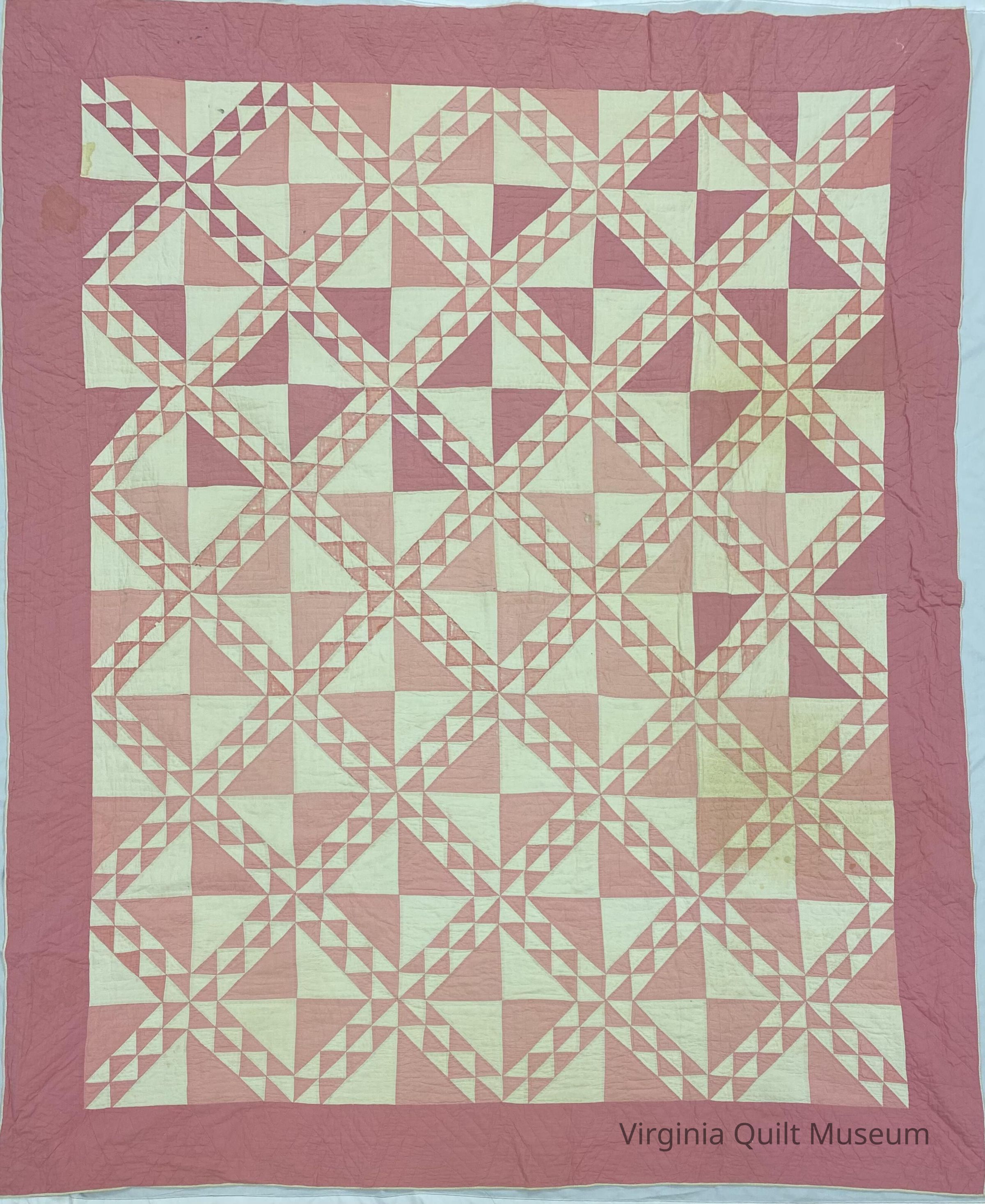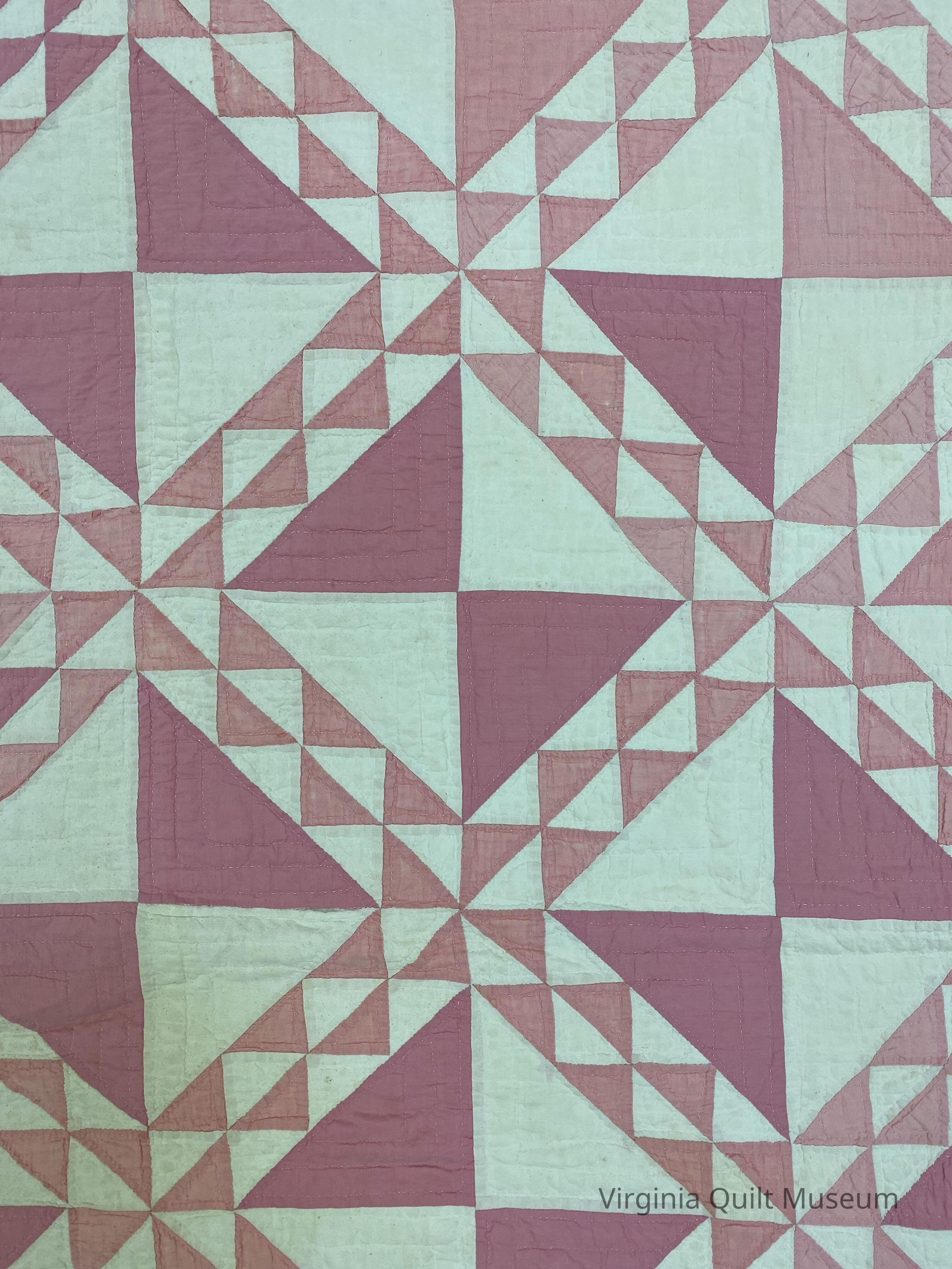 Pink hand pieced and hand quilted quilt.Context