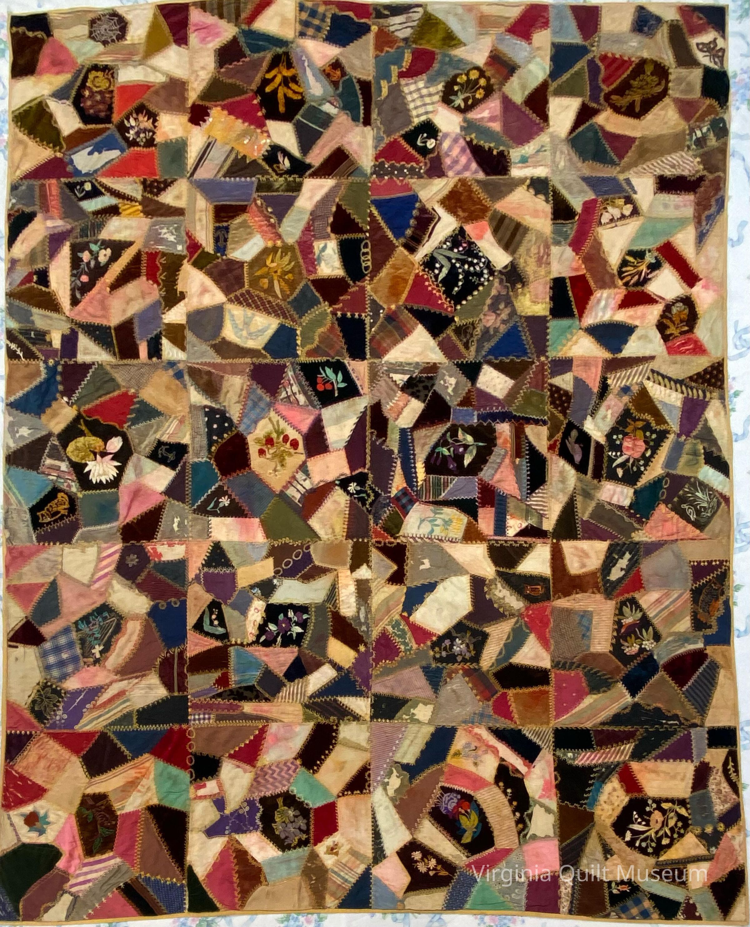 Crazy Quilt with scraps of silk and velvet. The quilt was constructed in a potholder style, with 4 blocks by 5 blocks for a total of 20 blocks. The blocks are set in a grid pattern with no border.