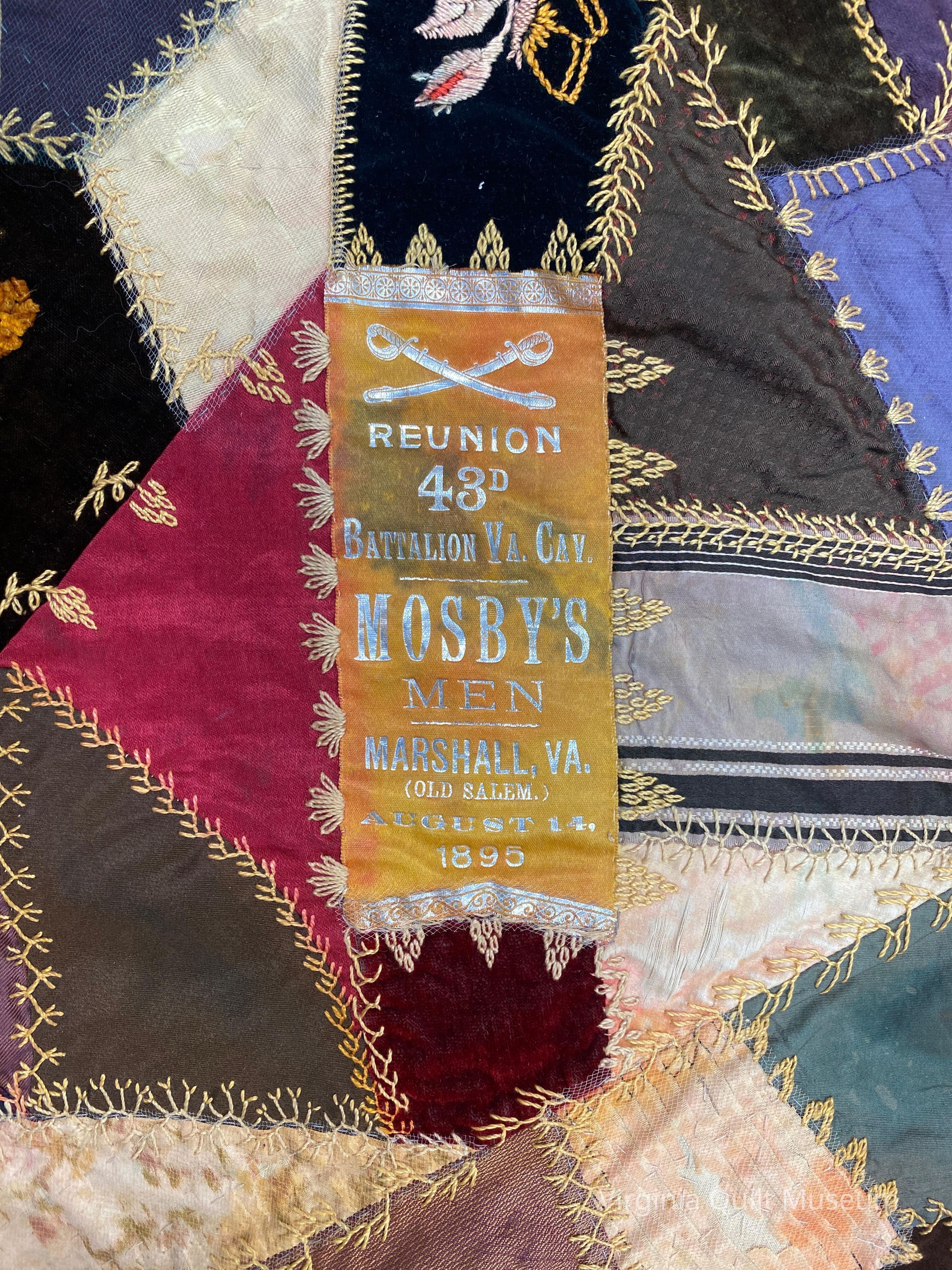 John Aylor served with the Mosby Rangers, a Confederate Cavalry during the Civil War. After he was caught and imprisoned, he and the other Rangers were released two months after the surrender at Appomattox Court House. John married Nannie Sutton after the war and the two lived in Charlottesville, Virginia. She made this quilt and included his Mosby reunion ribbons from 1895.Collection