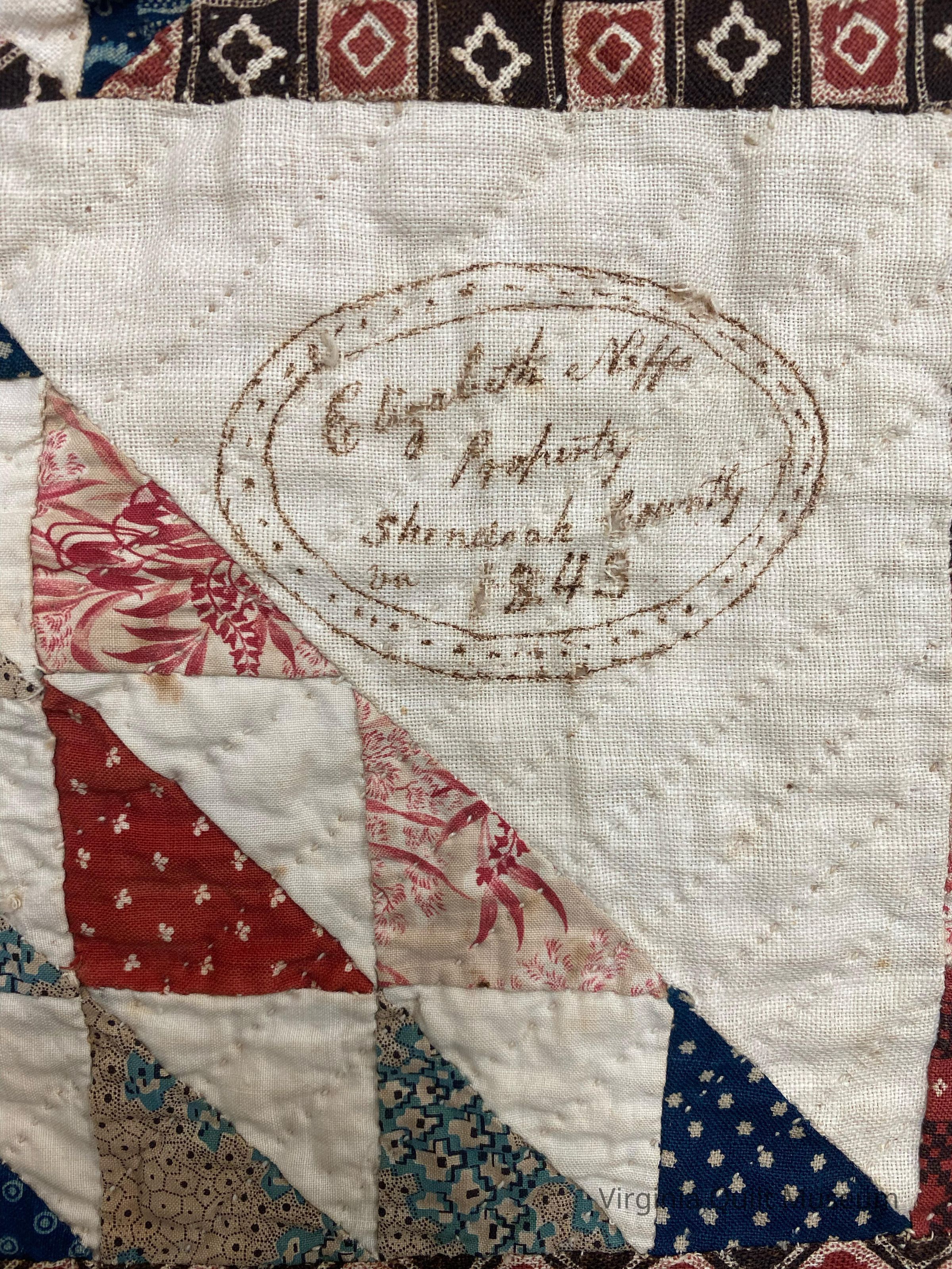 The Neff Quilt was done in the Shenandoah Valley in the 1840s and is signed by Elizabeth Neff Miller. It was passed through the Miller family until 2001 when it was given to a local antique shop. The quilt was purchased from the shop by a Californian quilt historian who had acquired the quilt while in Williamsburg, Virginia. Later, she and a Virginia Quilt Museum member discussed the possibly of the museum acquiring the quilt. The Virginia Quilt Museum, the Shenandoah County Historical Society, and the New Market Historical Society raised funds to bring the quilt to back the valley.